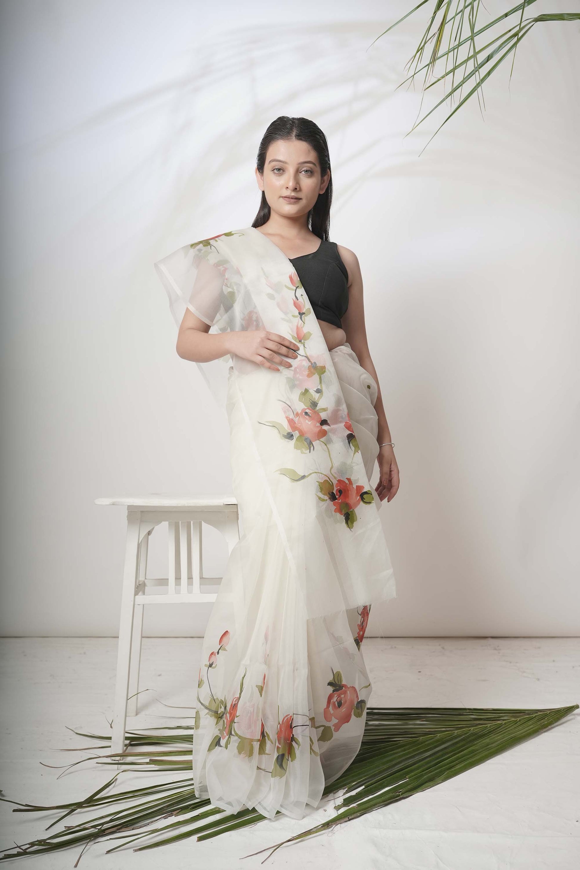 This exquisite saree is a masterpiece of artistry, crafted from luxurious white organza that shimmers with a delicate sheen. The canvas comes alive with a breathtaking display of handpainted roses, each bloom a cascade of color and texture. The vibrant hues dance against the pristine white, creating a stunning visual symphony.