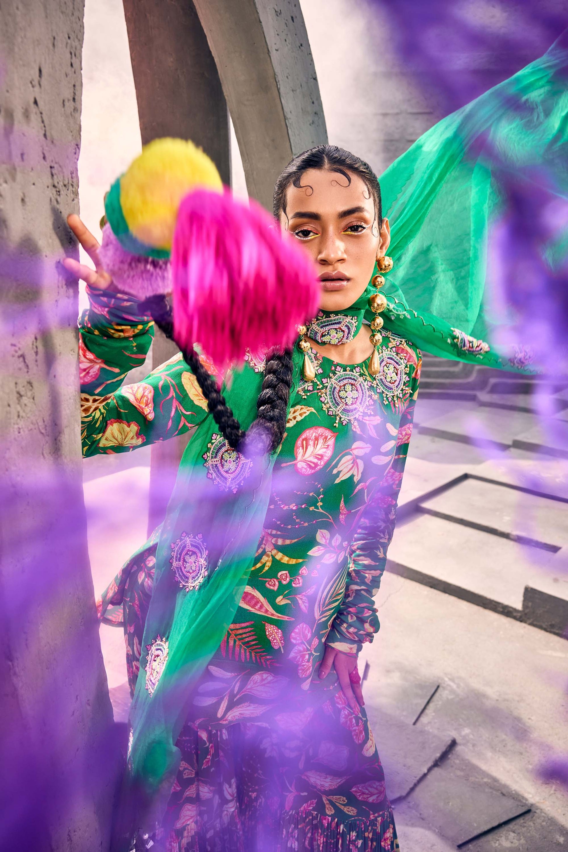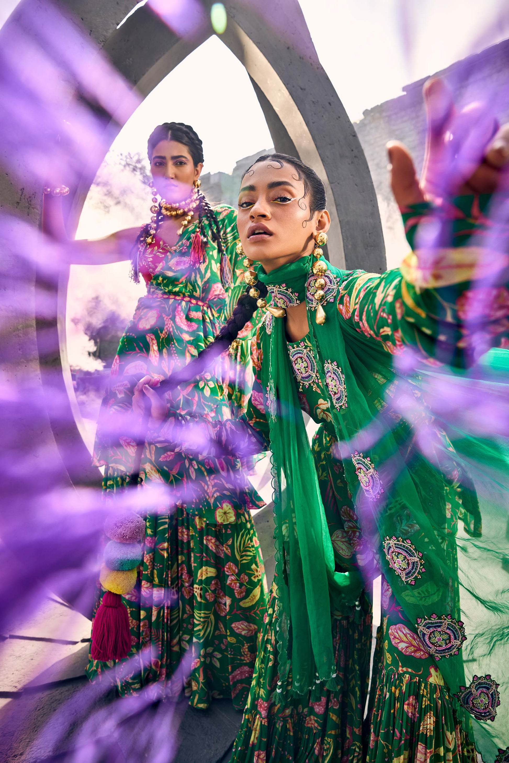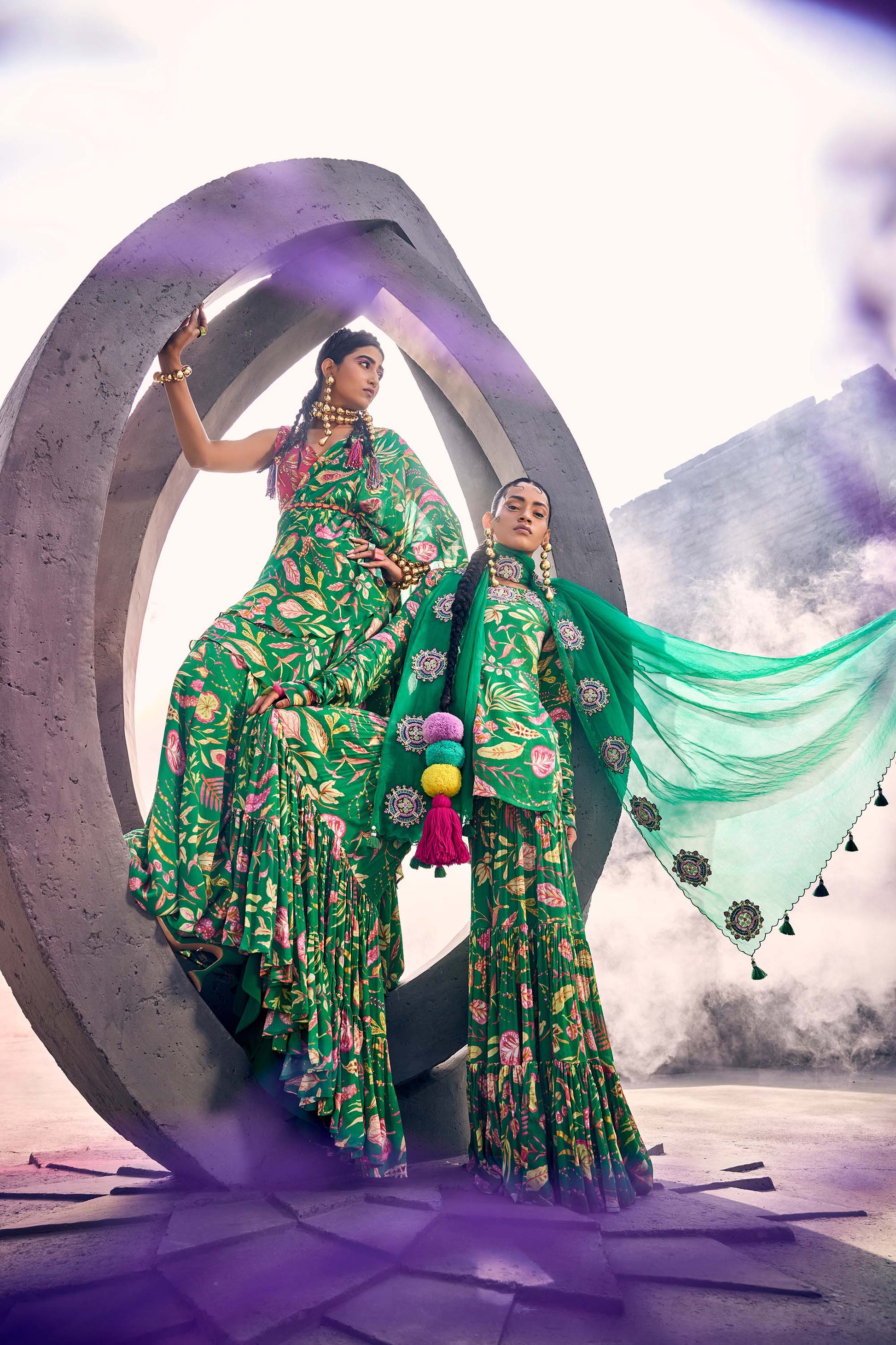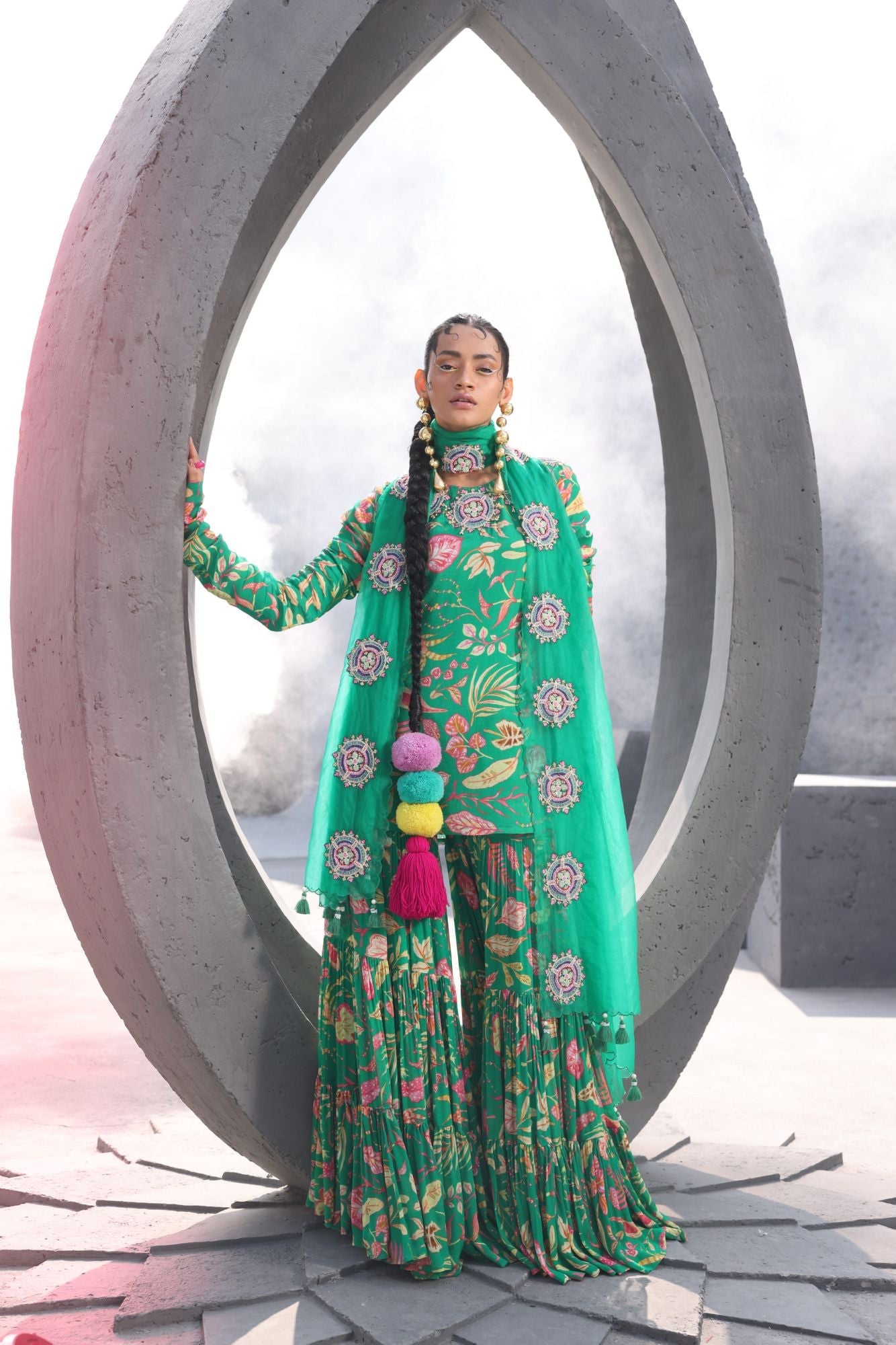 Pine Green color Kurti & Gharara Set with Patch Work Organza Dupatta