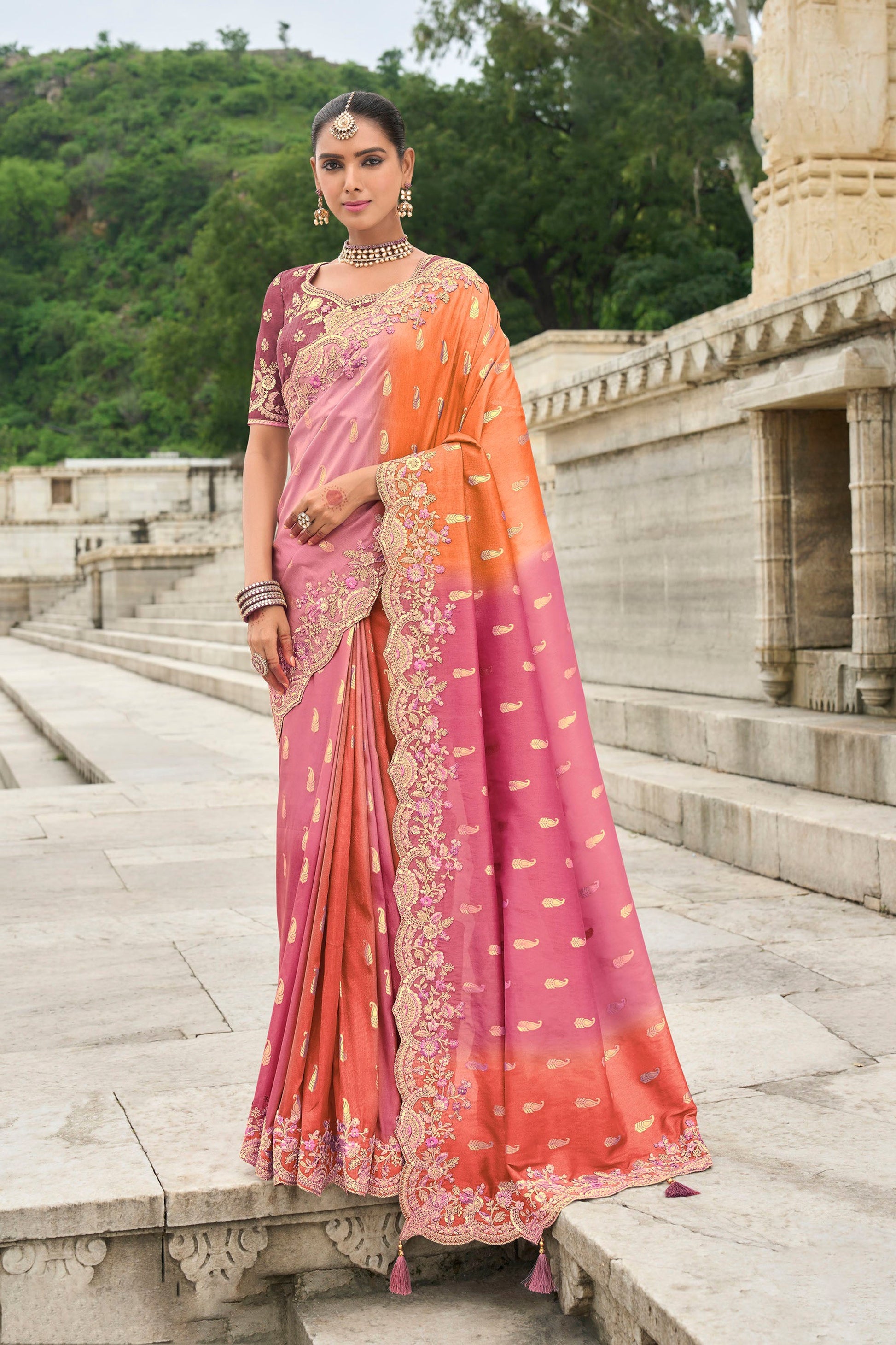 Pink and Orange Viscose Silk With Cut Work Wedding Saree