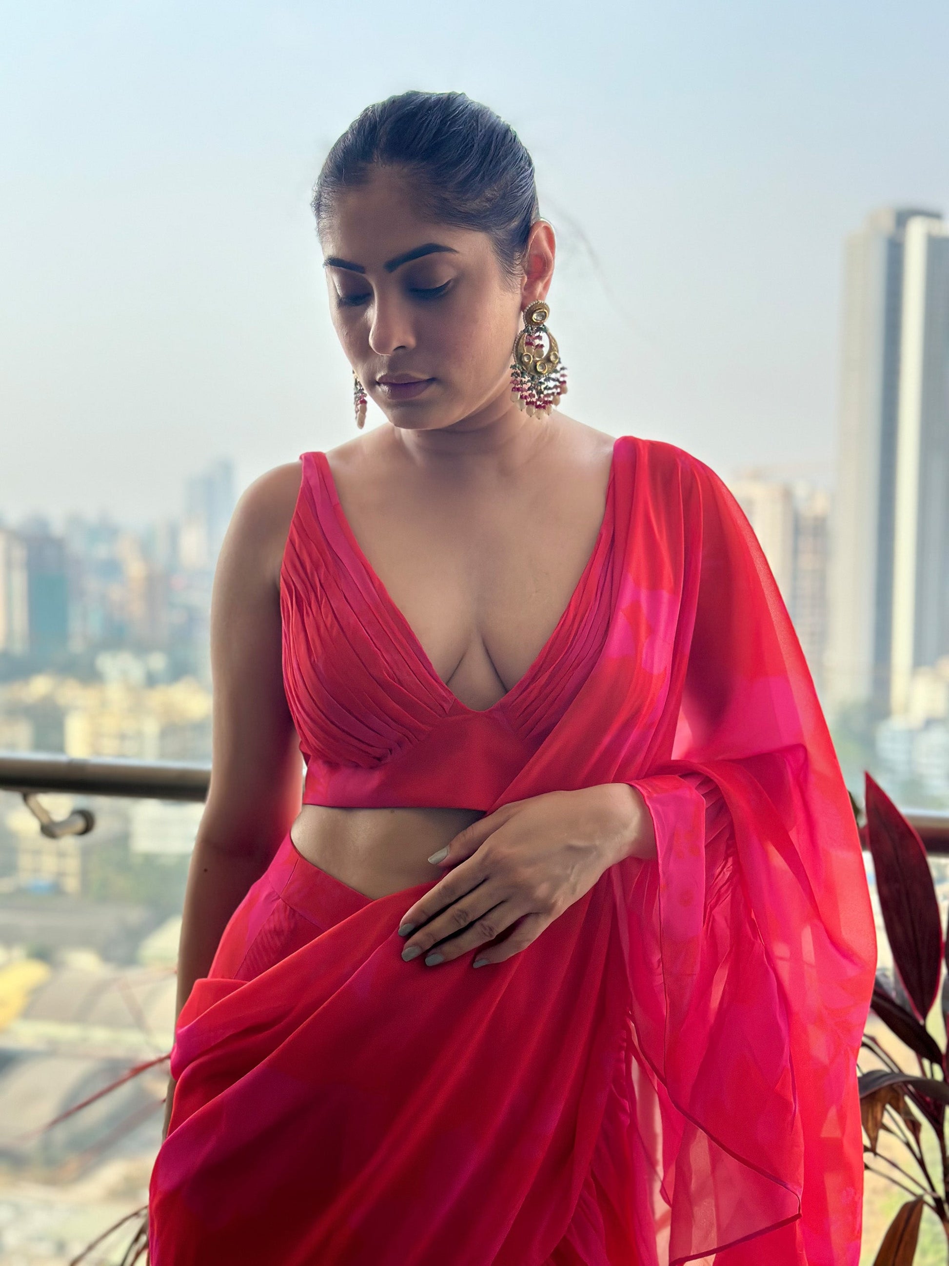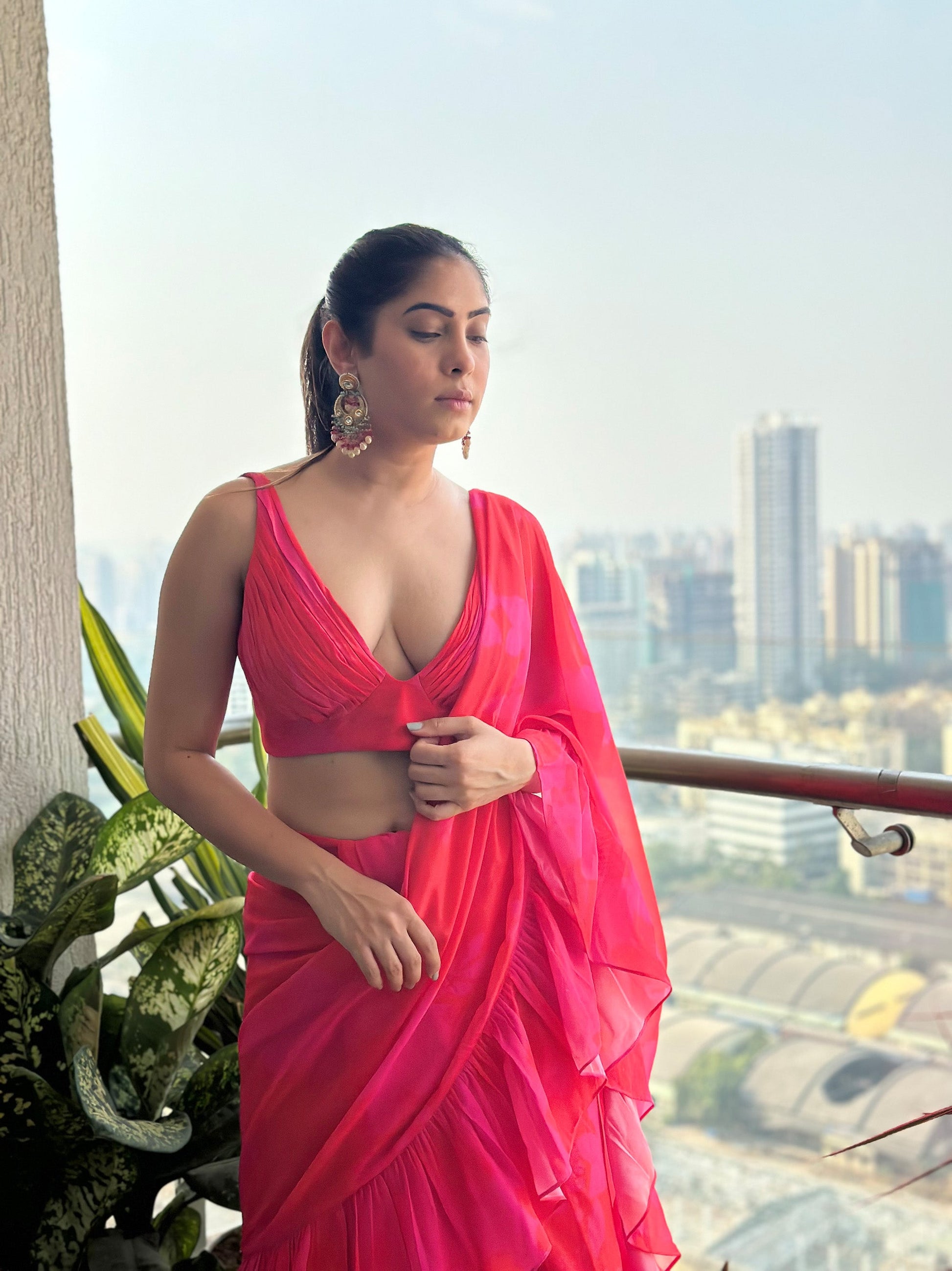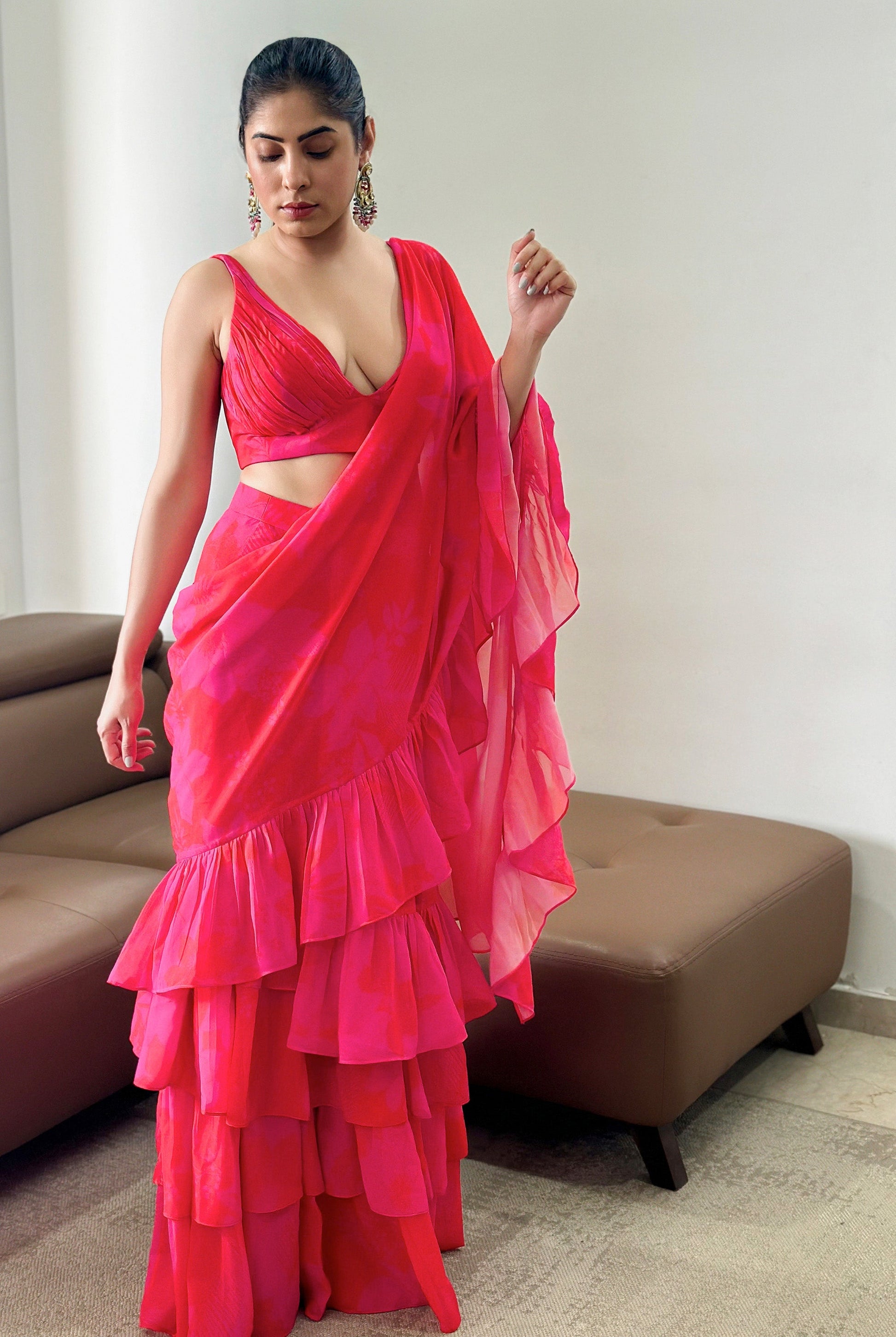 Pink/red printed ruched blouse with skirt and 3.5 mtrs long dupatta with ruffles which is draped like a sari.