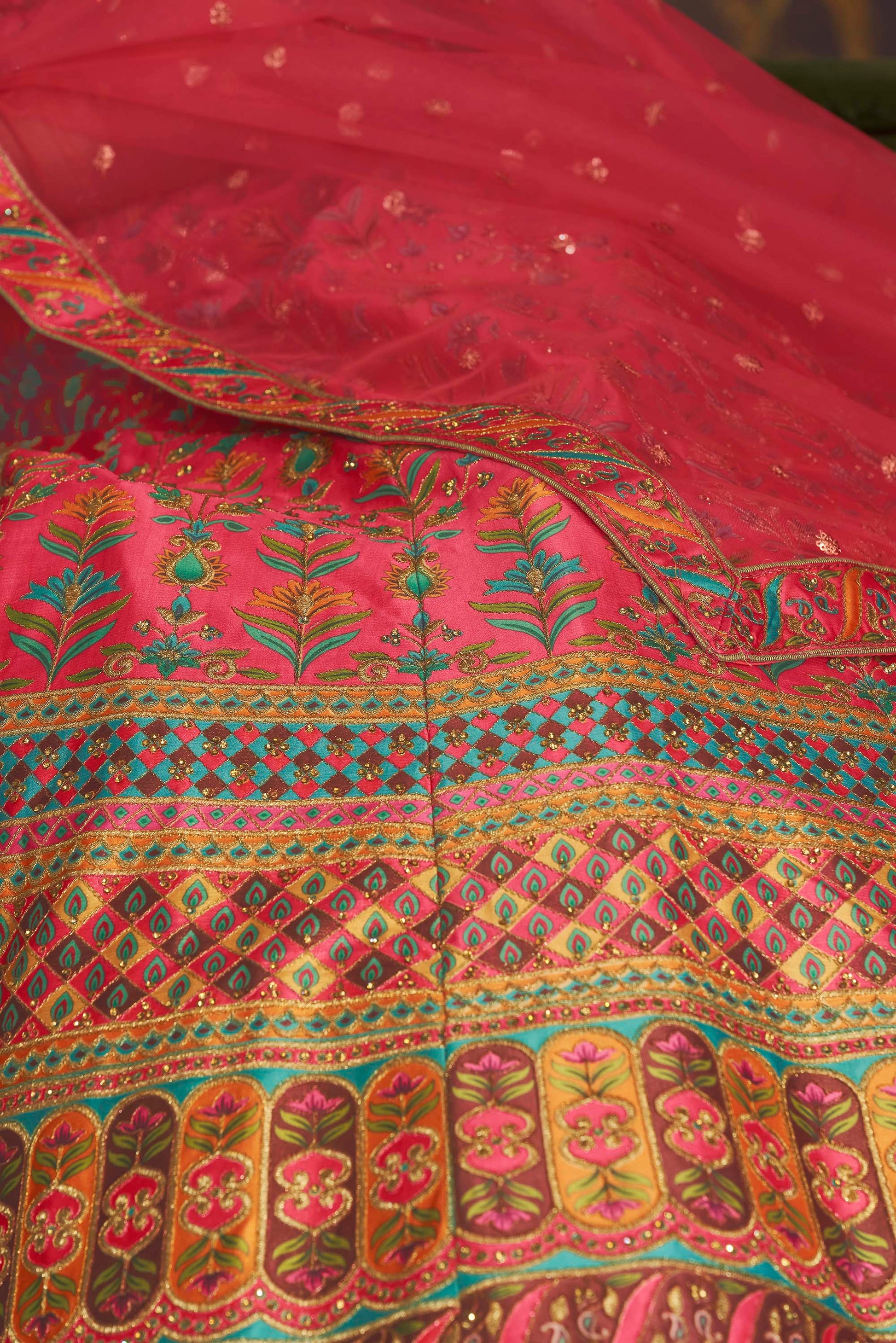 Rani pink lehenga comes with heavy embroidered with printed and diamond work art silk lehenga. Is tagged along with multi embroidered and diamond work art silk blouse and multi heavy embroidered soft net dupatta. Paired with art silk paneled style lehenga in punch pink color with carrot pink net dupatta. Paneled style lehenga has print, zari, and stonework. Dupatta accentuated with lace and sequins work.