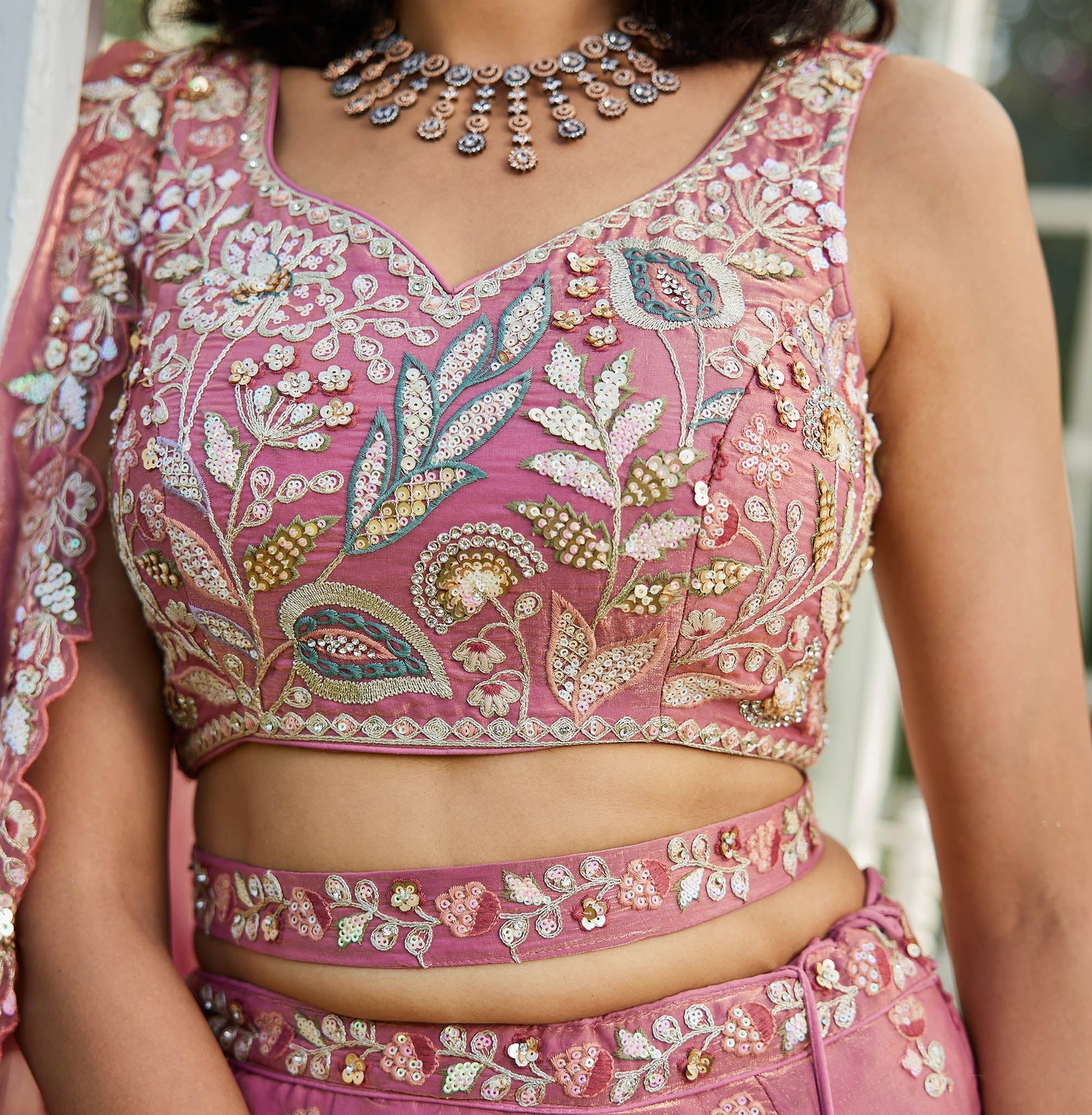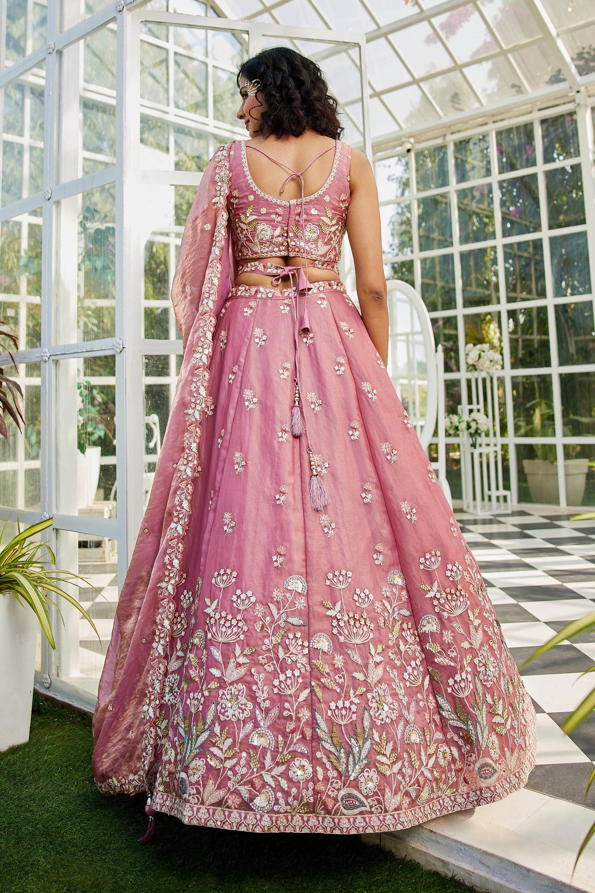• Lehenga:- Made of premium quality Rose gold Colour Organza fabric Full Flaire stitched Lehenga With sequins work and Coding thread Embroidery work. Has a Sequins and thread cut work border on the hemline.