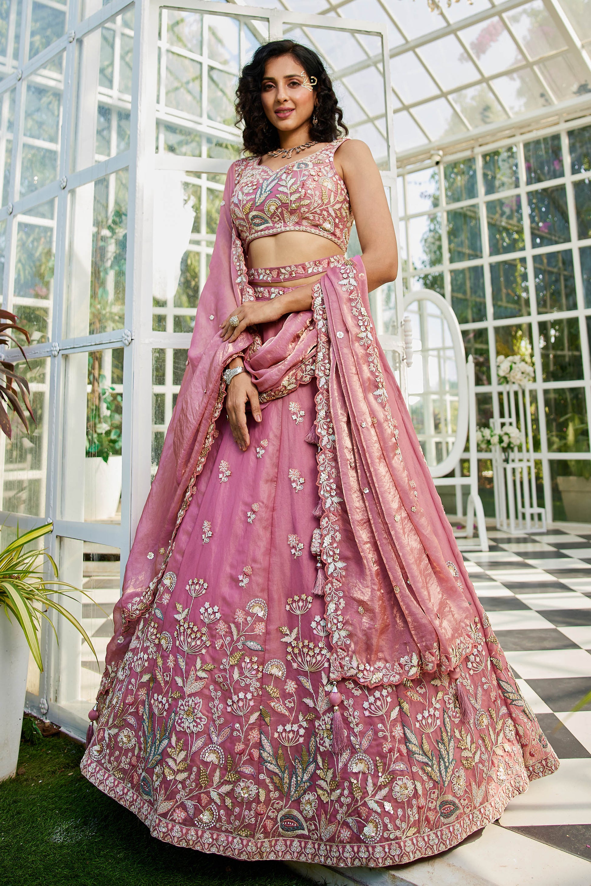 Pink colour Tissue Fabric with Sequinse & Thread embroidery Lehenga choli & Dupatta