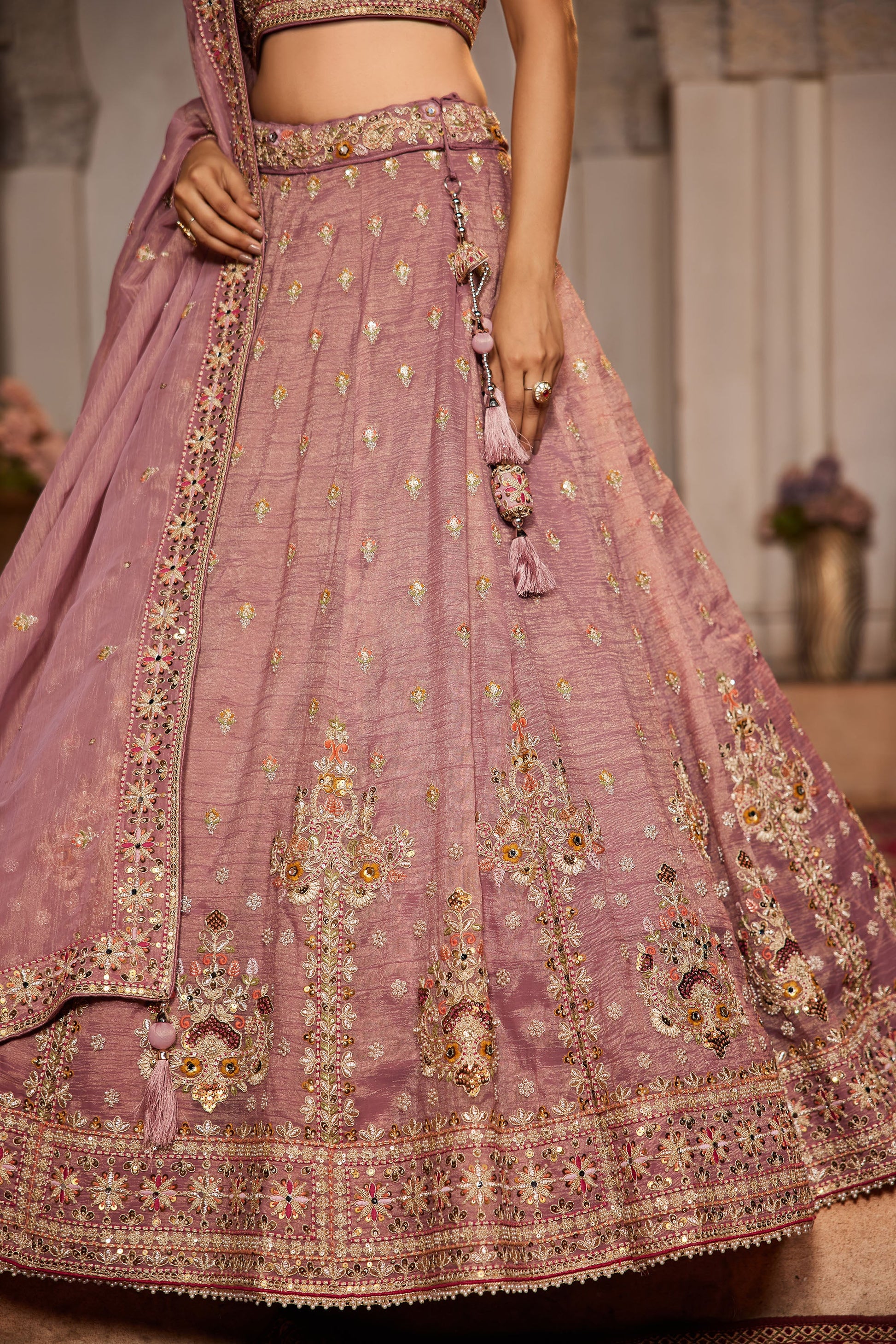 • Lehenga:- Made of premium quality Pink Colour Tissue fabric Full Flaire Lehenga With Moti, Sequins and Coding work has a thread Embroidery work. Has a thread work border on the hemline.