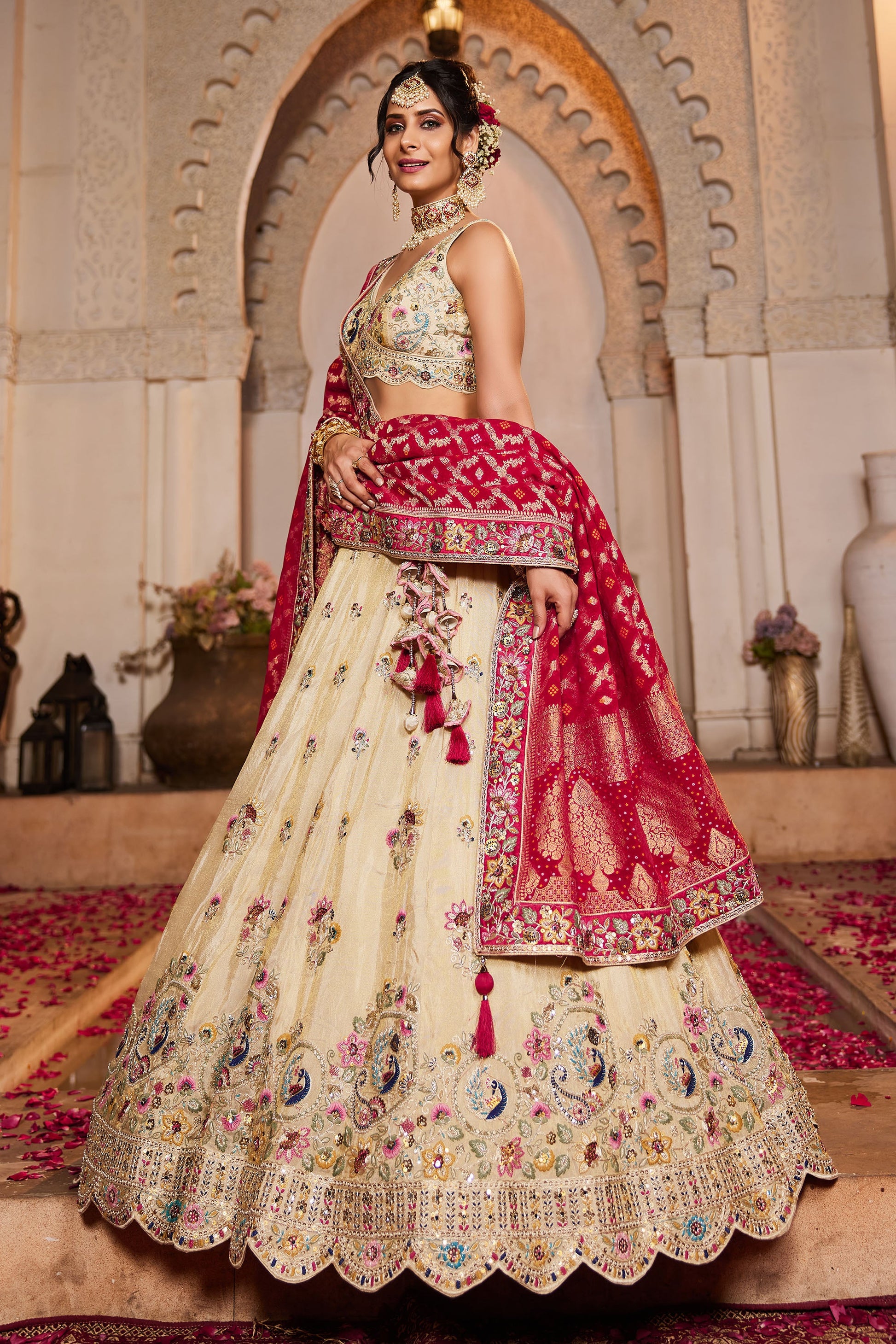 • Lehenga:- Made of premium quality Cream Colour Tissue fabric Full Flaire Lehenga With Moti, Sequins and Coding work has a thread Embroidery work. Has a thread work border on the hemline.