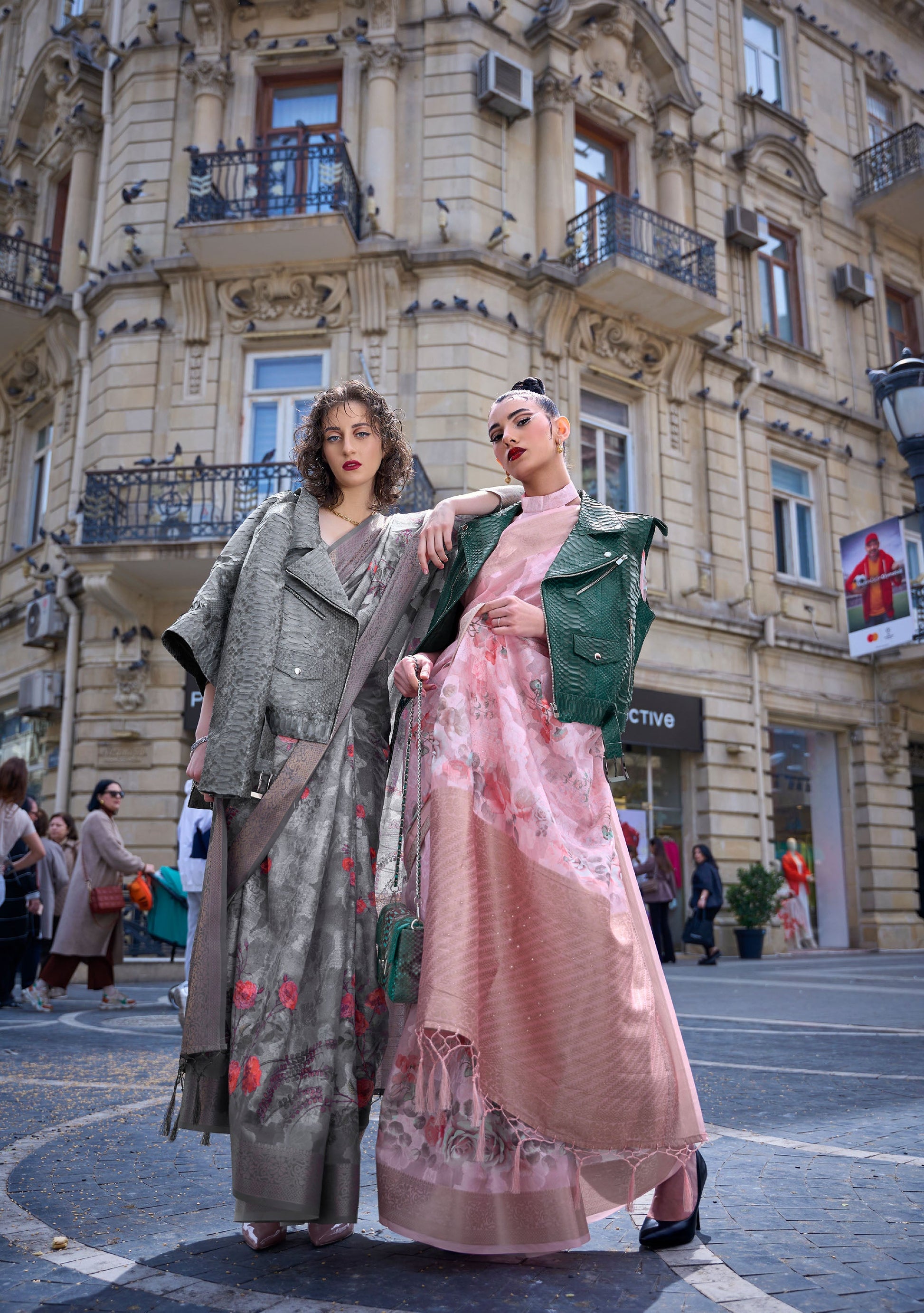 Pink Floral Kinsel Printed Poly Handloom Saree