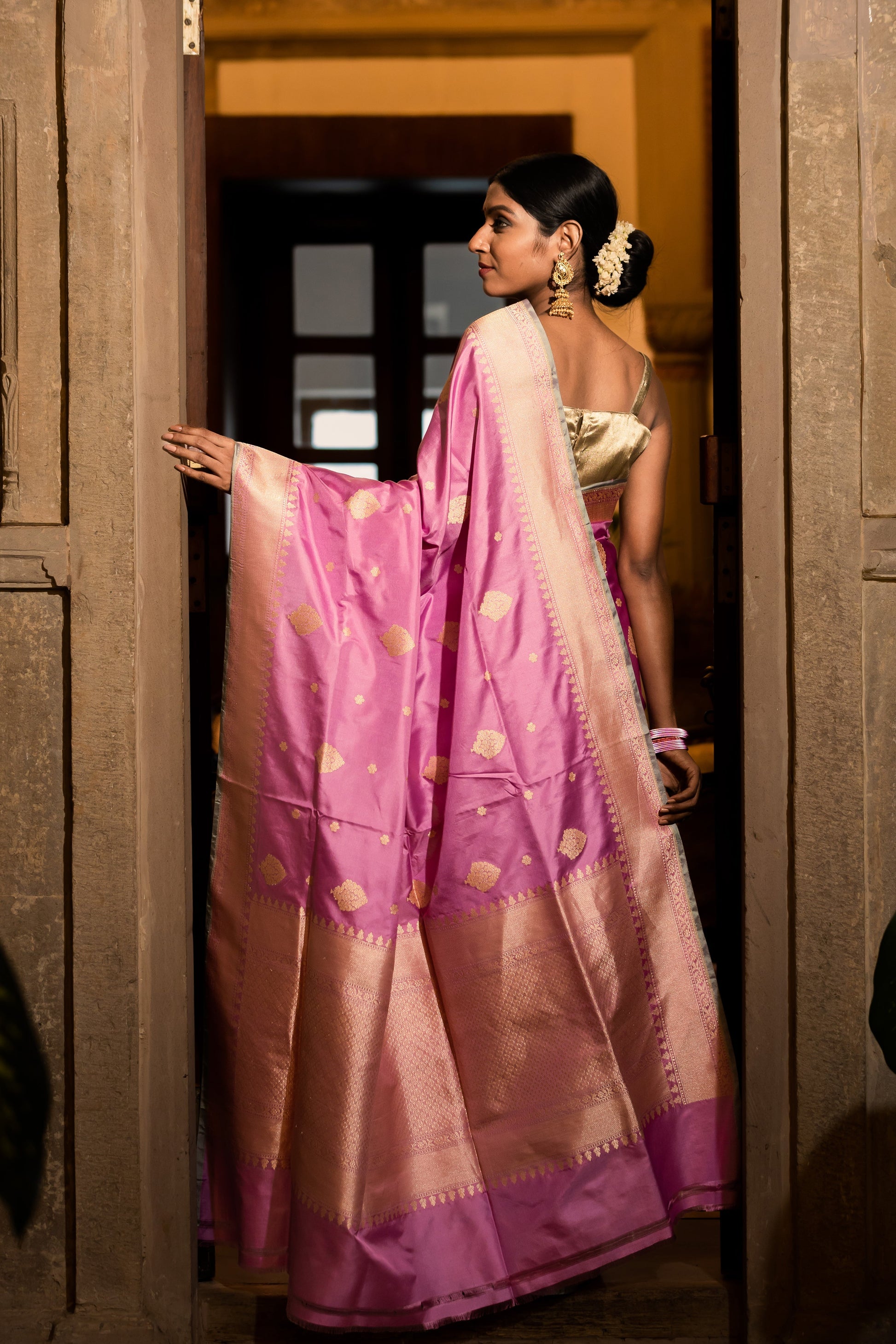 Product Description: Enhance your style with the Pink Handwoven Kadwa Katan Pure Silk Saree, a tribute to the timeless traditions of Banaras. This saree features a classic Boota design with small Booti in gold zari, showcasing the artistry of handloom Banarasi weaving. With a saree length of 5.50 meters for the body and an additional 0.90 meters for the blouse, it's a symbol of timeless elegance and sustainable fashion.