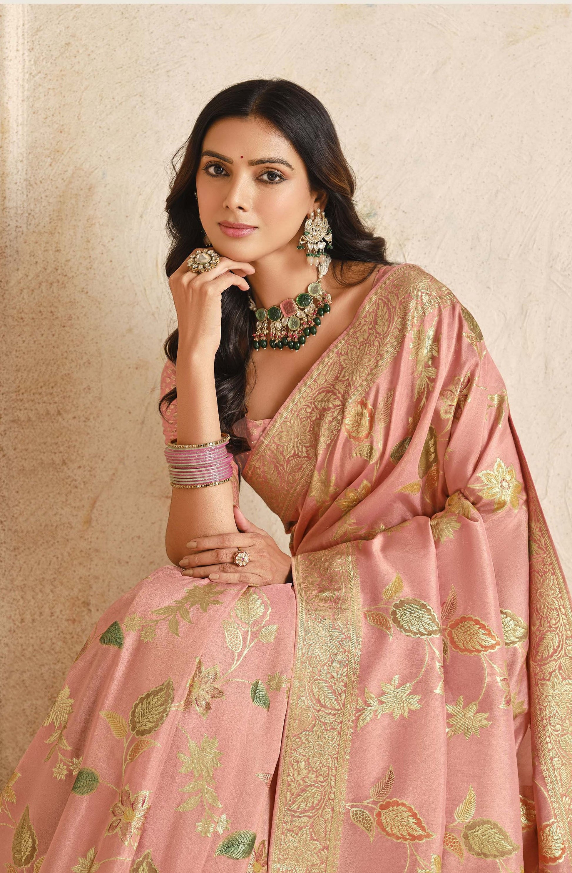 Does your wardrobe need more versatility? Then, check out this . Let you feel the refreshing touch as you adorn this superior-quality Pink Jacquard Silk With Zari Woven Saree to match the overall modest design. If you're yearning to make a fashion statement in your outfit, pick this sequence embroidery design for any occasion, such as wedding receptions, engagement parties, and sangeets. A wedding Guest would look gorgeous in this Pink Jacquard Silk With Zari Woven Saree . Don't wait. Just go ahead and order.