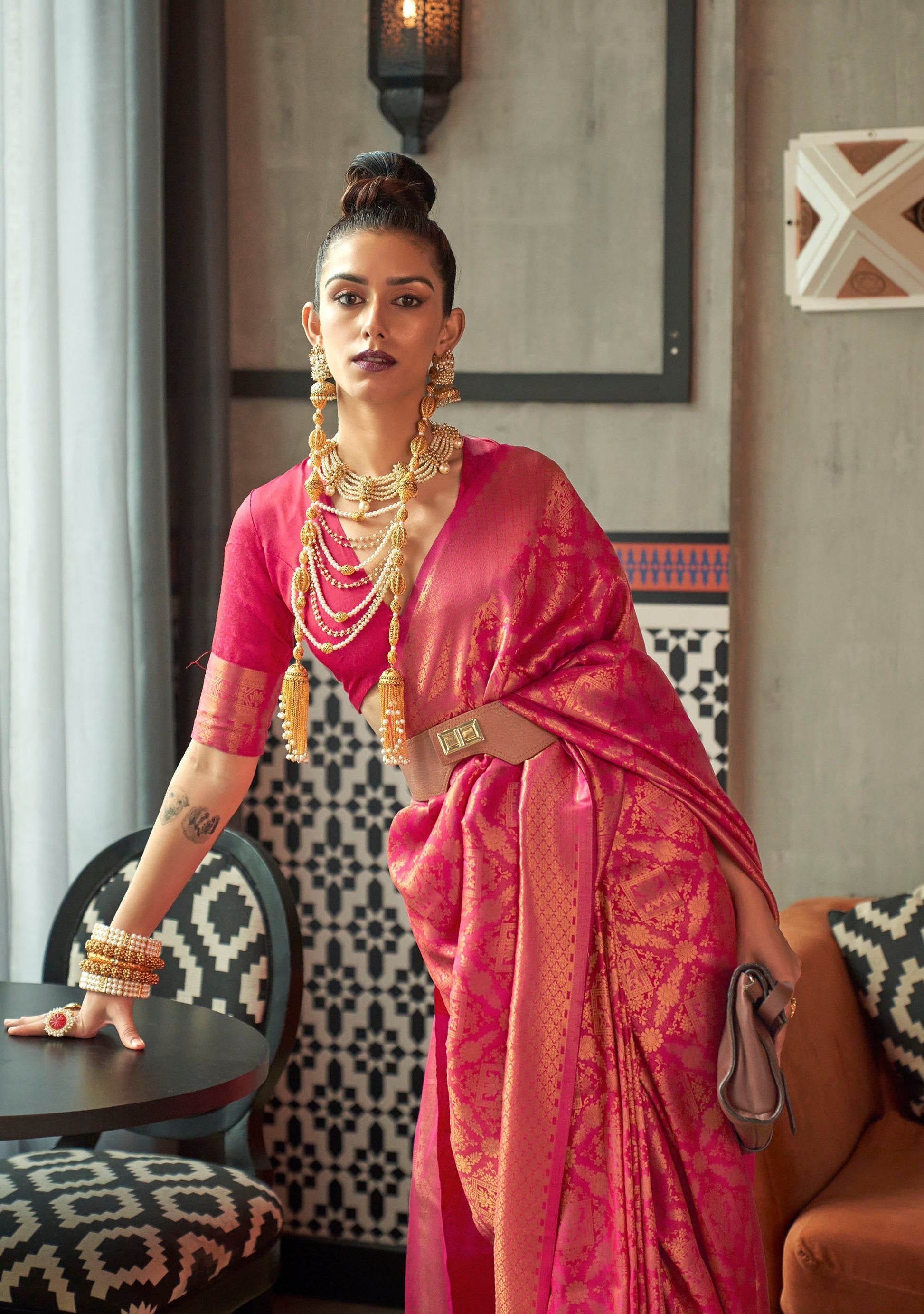 Looking for something a little out of the ordinary? We've got just the thing! This Pink Kanjivaram Silk Saree is perfect for those who want to make a statement. A wedding guest would look gorgeous in this outfit. It is suitable for any occasion, such as wedding receptions, engagement parties, and sangeets. So don't wait any longer, add this Pink Kanjivaram Silk Saree to your wardrobe today!