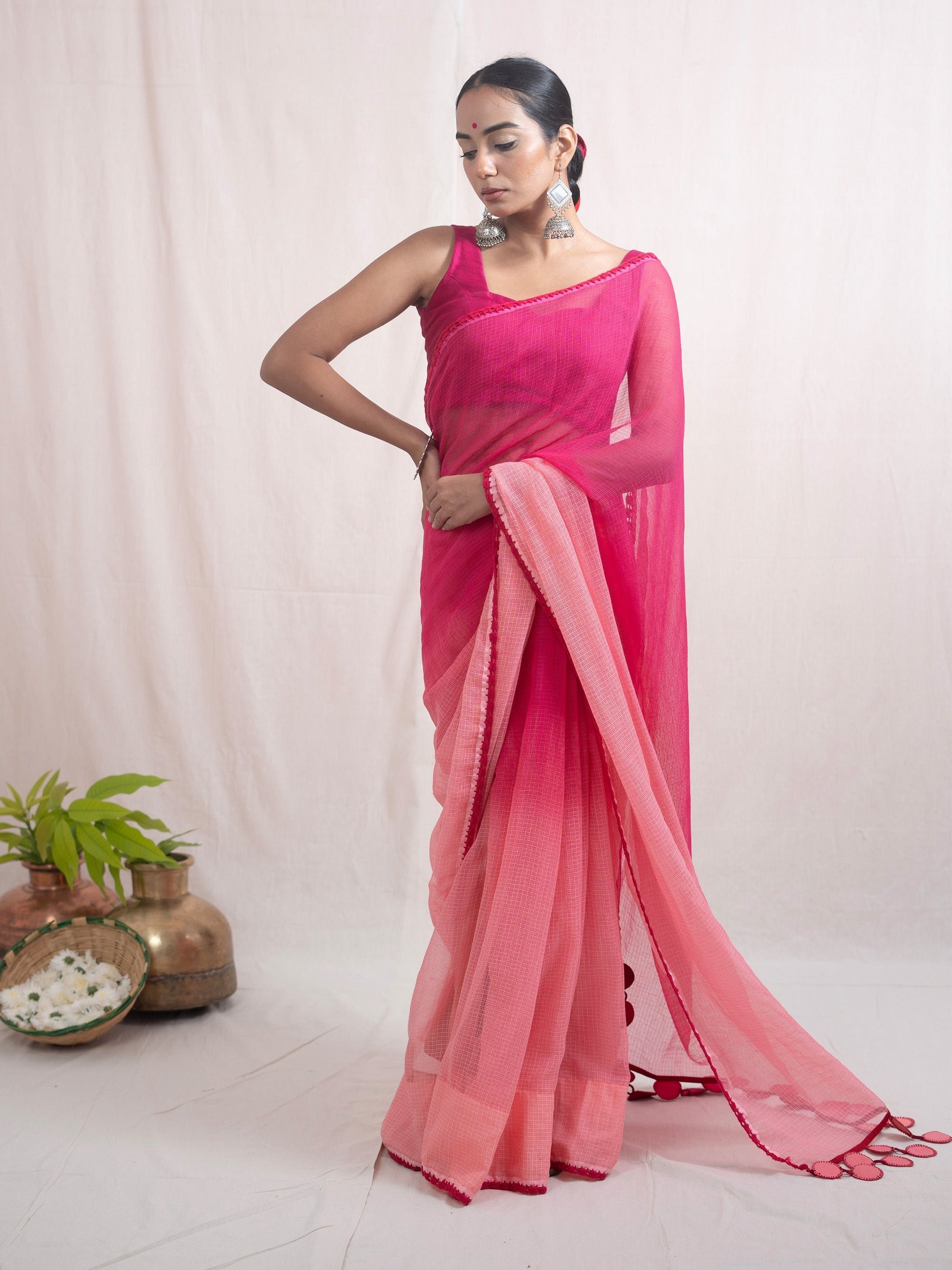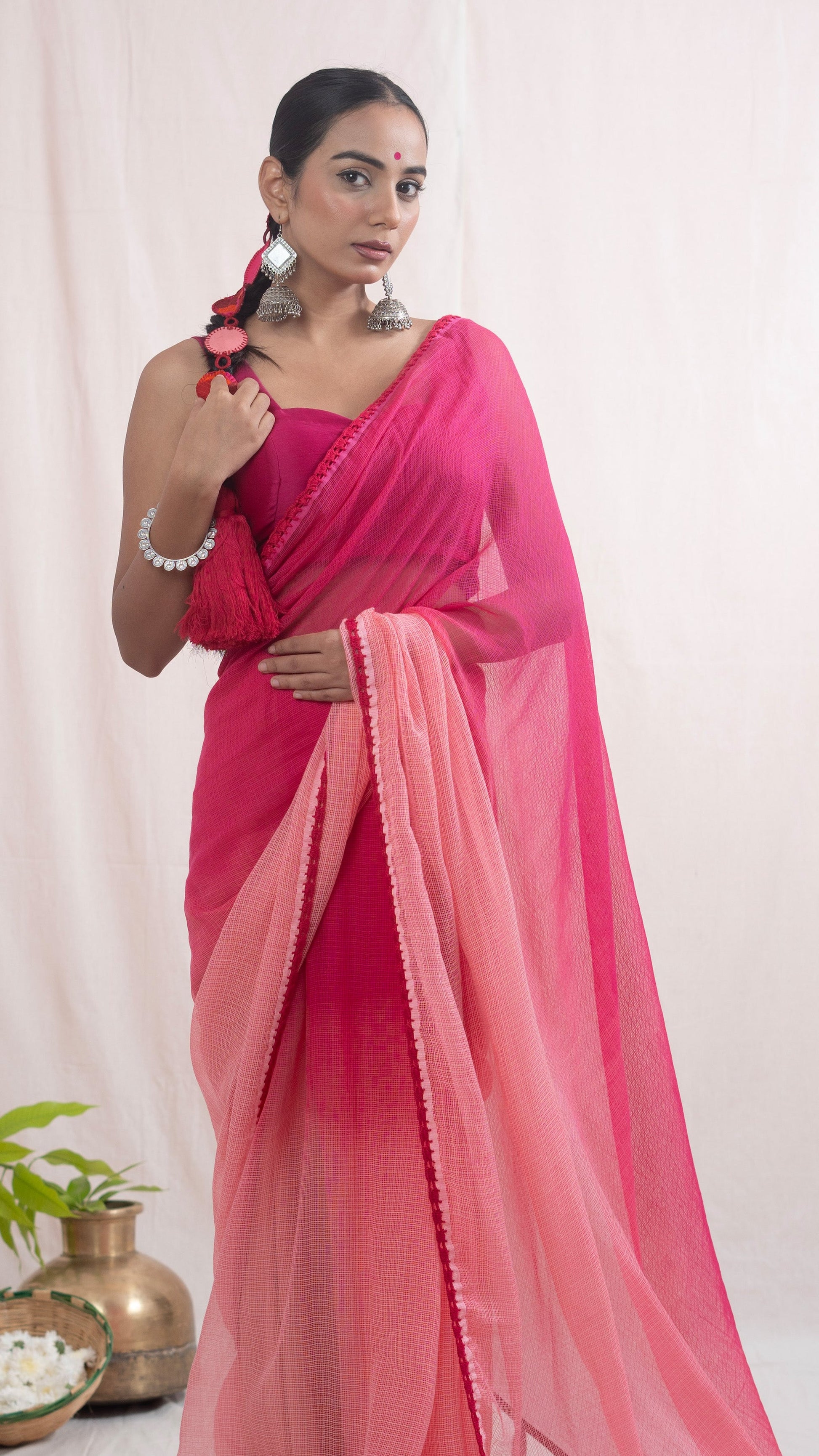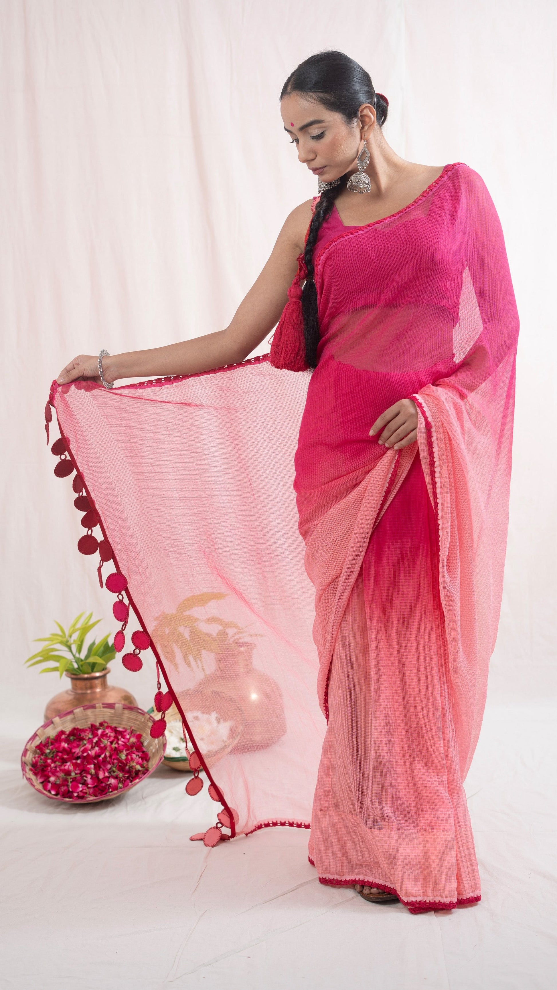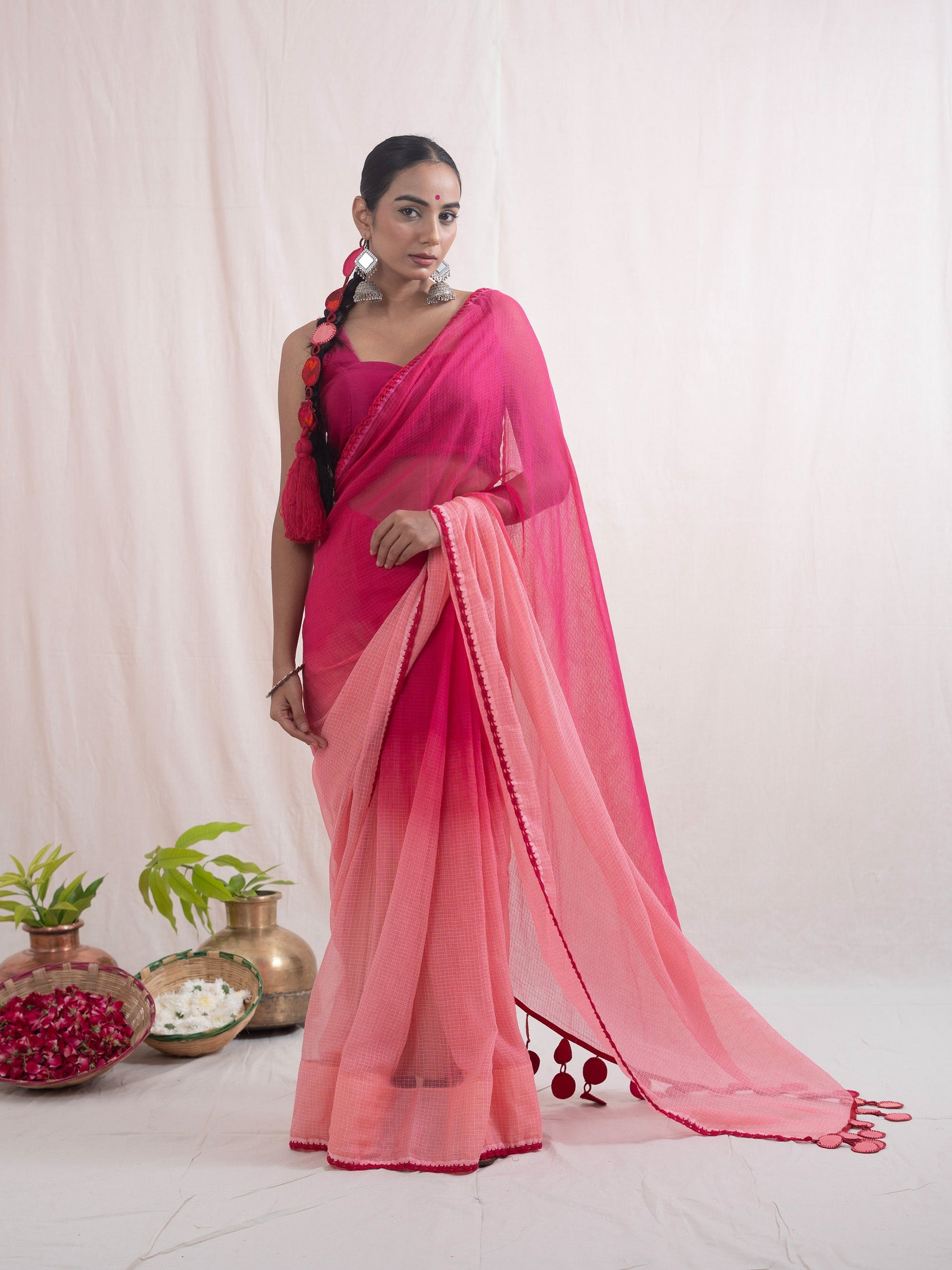 Step into a world of elegance with our Pink मल्लिका Saree, a true embodiment of grace and sophistication. Made from sheer Kota Cotton with a distinctive checkered weave, this saree offers both breathability and a delicate texture.