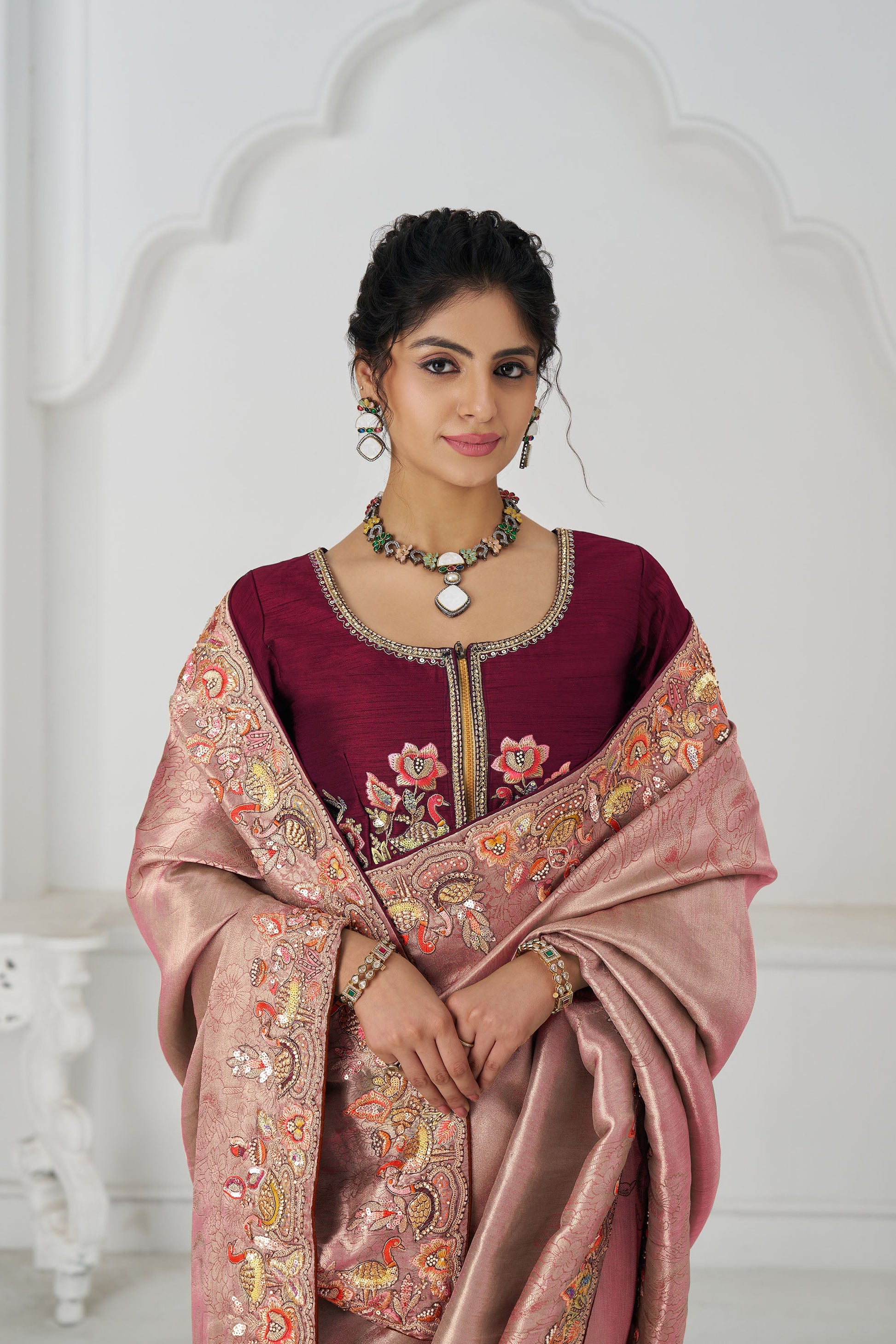 A stunning pink saree featuring intricate multi-thread embroidery with shimmering sequins and delicate beadwork, beautifully highlighted by graceful bird motifs. Perfect for adding a touch of charm and elegance to any festive or Mehendi function