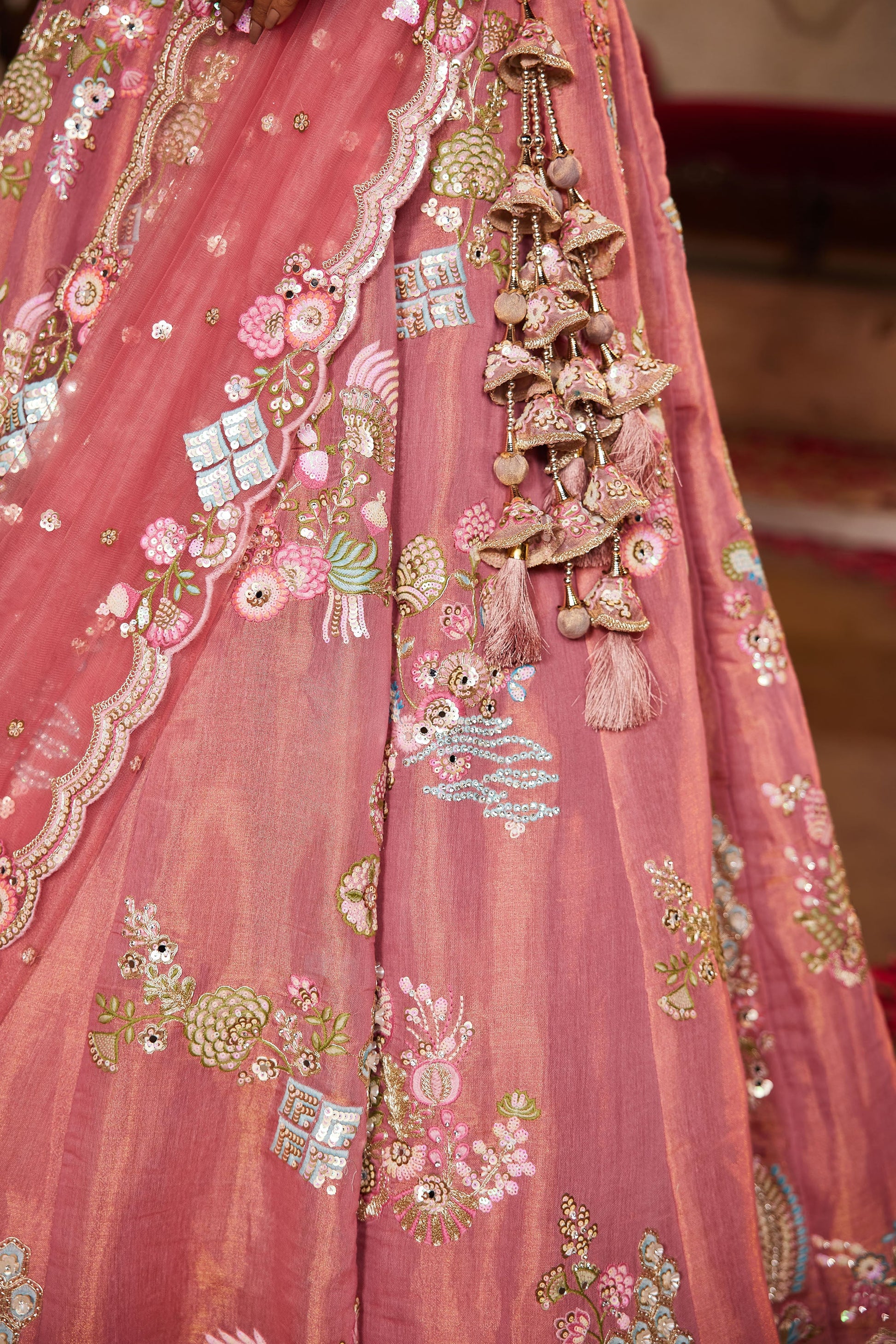 • Lehenga:- Made of premium quality Pink Bridel net fabric Full Flaire Lehenga With Zarkans, Sequins and Coding work has a thread Embroidery work. Has a thread work border on the hemline.