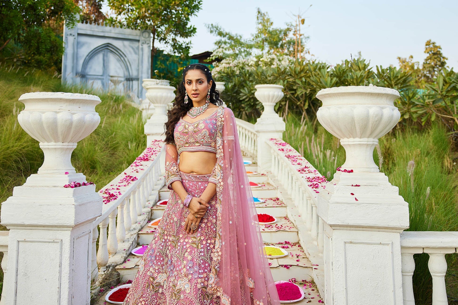 Pink net with Coding & Zarkan embroidery Lehenga choli & Dupatta