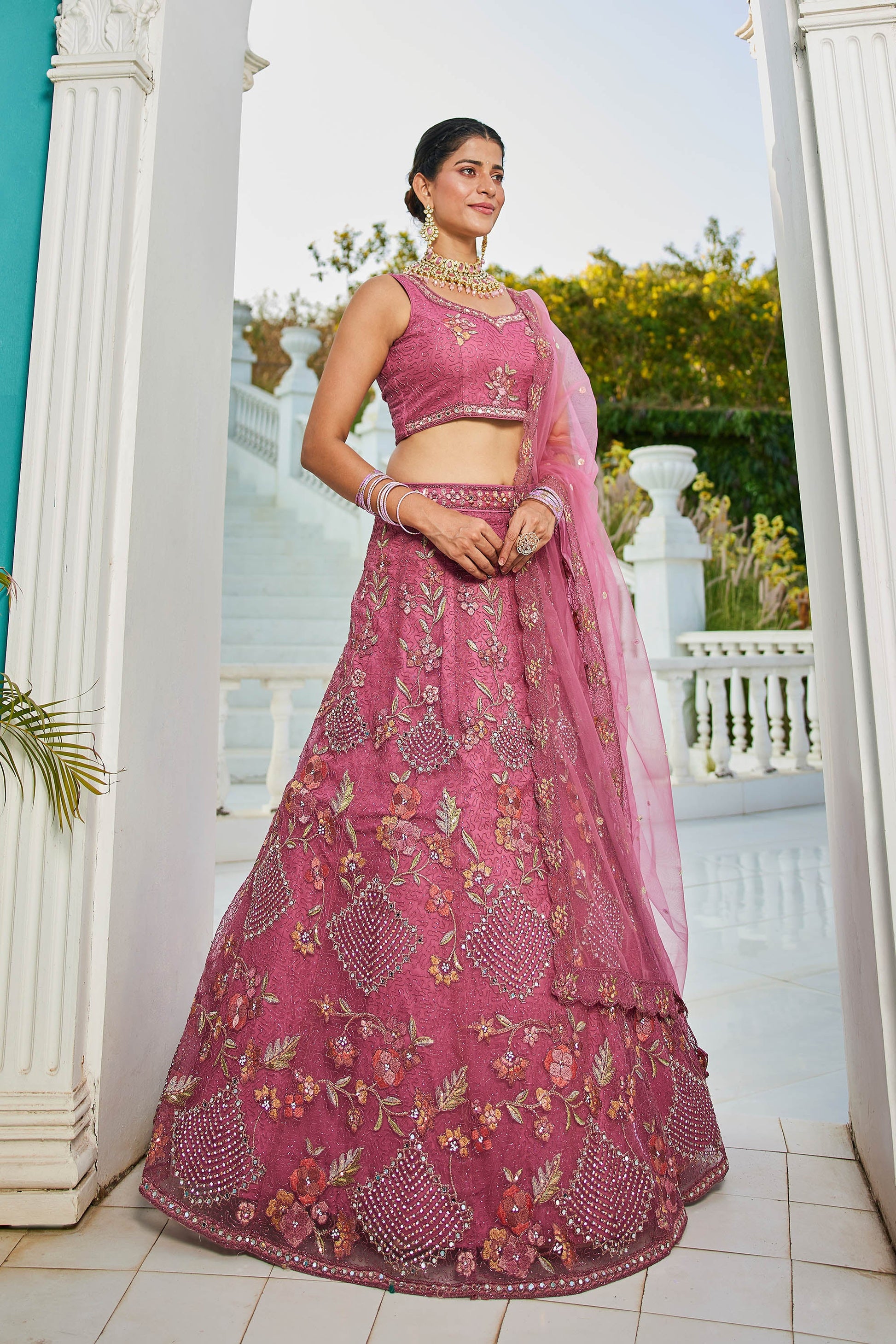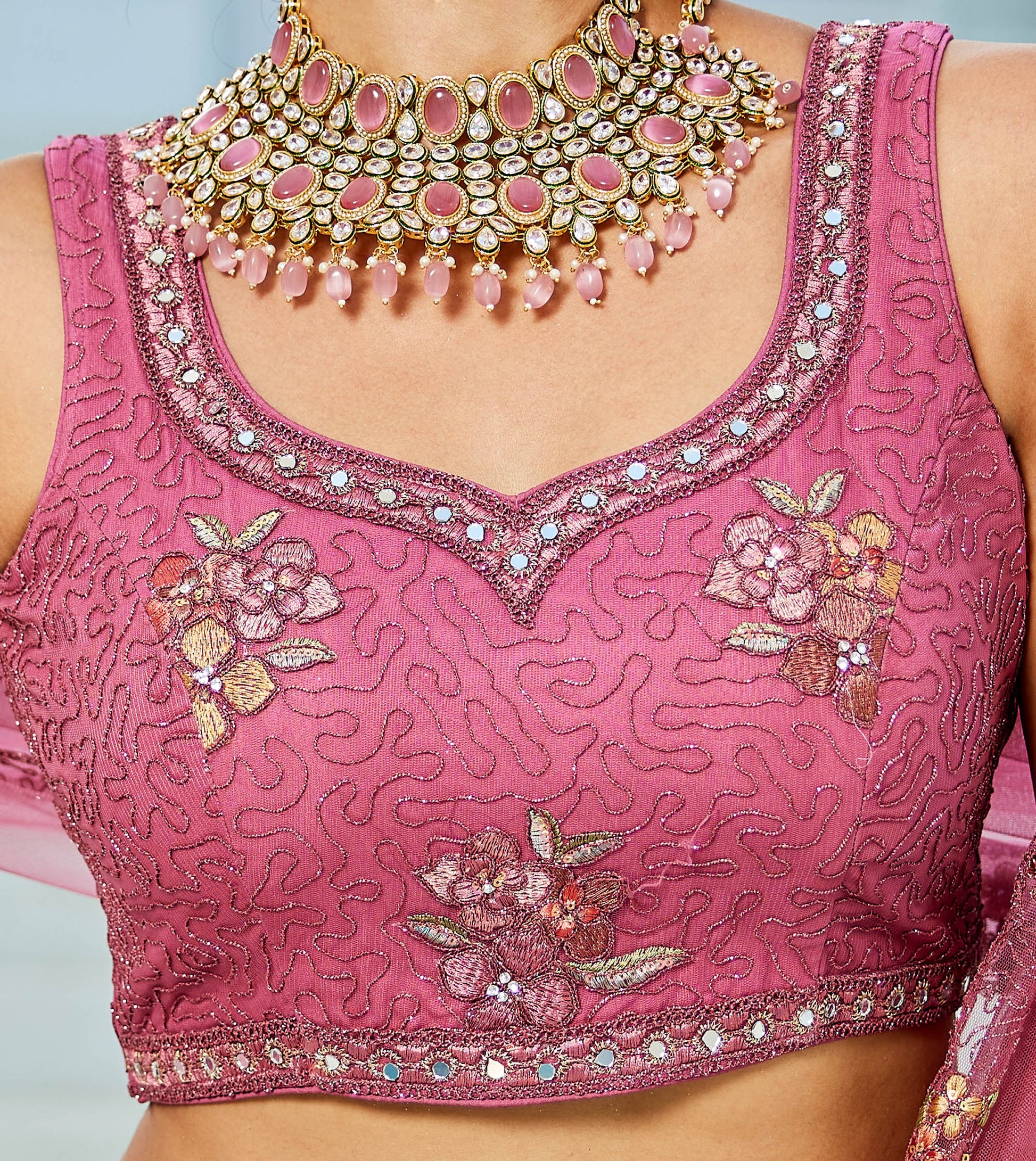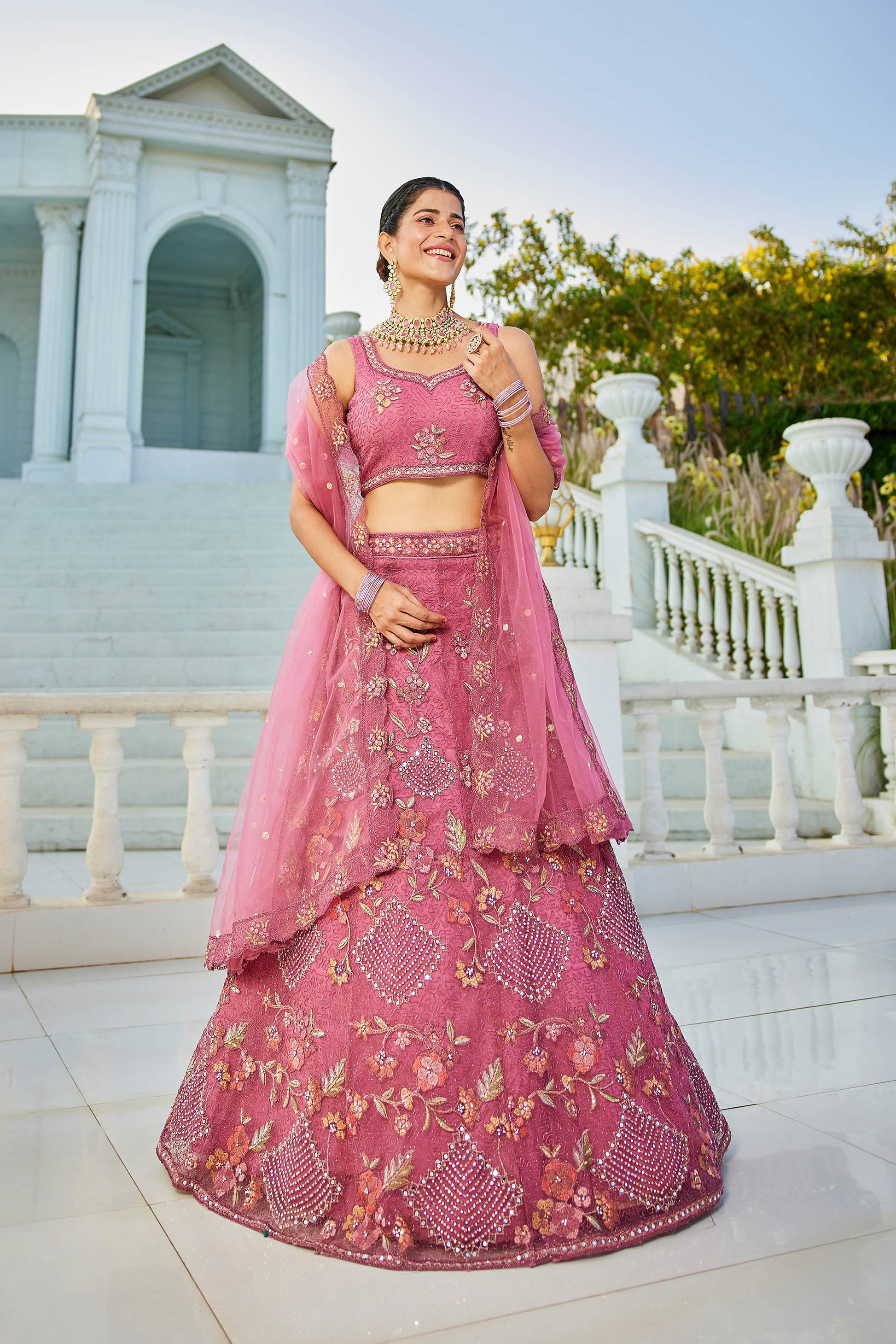 Pink net with Coding & Zarkan embroidery Lehenga choli & Dupatta