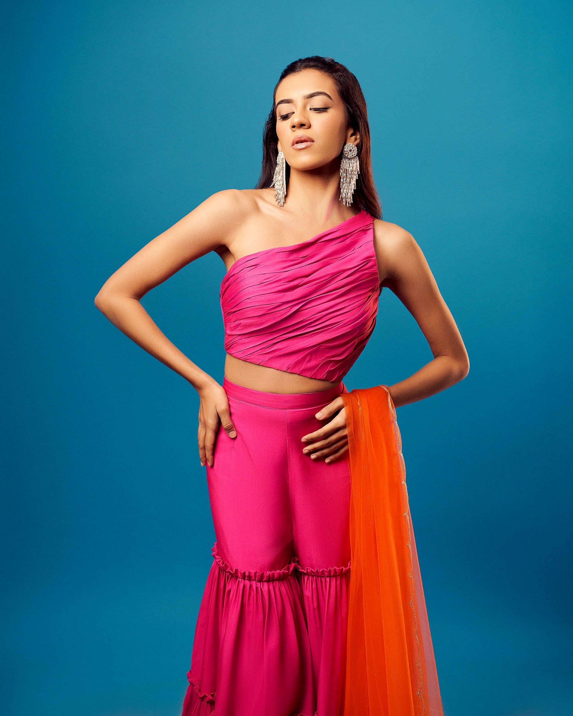Pink ruching one shoulder blouse with matching shaded pink-orange tiered sharara with orange scallop embroidered net dupatta.