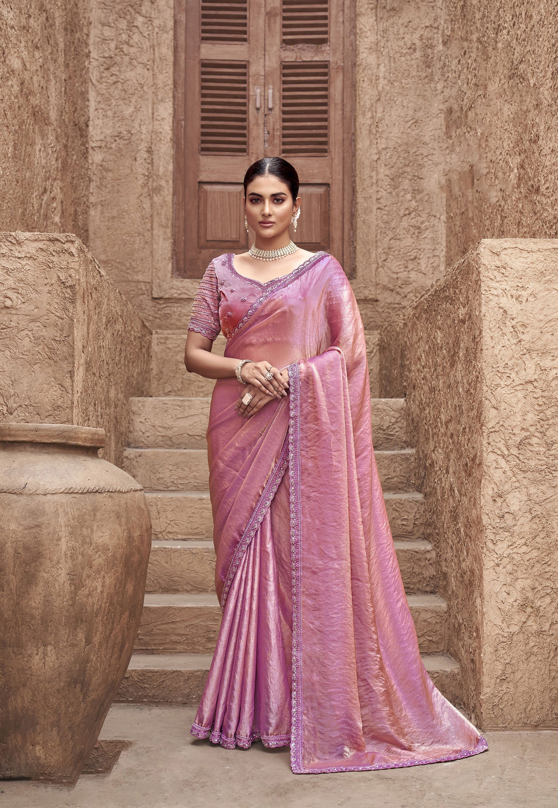 Pink Satin Silk Hand Embroidery Party Wear Saree