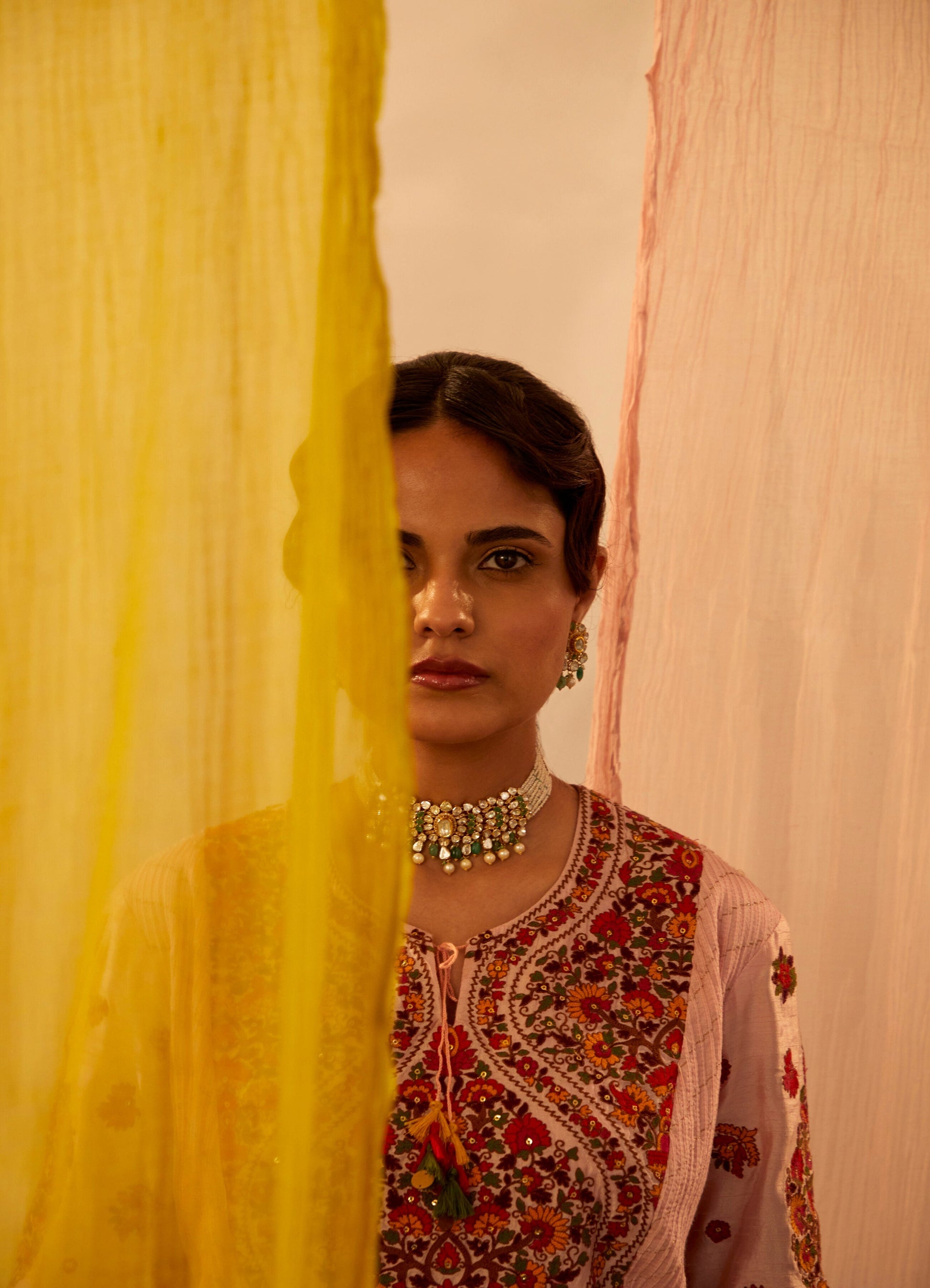 Blush pink kurta with pintucked details, floral pattern, multi color thread, sequin, zari & bead Kashmiri embroidery. Paired with gold polka dot pattern sharara & crinkled dupatta.