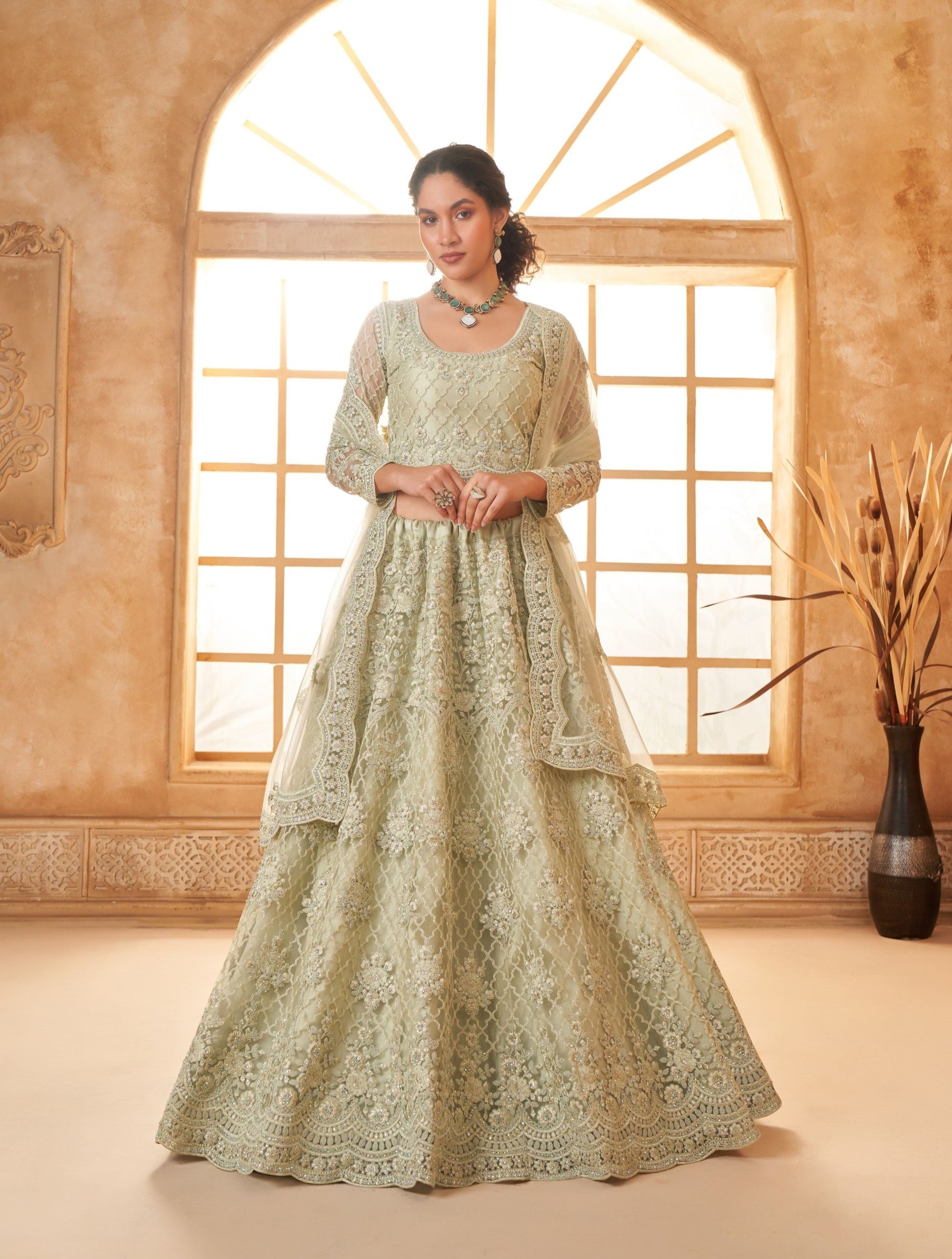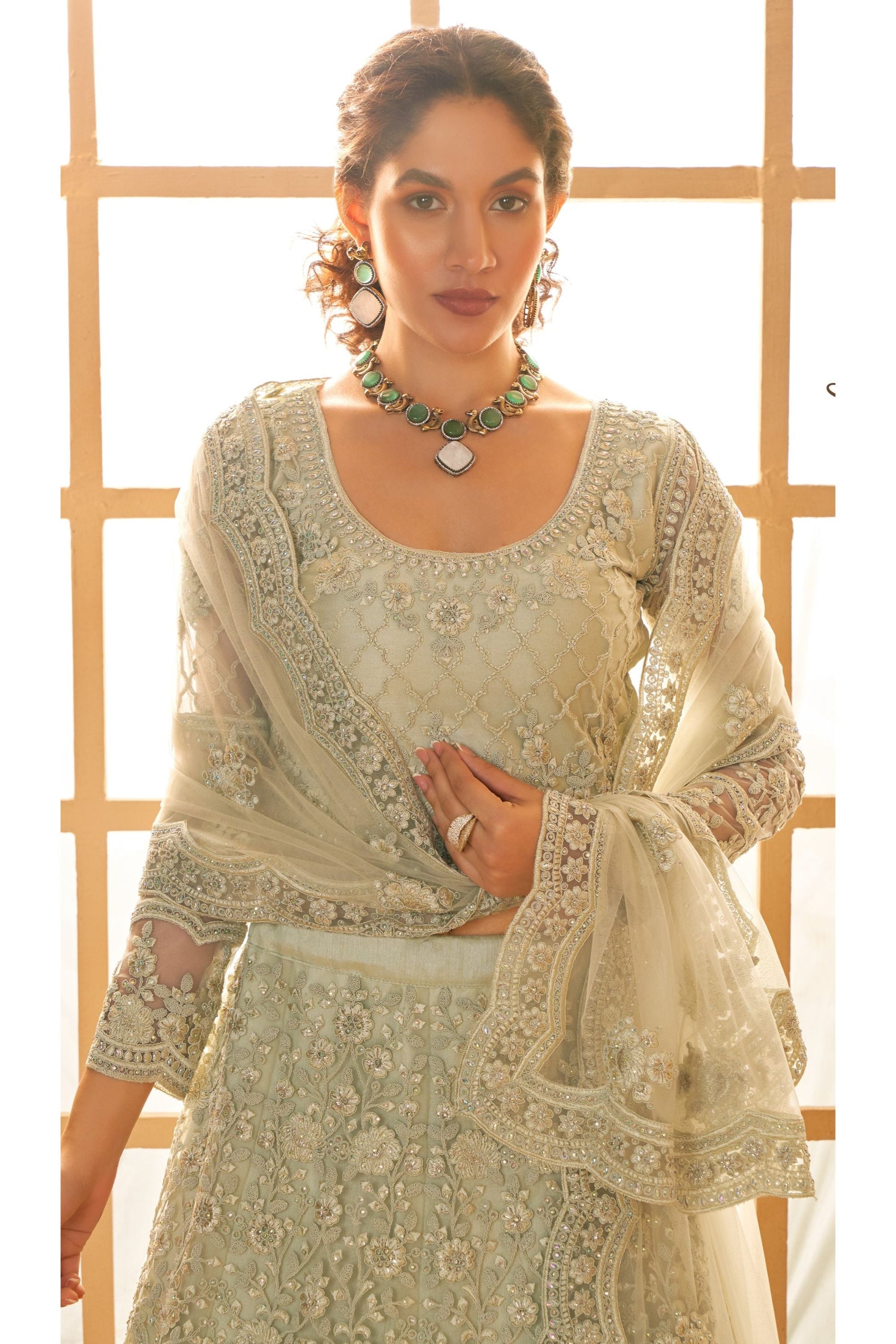 Pista Green Heavy Cording Embroidered Net Reception Lehenga Choli