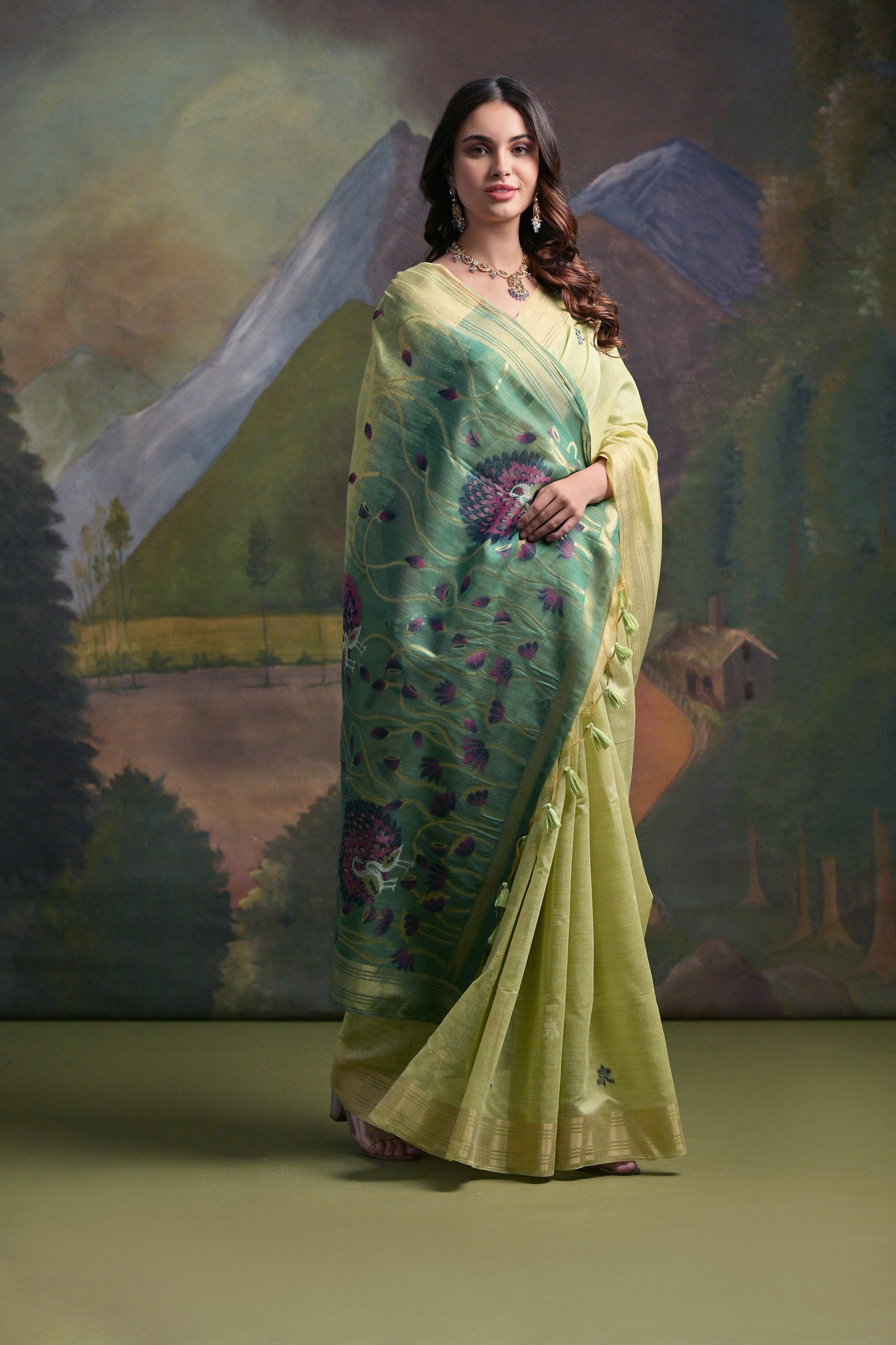 Pista Green Muga Cotton Peacock embroidered Handloom saree