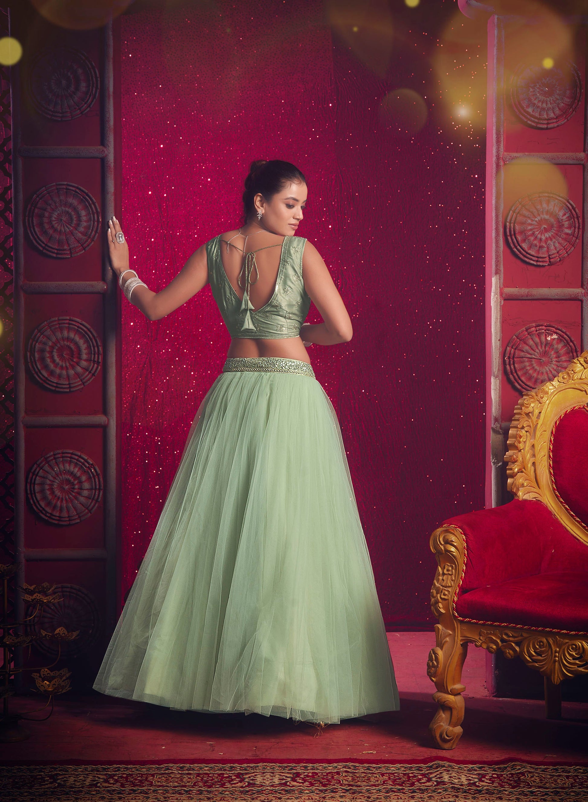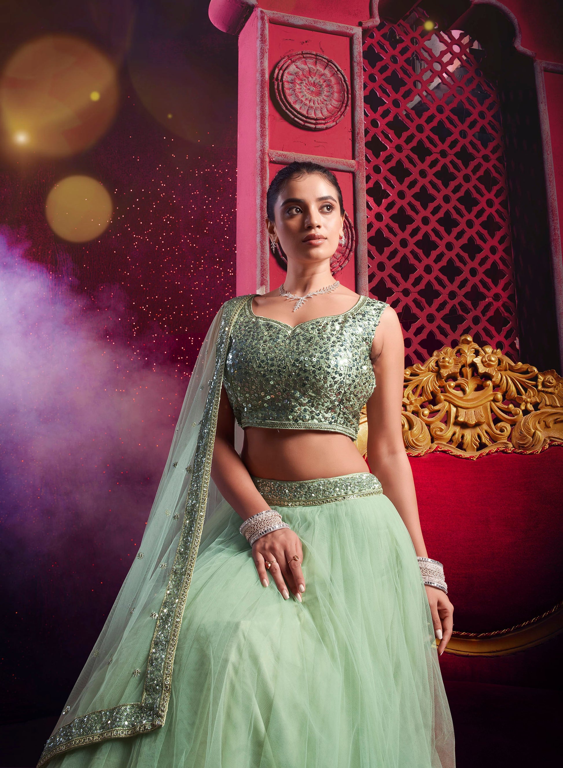 Pista Green Net Sequence Embroidery Bridesmaid Lehenga