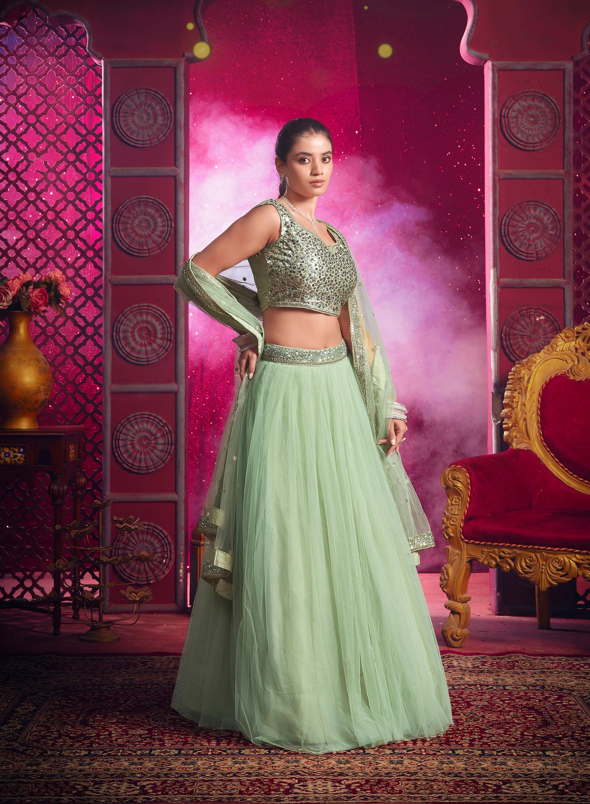 Are you seeking something exclusive? We've got what you require! This Pista Green Net Sequence Embroidery Bridesmaid Lehenga with its gorgeous sequence embroidery and pista green color is the perfect option for those seeking to make an impact. You will certainly be the center of attention in this lehenga if you wear it to a wedding , an engagement party, or a sangeet. Pictured here is a bridesmaid wearing the Pista Green Net Sequence Embroidery Bridesmaid Lehenga, which you can purchase today!