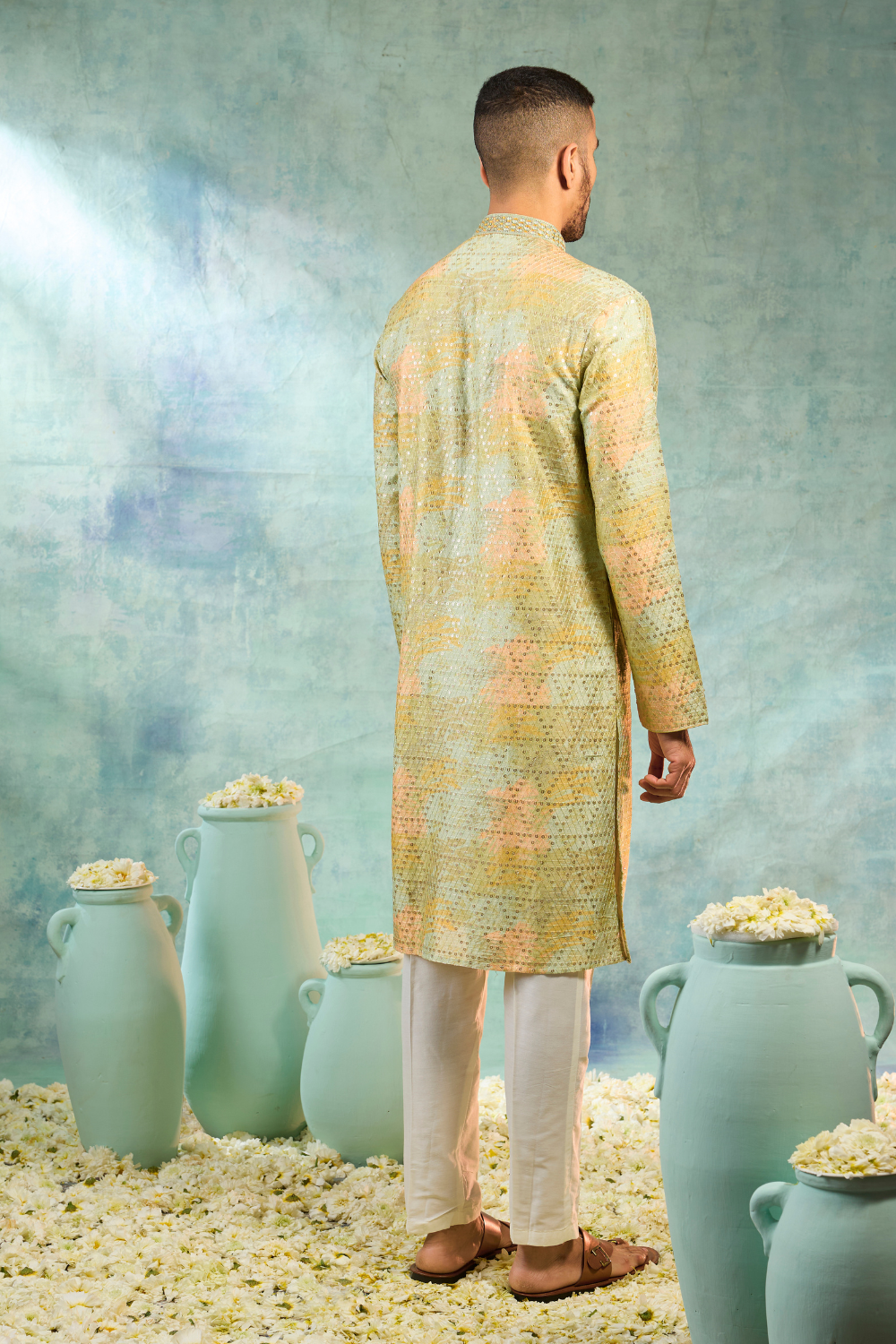 This pista green silk kurta set combines elegance and charm with intricate thread and sequin work. The delicate embellishments enhance the luxurious fabric, making it a perfect choice for festive occasions and evening celebrations.
