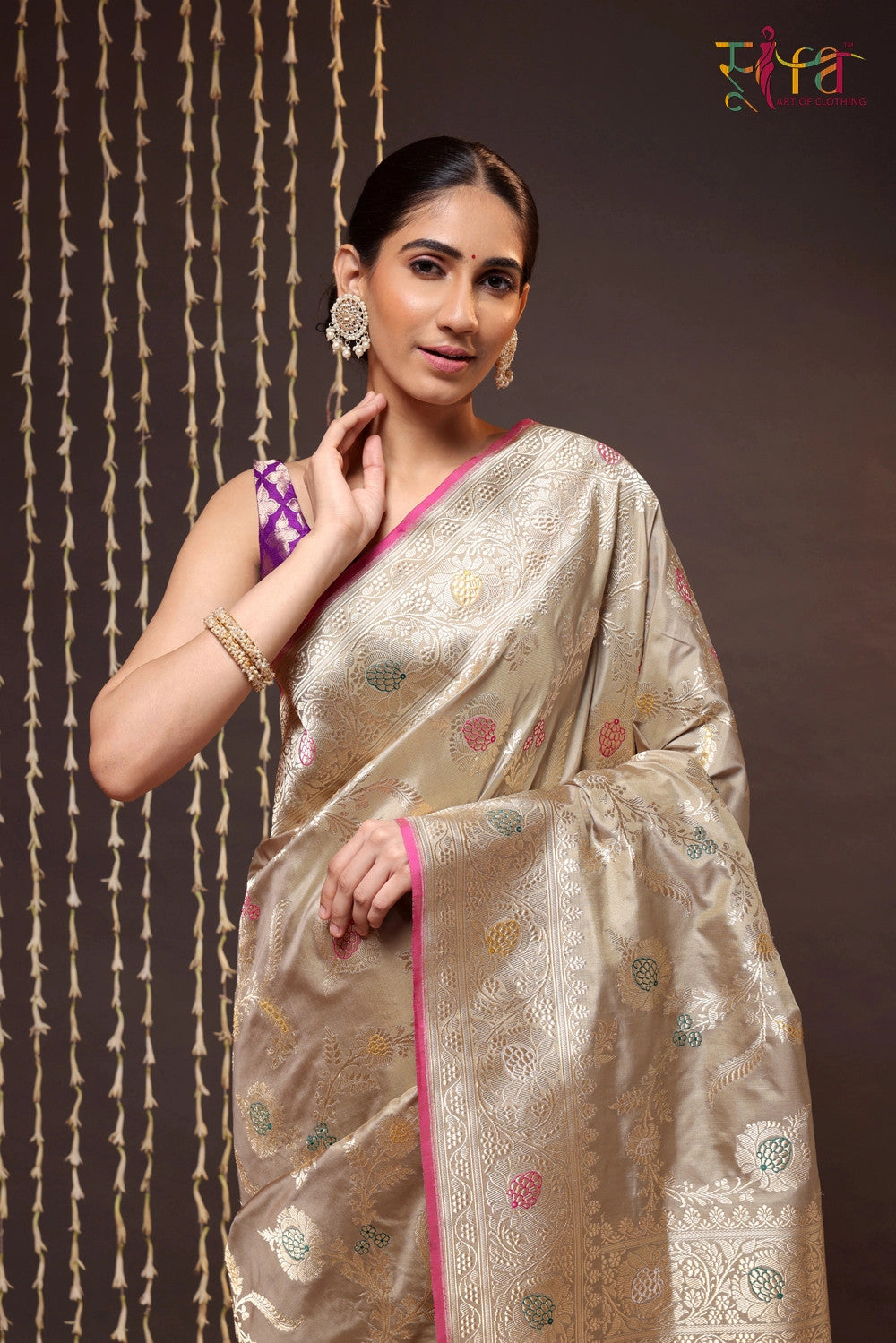 Experience timeless elegance with our Pistachio Green Handloom Pure Silk Banarasi Saree. Merging traditional craftsmanship with contemporary charm, it drapes you in sophistication. The delicate pistachio hue embodies nature's beauty, while the intricate Kadhwa border and pallu, adorned with silver zari, showcase the centuries-old artistry of Banarasi weaving. Multi-color motifs infuse vibrancy. Beyond attire, it's a masterpiece woven with heritage and Kadhwa art, exuding grace effortlessly. Elevate your style with this exquisite saree that harmoniously blends tradition and modernity, making a statement