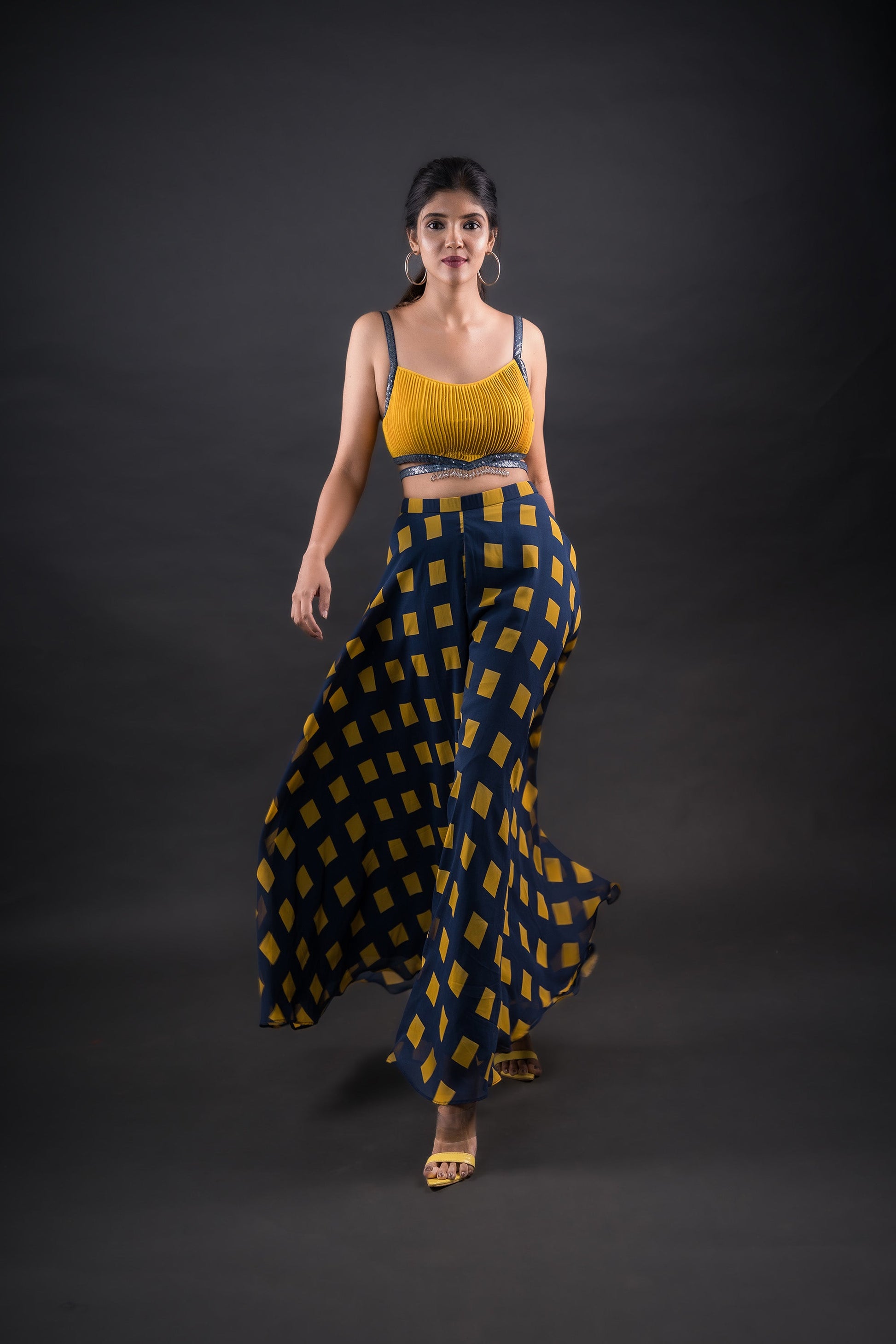 Pleated lycra crop top paired with printed geometric printed skirt palazzo