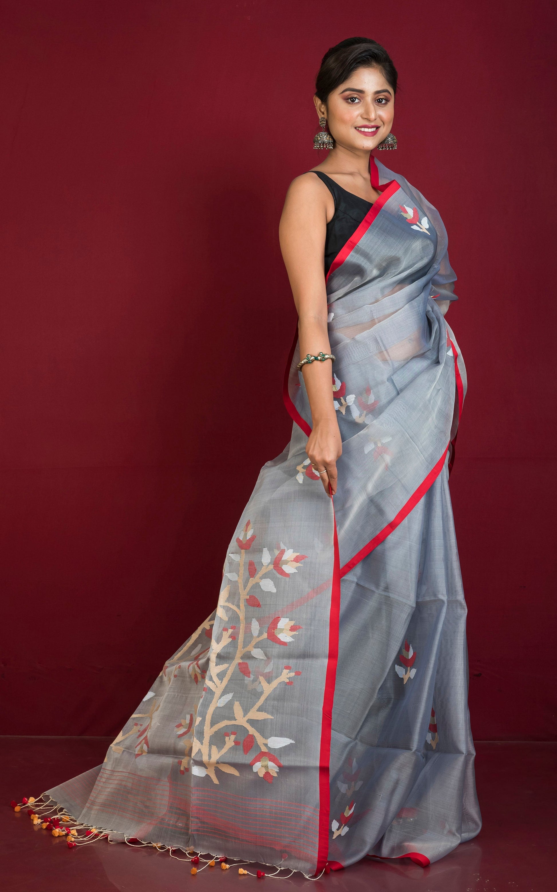Premium Poth Muslin Silk Jamdani Saree in Steel Grey, Red and Multicolored Thread Work