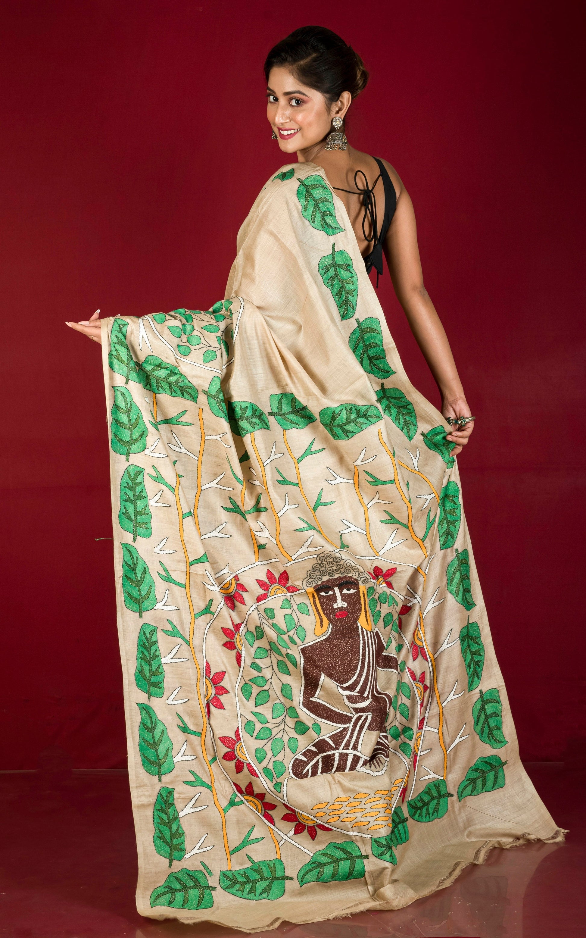 Hand Embroidery Kantha Stitch Saree on Authentic Soft Tussar Silk depicting an exclusive Buddha Nakshi Kantha Work