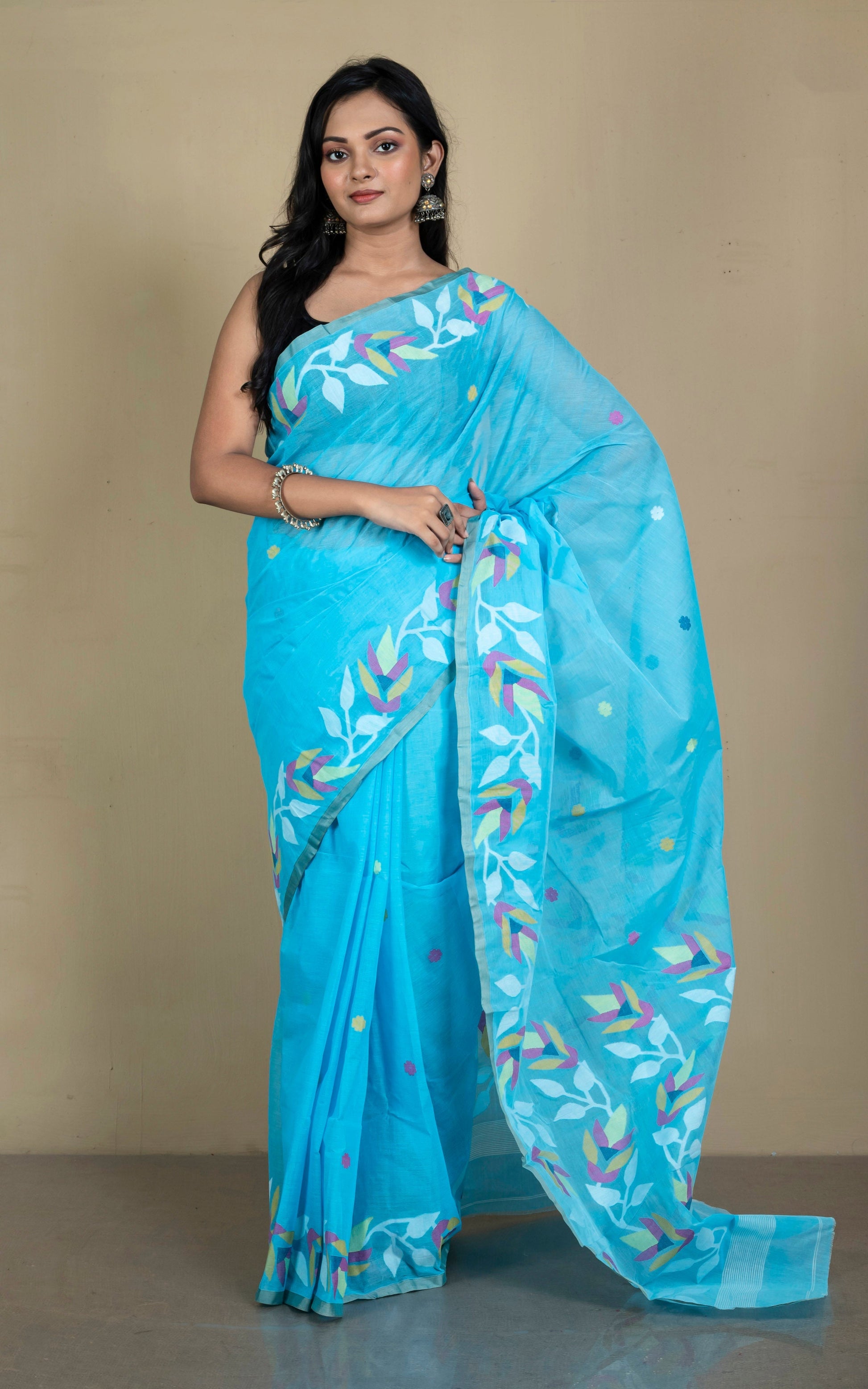 Premium Quality Hand Work Cotton Dhakai Jamdani Saree in Capri Blue and Multicolored Thread Work