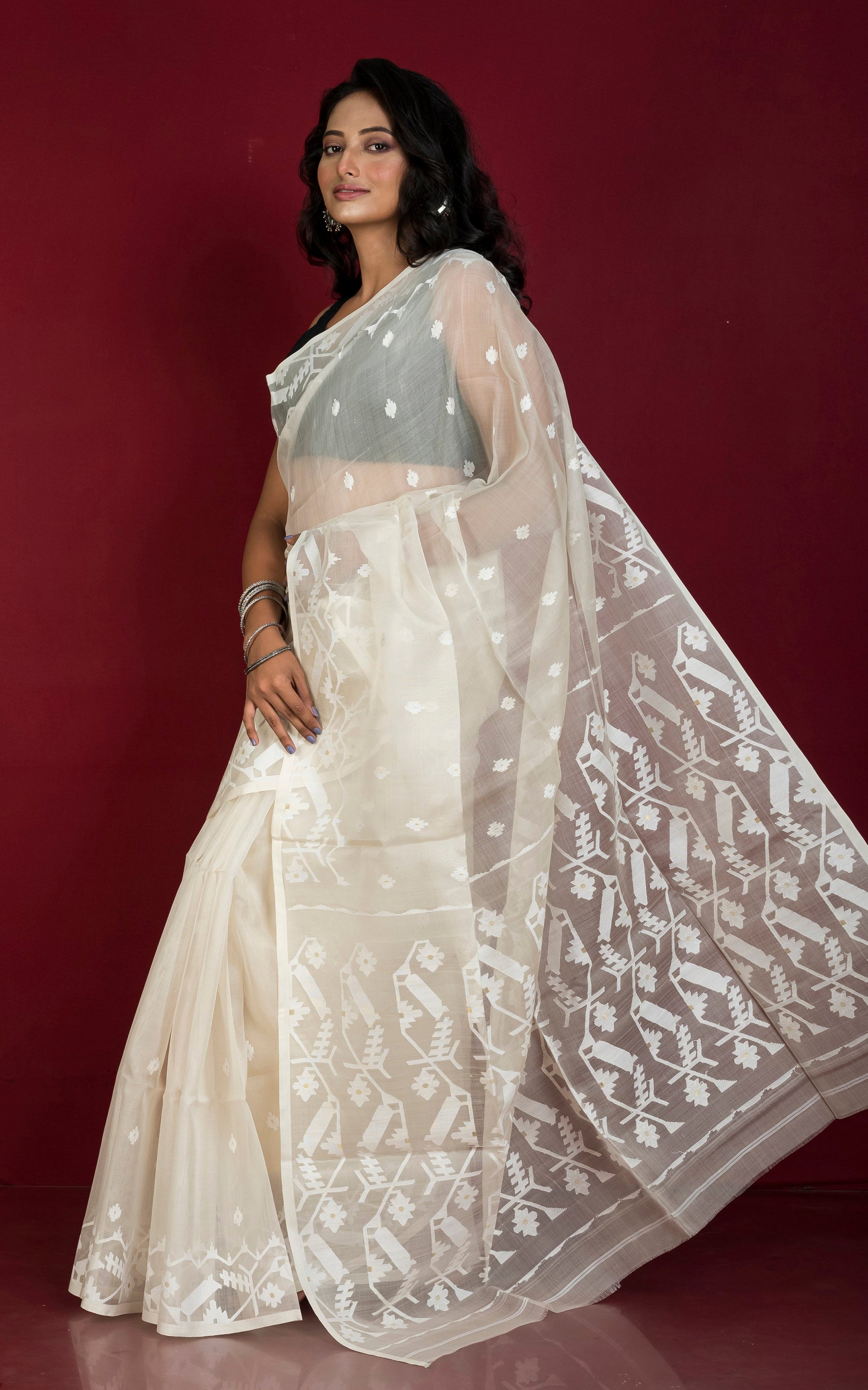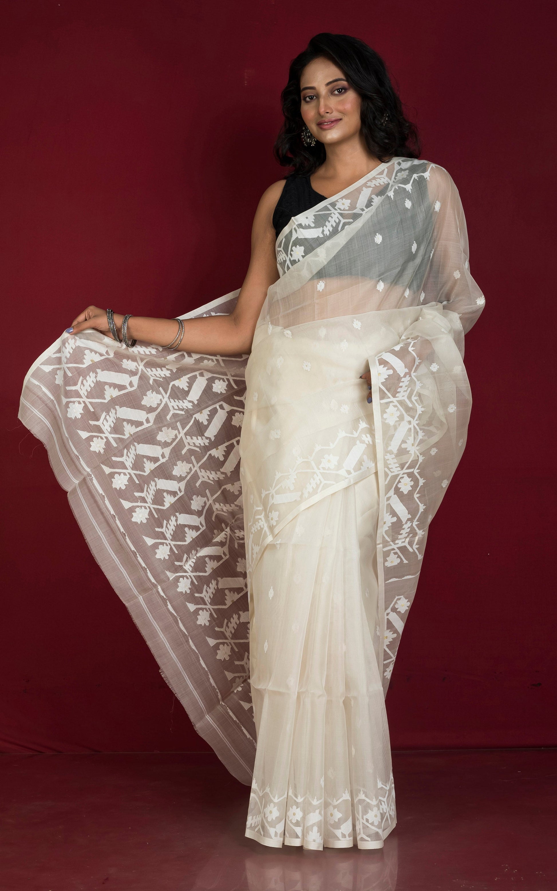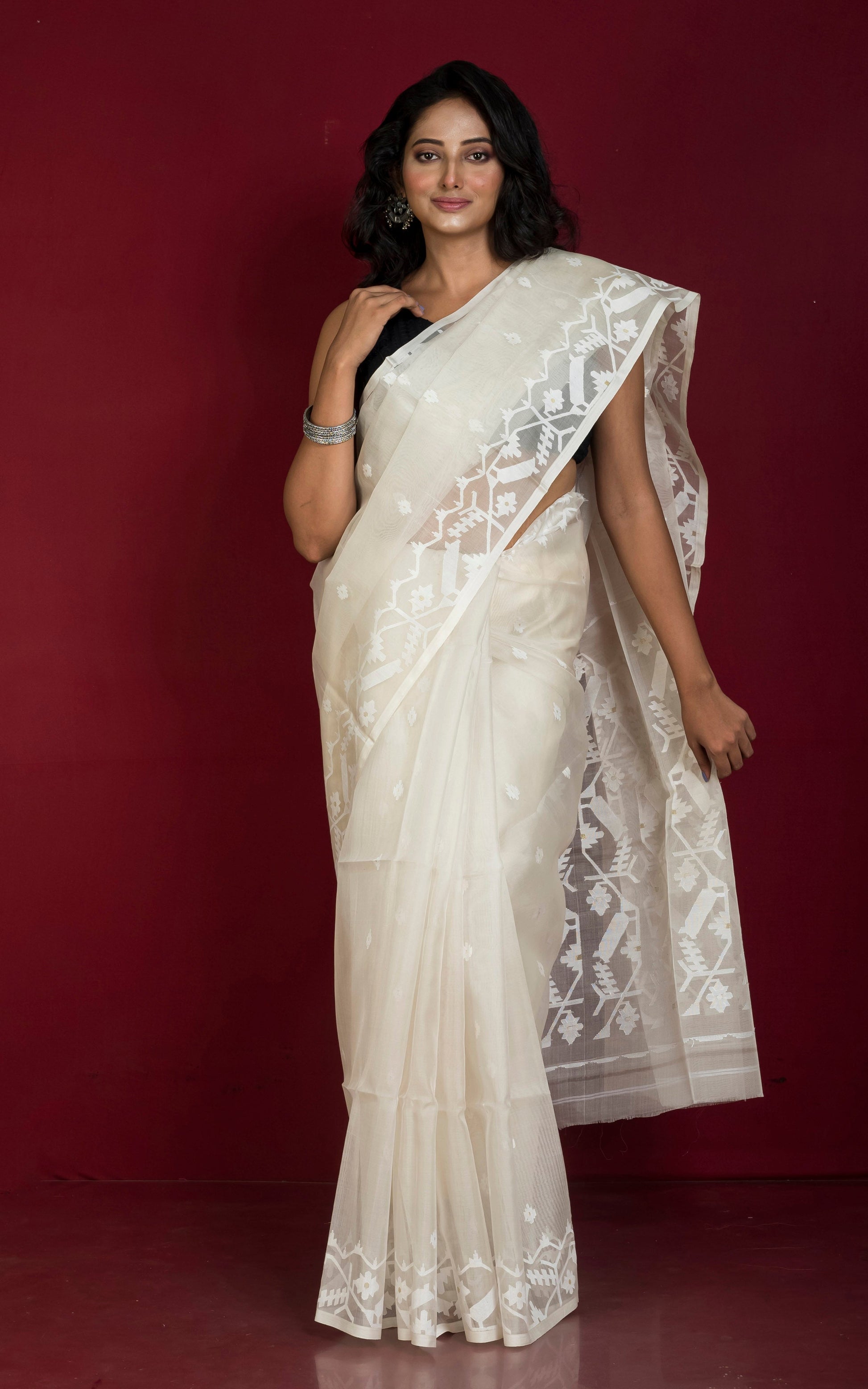 Premium Quality Traditional Karat Work Silk Jamdani Saree in Off White and White