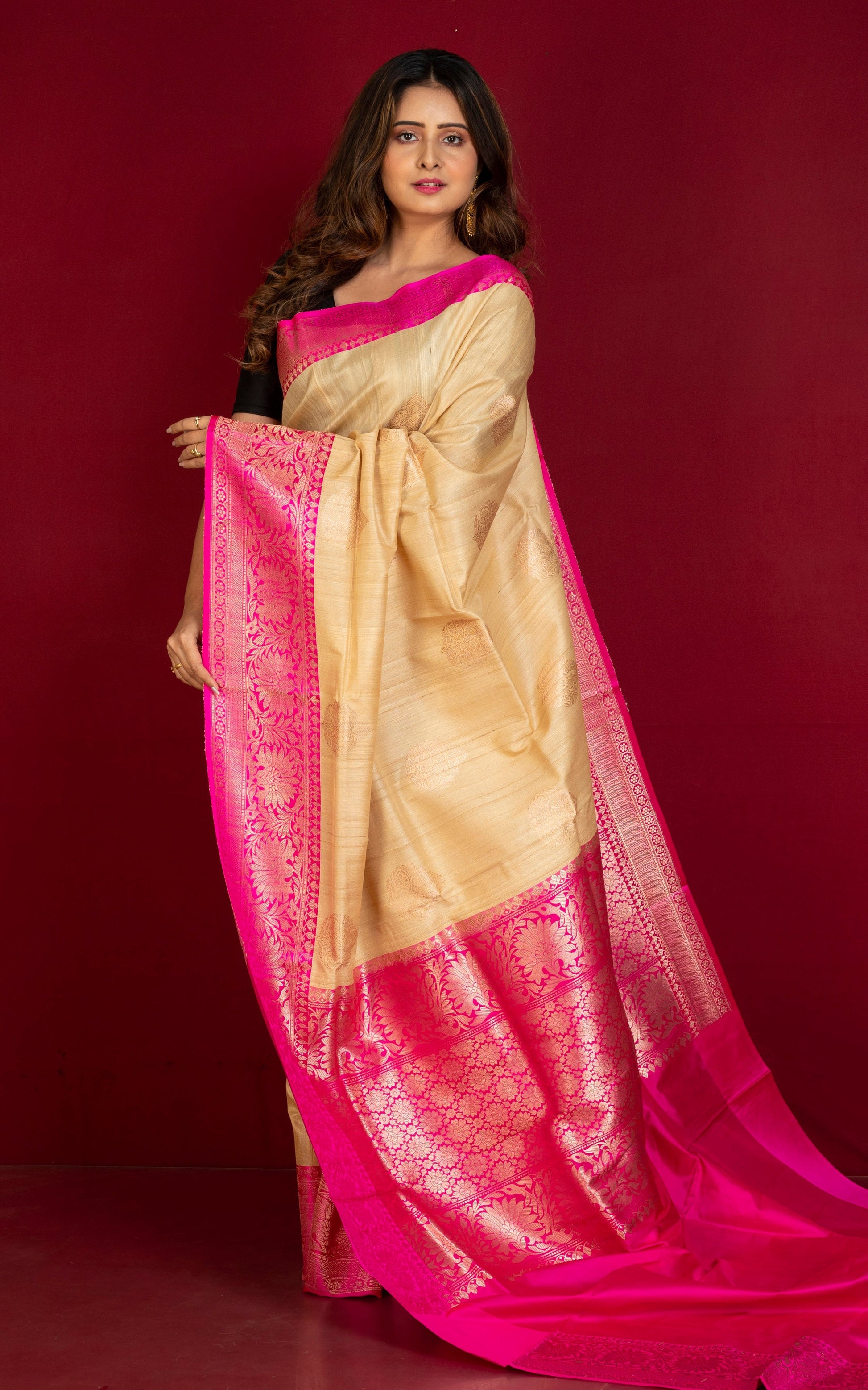 Premium Tussar Banarasi Silk Saree in Beige and Hot Pink