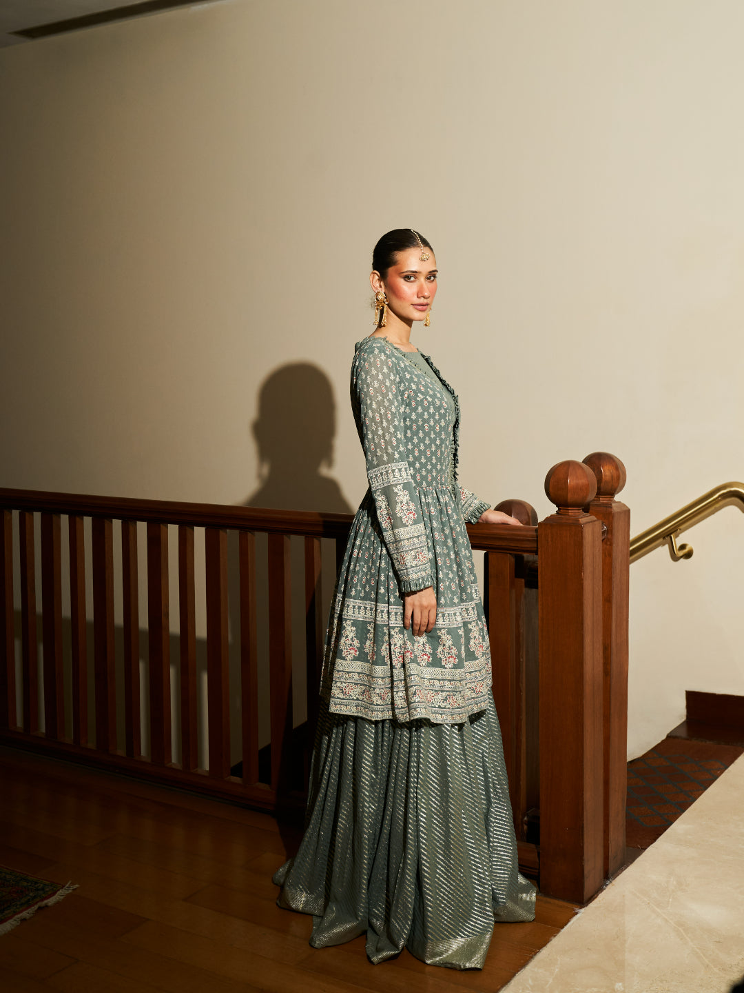 An elegant three-piece shrug with skirt set crafted from pure georgette fabric and adorned with a stunning foil print design. The regal sea salt hue exudes sophistication, making it an ideal choice for any special occasion.