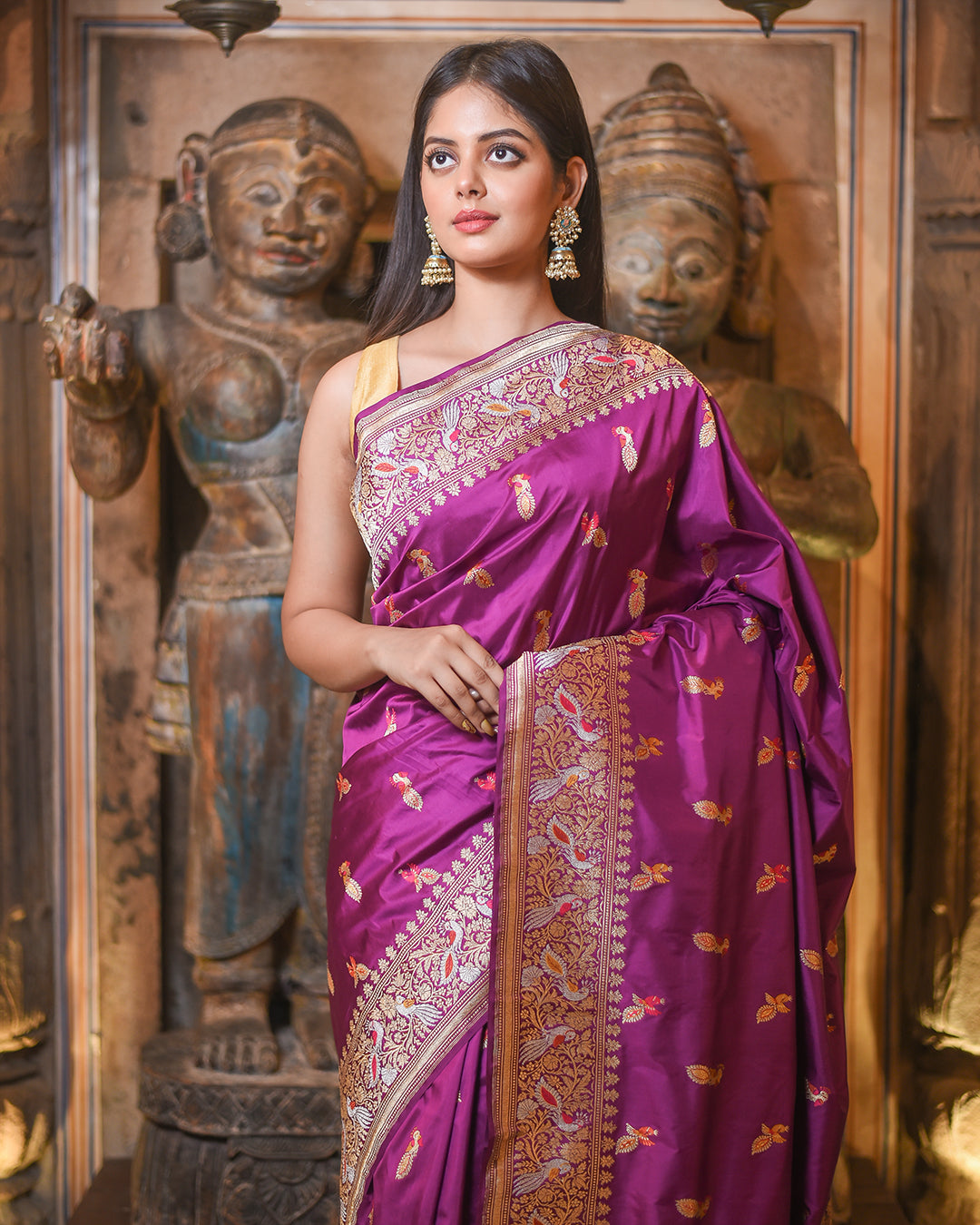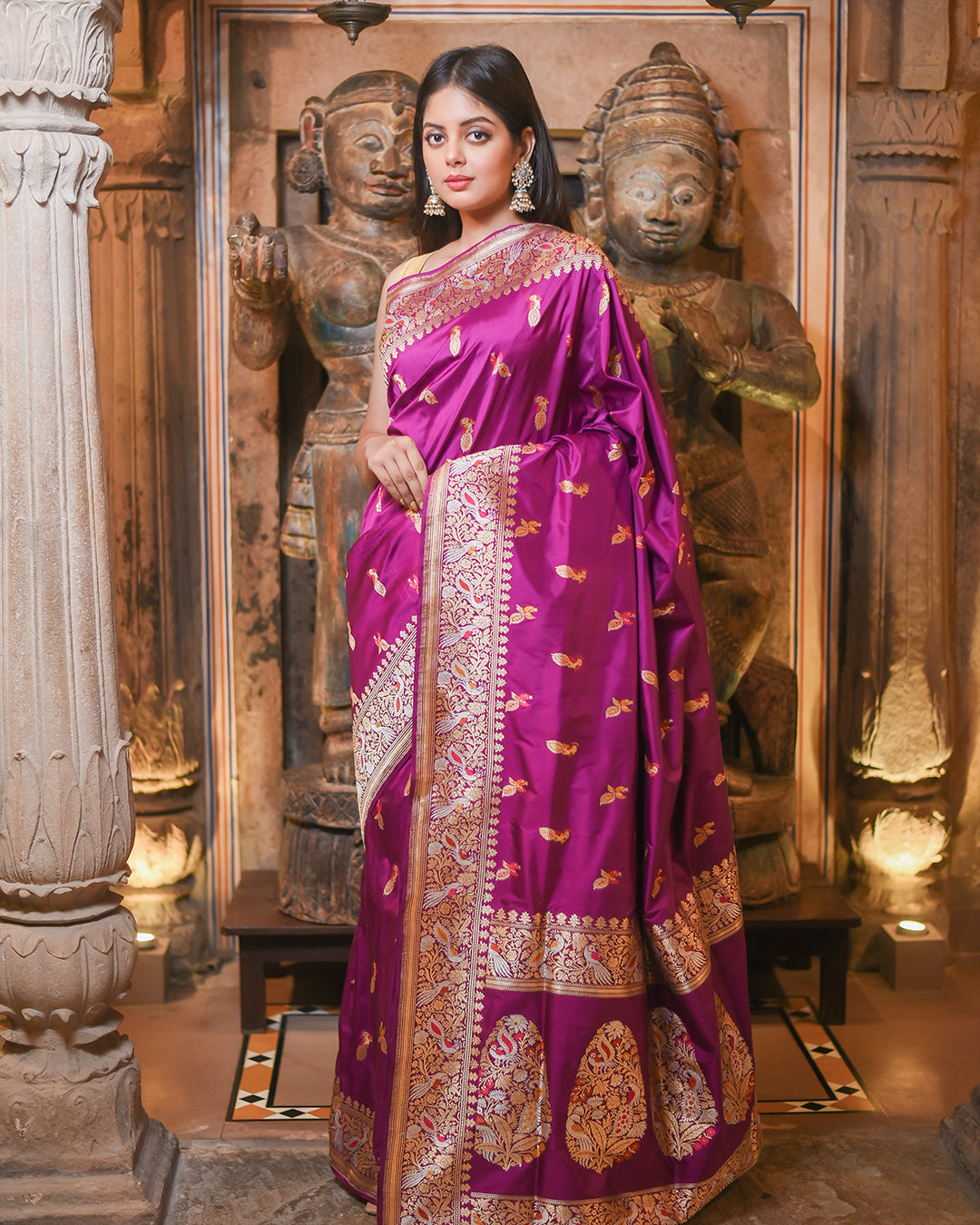 Product Description: Embrace the splendor of the Purple Handwoven Kadwa Katan Pure Silk Saree, a homage to the enduring traditions of Banaras. This saree features a striking peacock motif in multi colors, with a grand multi meena aachal in gold and silver zari, showcasing the artistry of handloom Banarasi weaving. With a saree length of 5.50 meters for the body and an additional 0.90 meters for the blouse, it's a symbol of timeless elegance and sustainable fashion.
