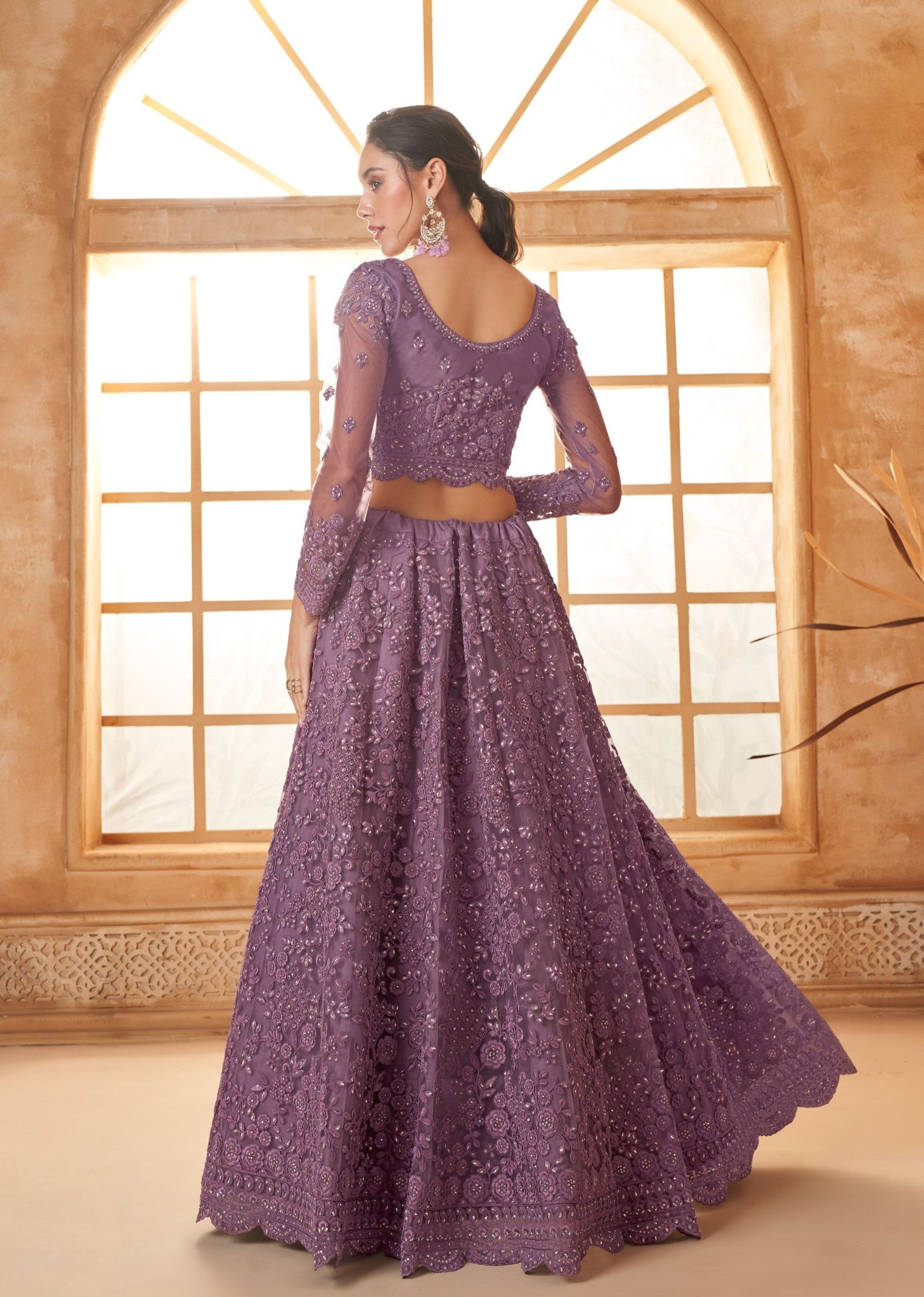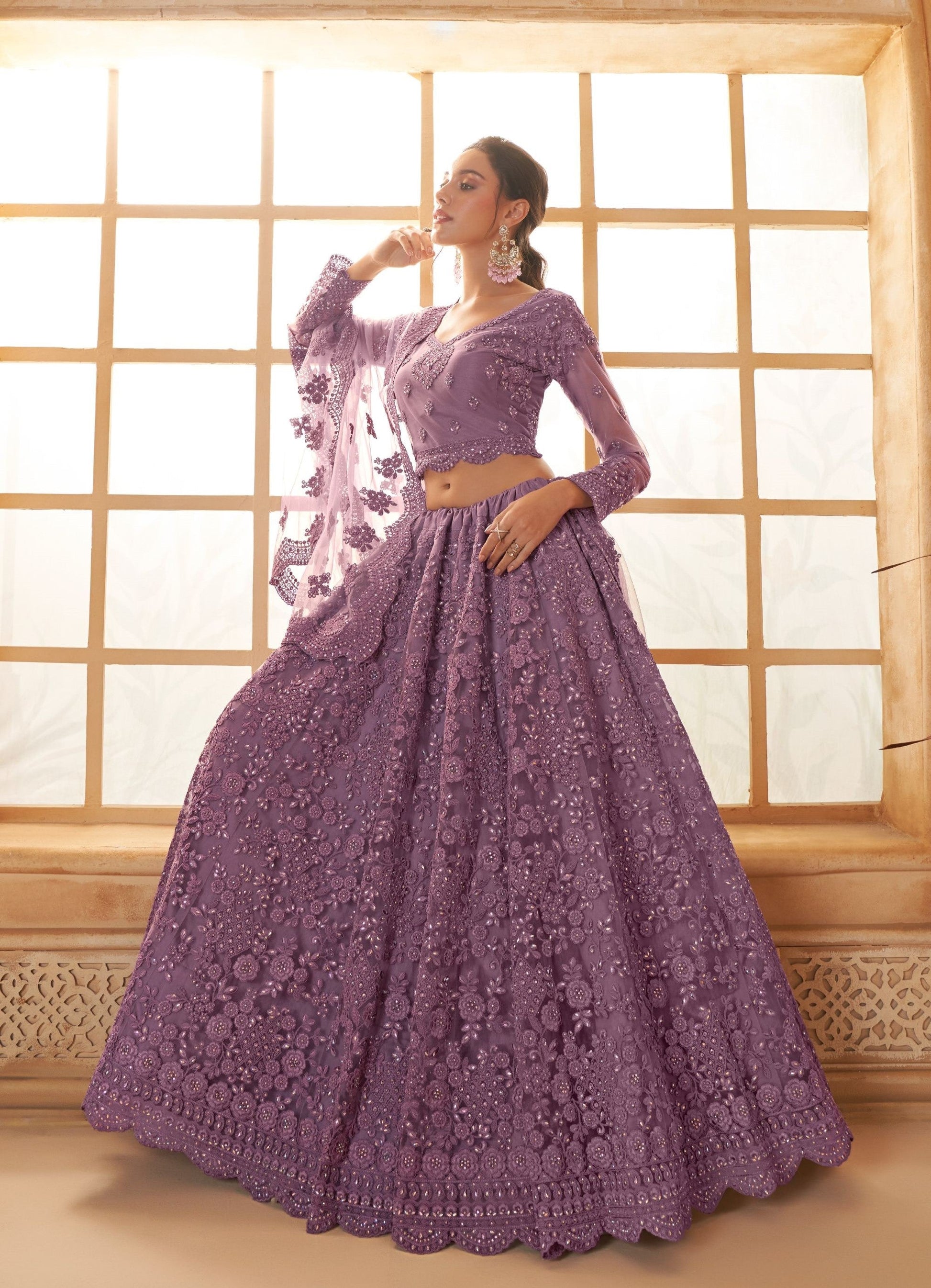 Purple Heavy Cording Embroidered Net Sangeet Lehenga Choli