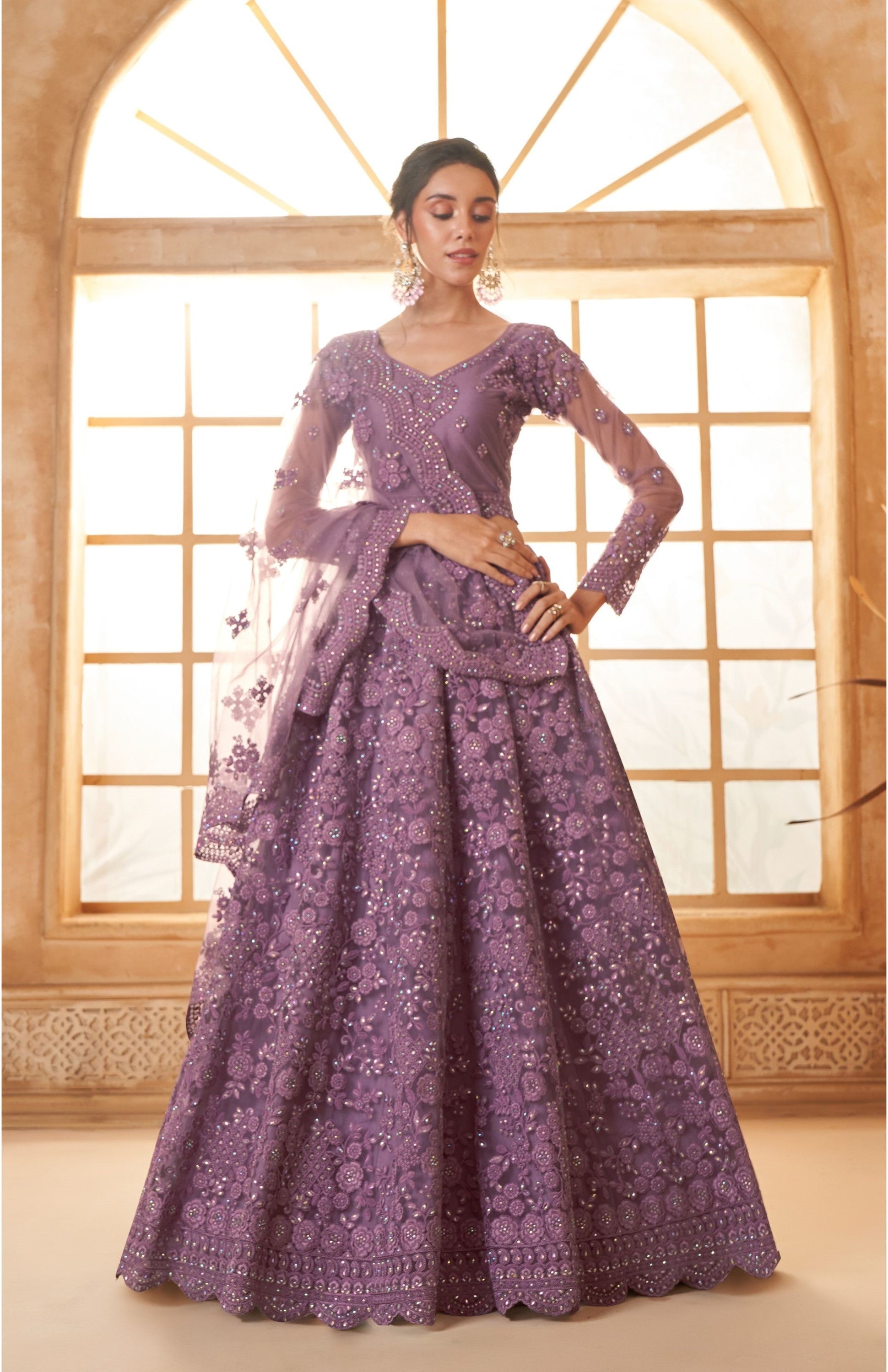 Looking for something a little out of the ordinary? We've got just the thing! This Purple Heavy Cording Embroidered Net Sangeet Lehenga Choli is perfect for those who want to make a statement. With its beautiful sequins embroidery and vibrant purple color, this lehenga is sure to make you the center of attention. A bridesmaid would look gorgeous in this outfit. It is suitable for any occasion, such as weddings, receptions, engagement parties, and sangeets. So don't wait any longer, add this Purple Heavy Cording Embroidered Net Sangeet Lehenga Choli to your wardrobe today!