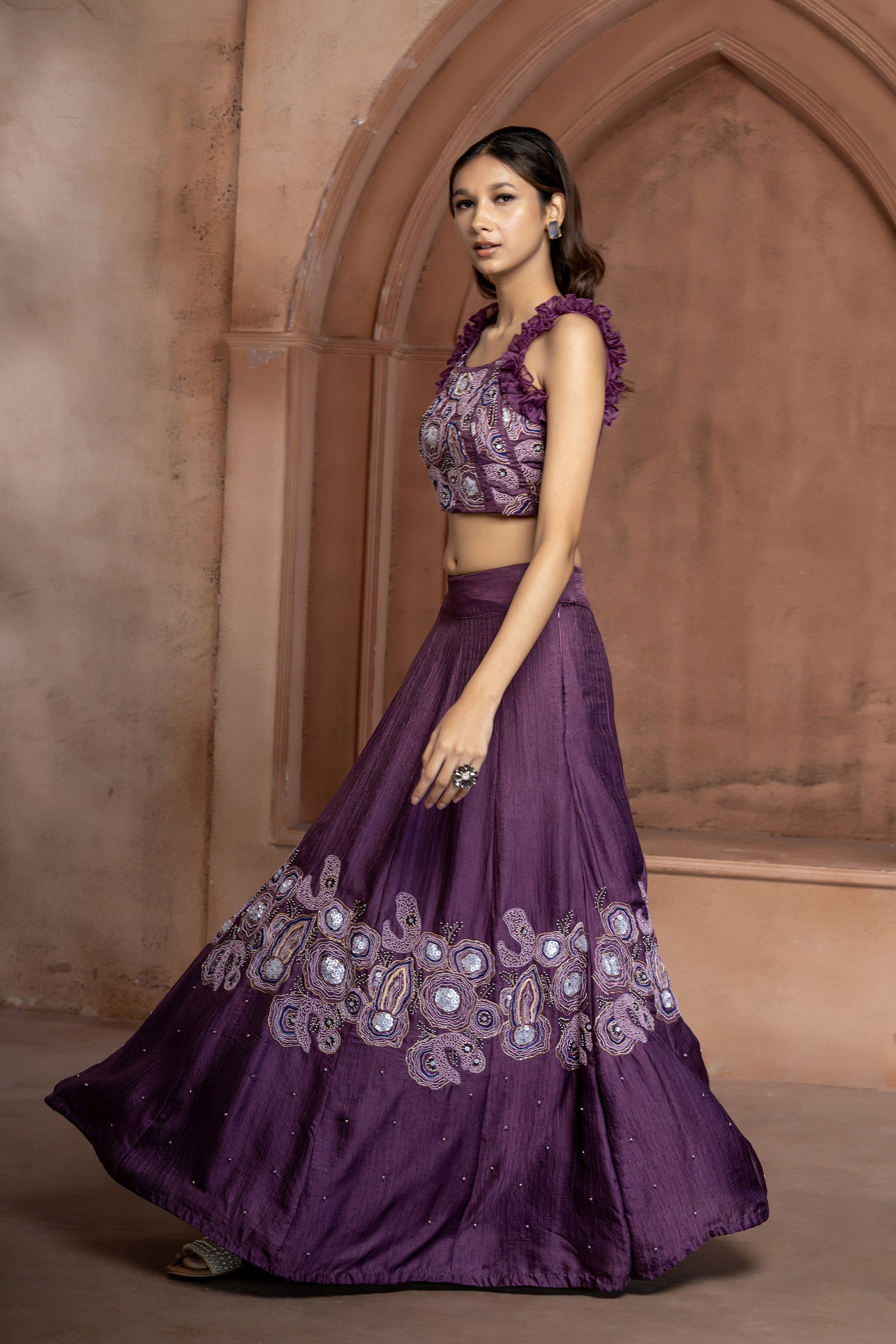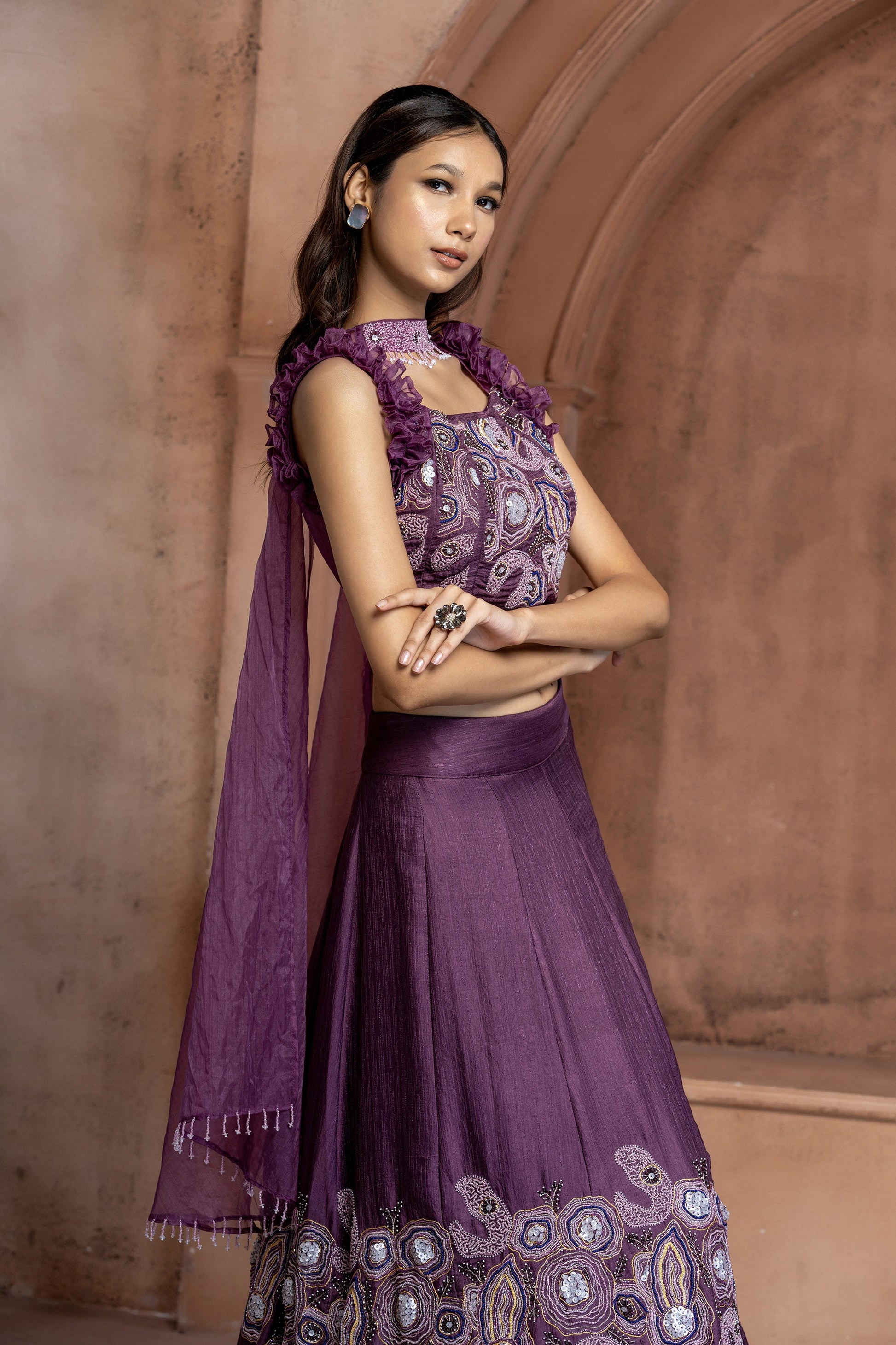 Beautifully embroidered Lehenga with fully embroidered choli that has organza frill around the shoulder with choker style dupatta