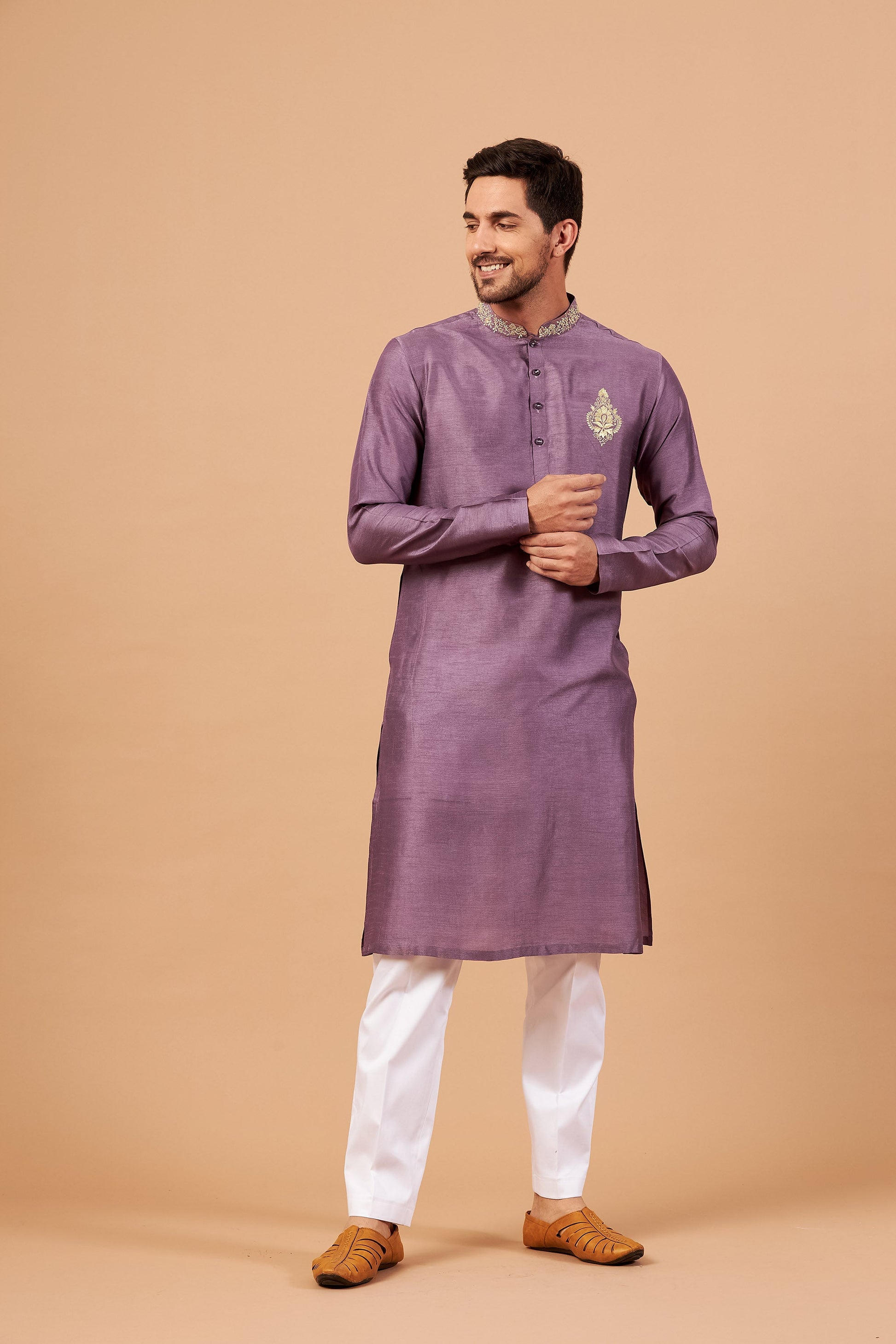 Featuring purple kurta in machine embroidery, embroidered near collar & motif at the chest ,which makes you look sassy and fashion forward . It can be worn for multiple occasions, from casual outings to festive occasions .pair it up with white or same colored bottoms.