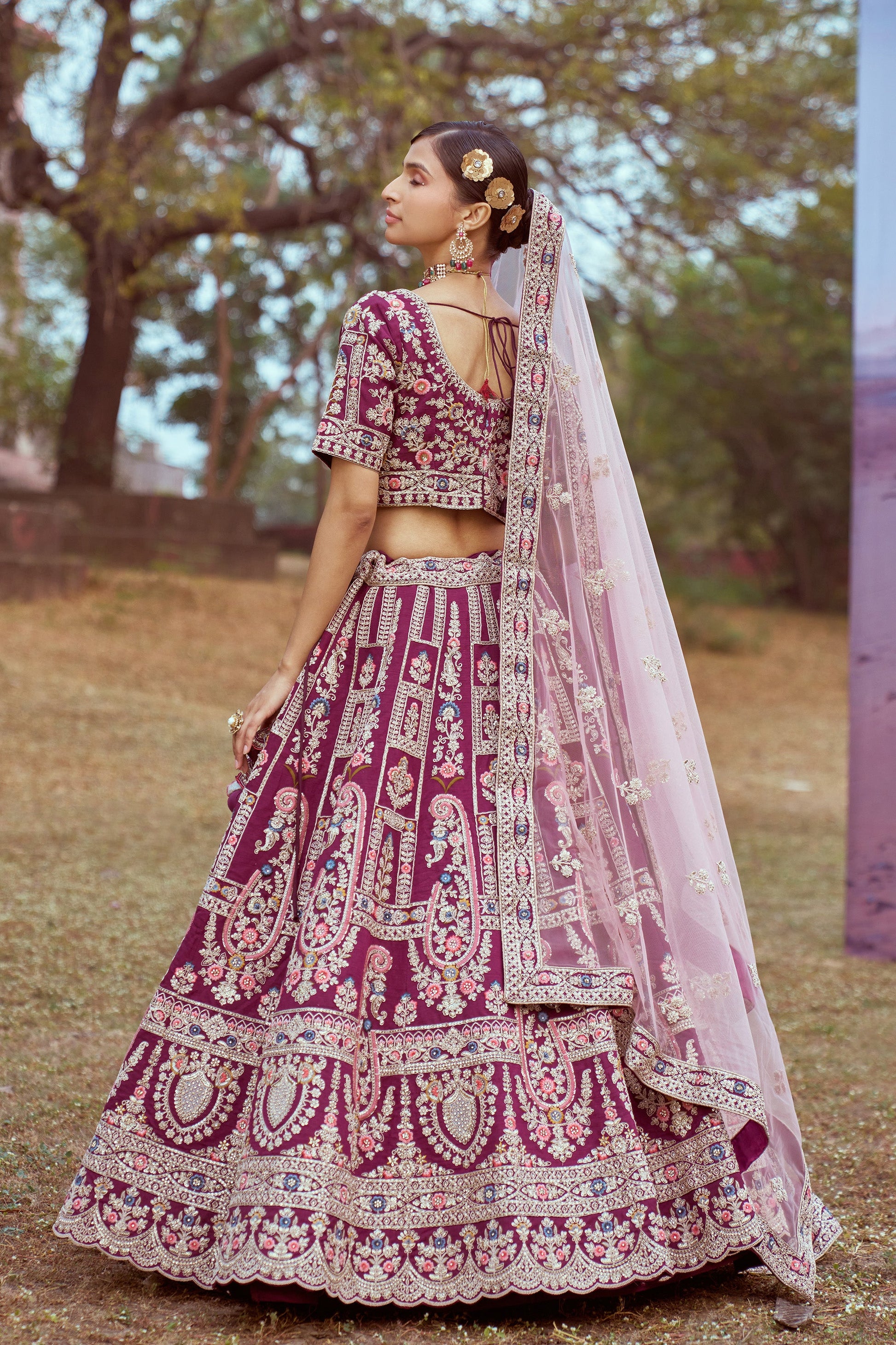 Purple Pure silk Moti, Coding embroidery Bridal Lehenga