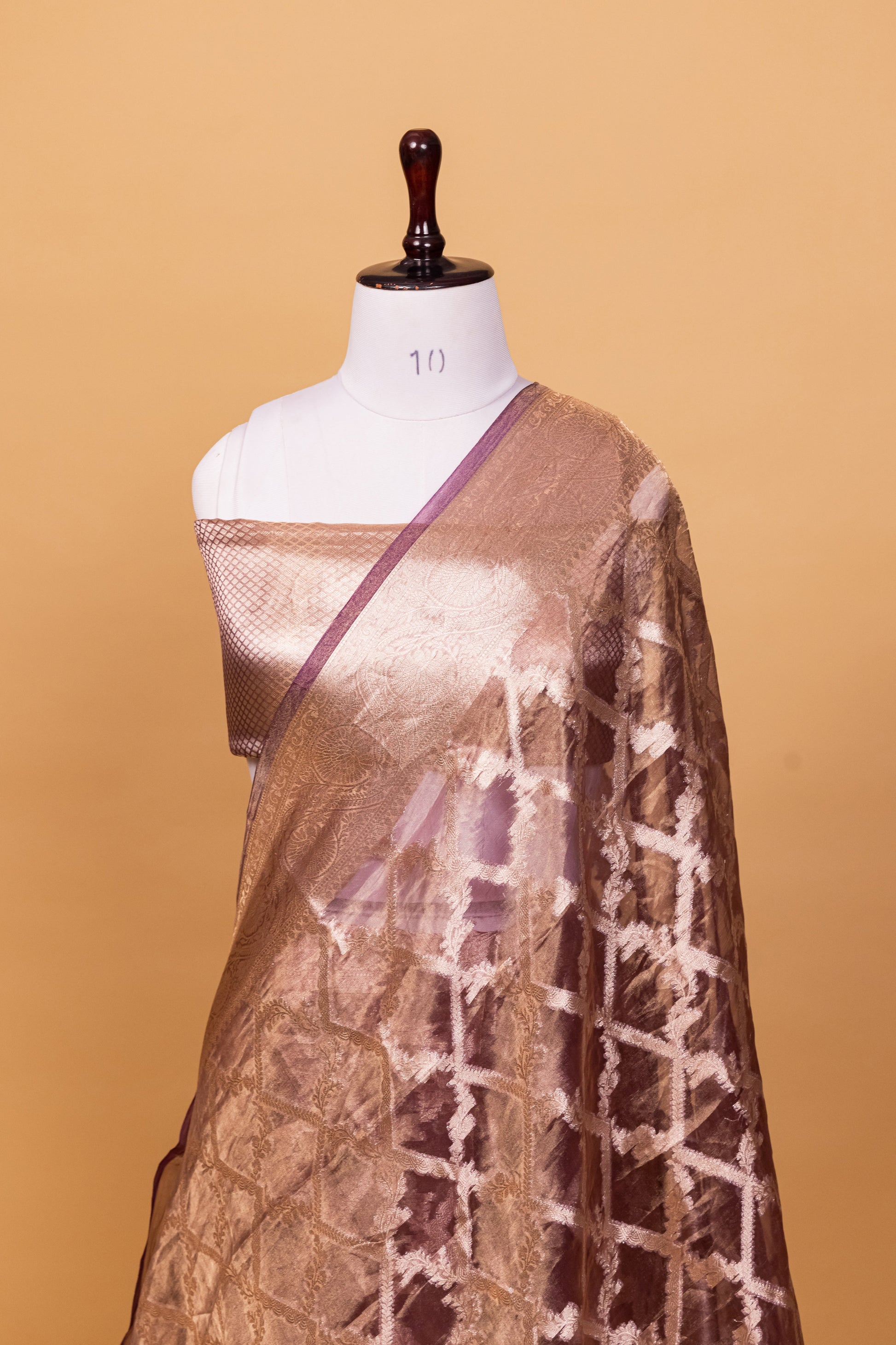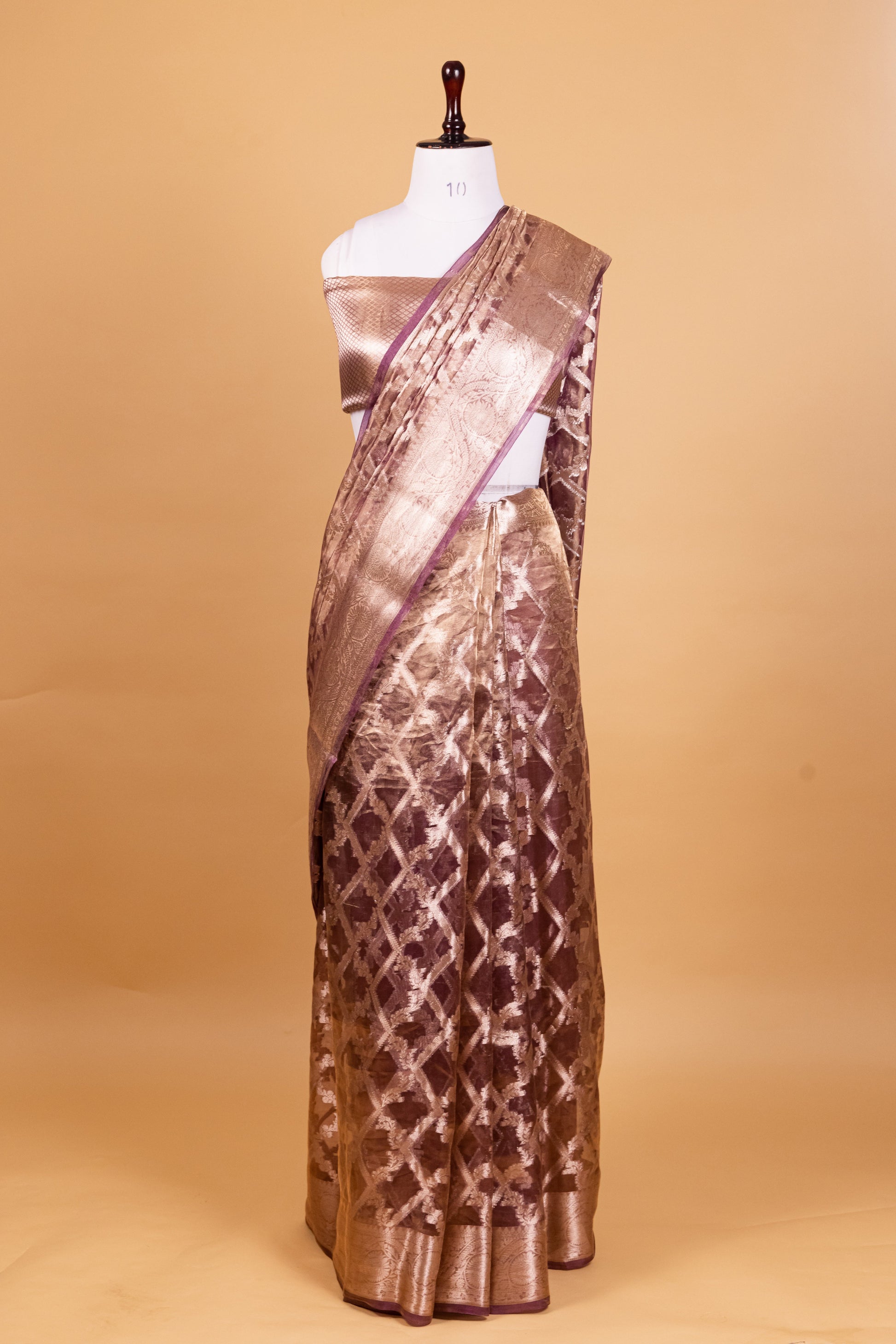 Description: This elegant Purple Tissue Pure Silk Dyed Saree features a stunning diamond pattern and a beautiful Banarasi border with an Aachal design. Made from pure silk, this saree has been delicately dyed in a rich purple color, adding a touch of sophistication to any occasion. Elevate your style with the luxurious feel and timeless appeal of this saree.