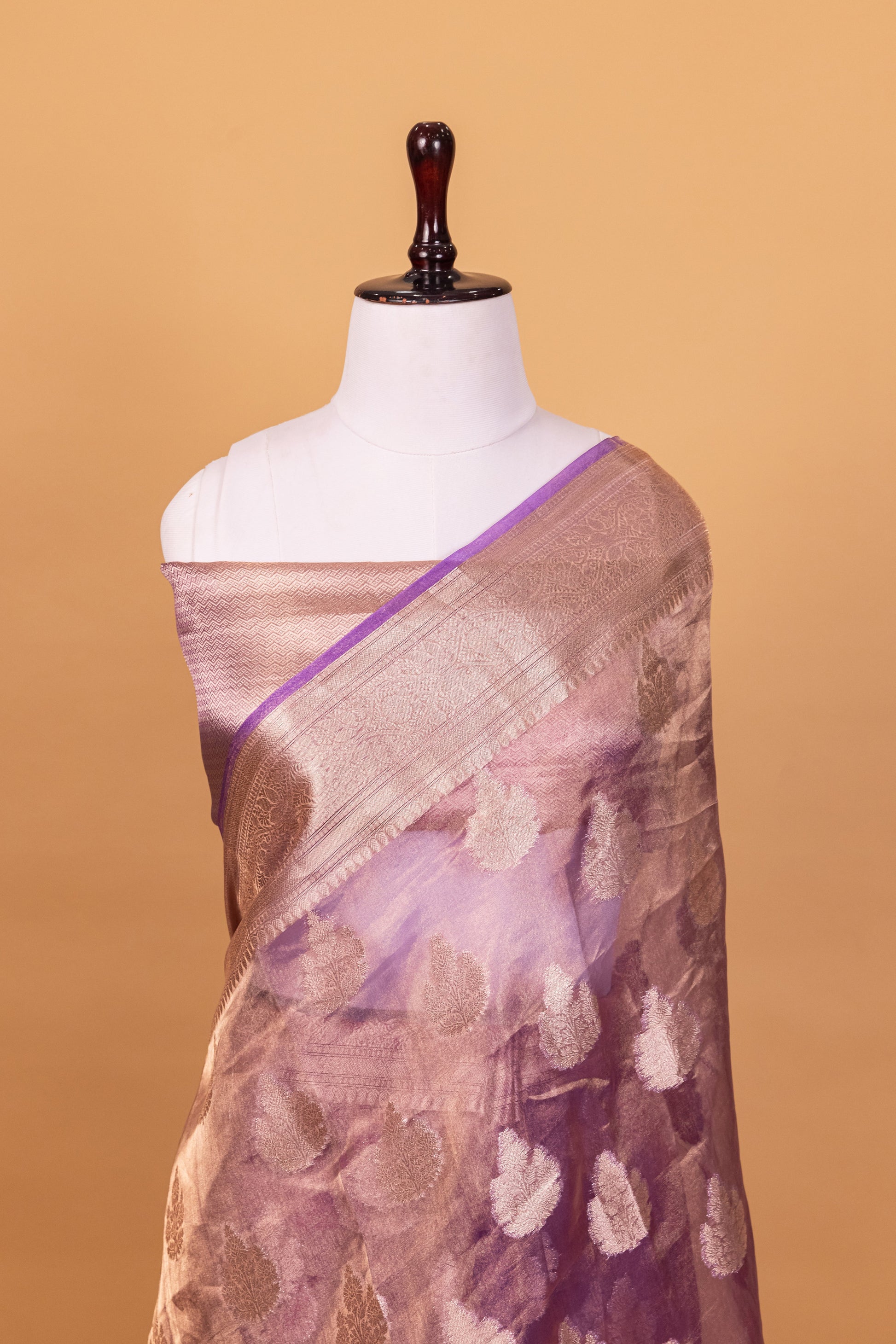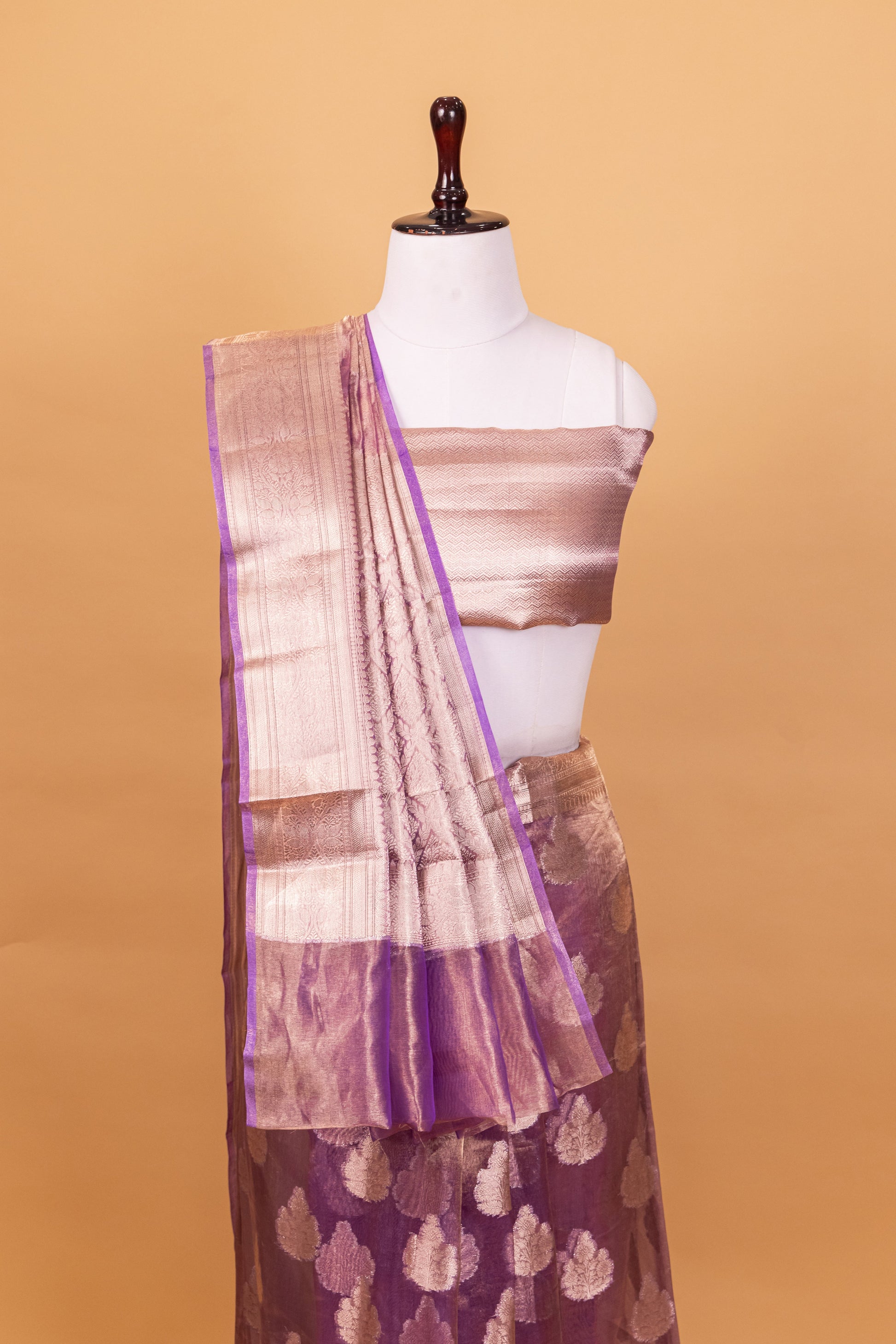 Description: Expertly crafted with luxurious purple tissue pure silk, this saree features a unique Booti Tissue design, complemented by a traditional Banarasi Aachal and Border. Elevate your style with the rich textures and vibrant colors of this hand-dyed saree. Perfect for any special occasion.