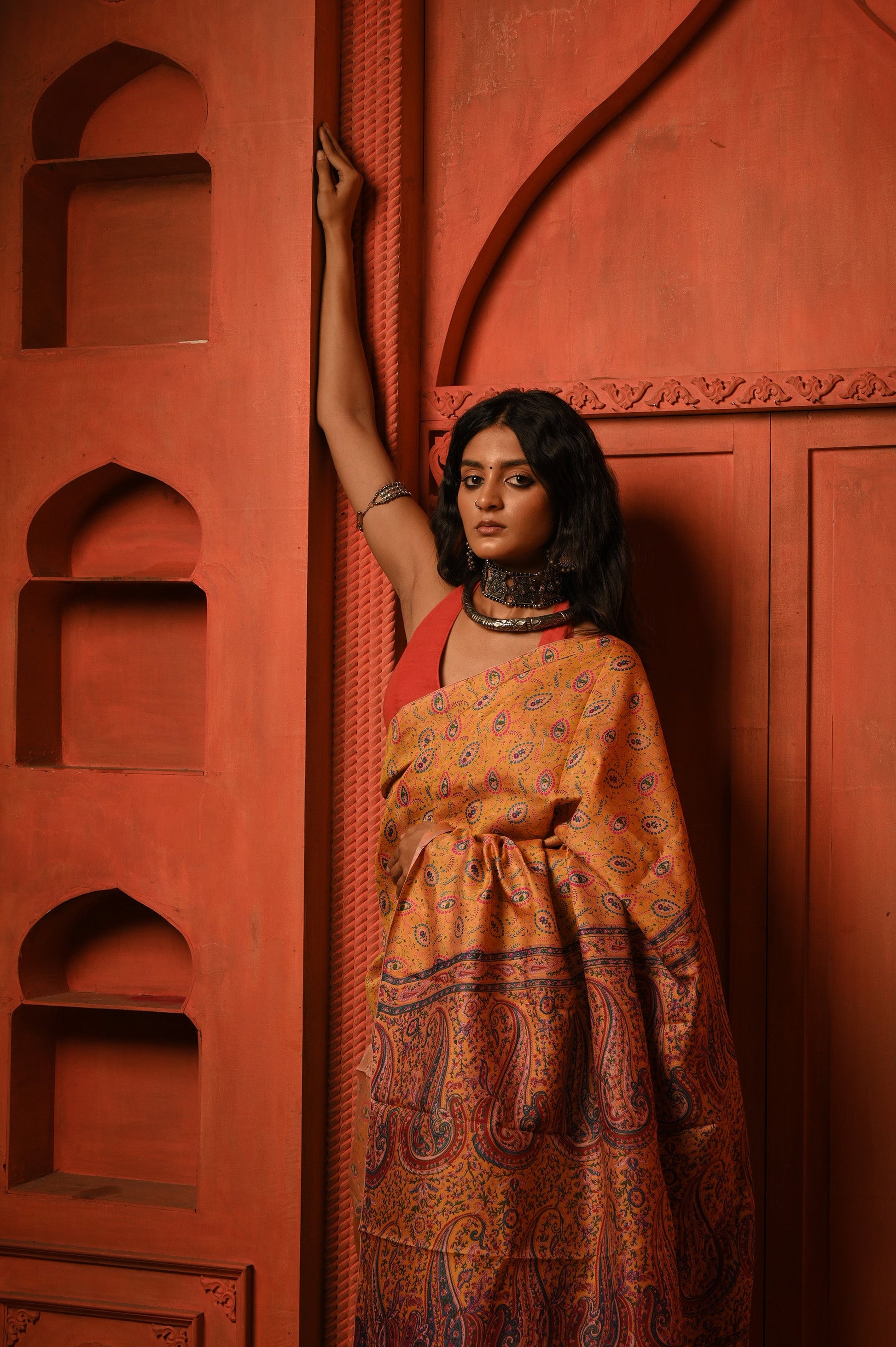 Rang Bahaar I Golden yellow paisley printed silk saree