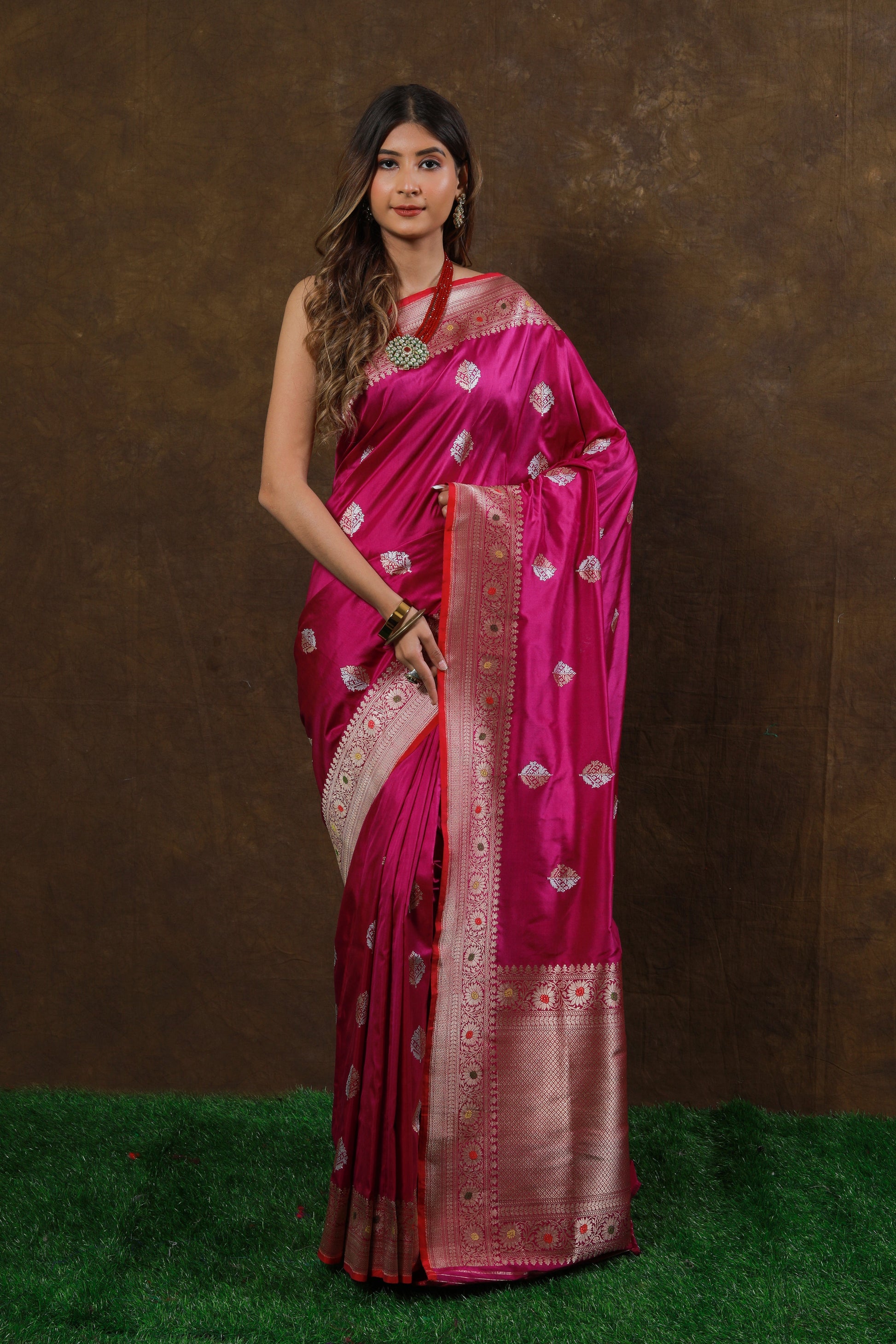 Product Description: The Rani Pink Handwoven Kadwa Katan Silk Saree is a splendid representation of Banarasi craftsmanship. It features a beautiful sona roopa leaf motif with meena border work and a contrasting kanni. This saree embodies the timeless traditions of Banaras and showcases elegant and sustainable fashion.