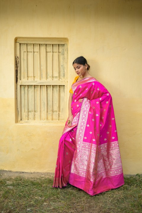 Make a statement at festive occasions or celebrations with this Katan Pure Silk Kadhwa Saree. The intricate Booti pattern, combined with Gold, Zari, and vibrant meena work, adds a regal touch to your ensemble, making you stand out with elegance and charm.