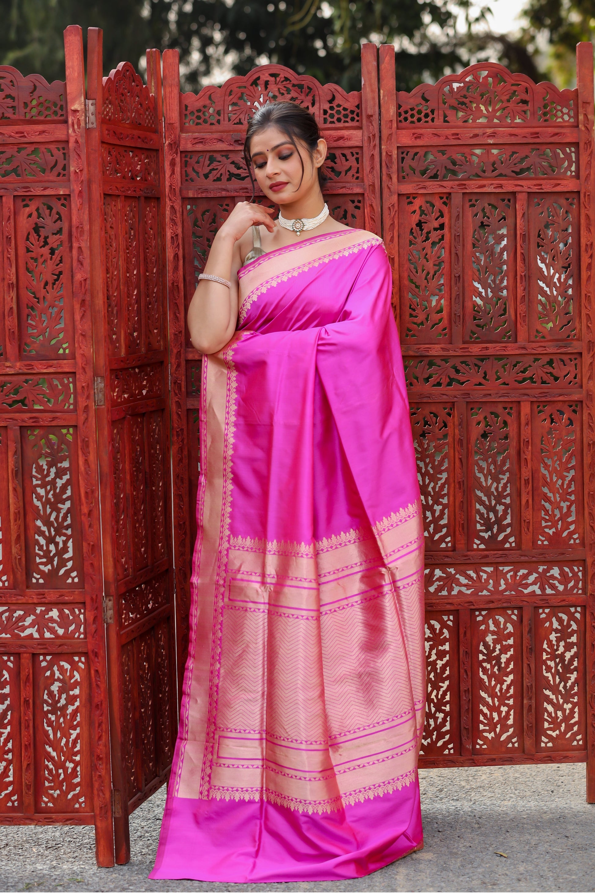 Product Description: Elevate your elegance with our Katan Pure Silk Plain Banarasi Sari. This exquisite saree features a plain body, showcasing the timeless beauty of Banarasi craftsmanship. Woven using the traditional Handloom Banarasi technique, the saree exudes authenticity and charm. The gold zari border and aachal add a touch of opulence, making it a perfect choice for both casual and formal occasions.