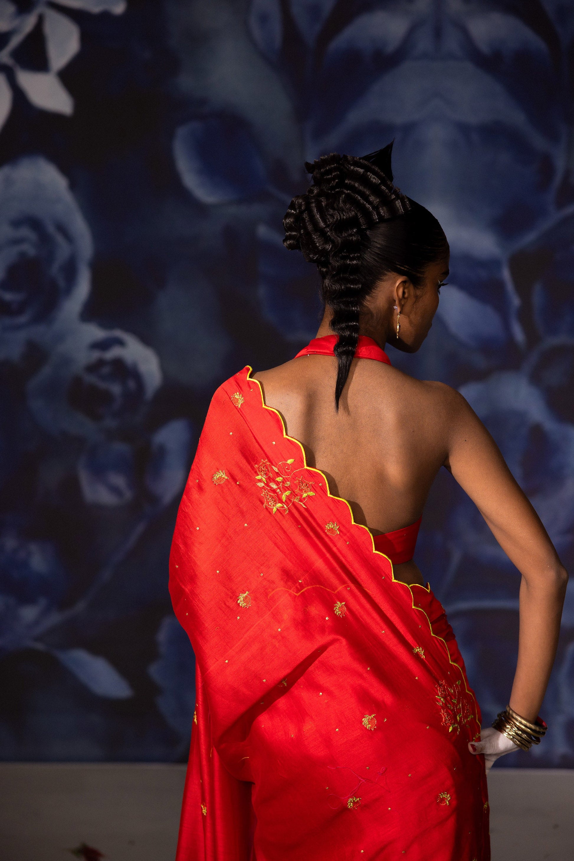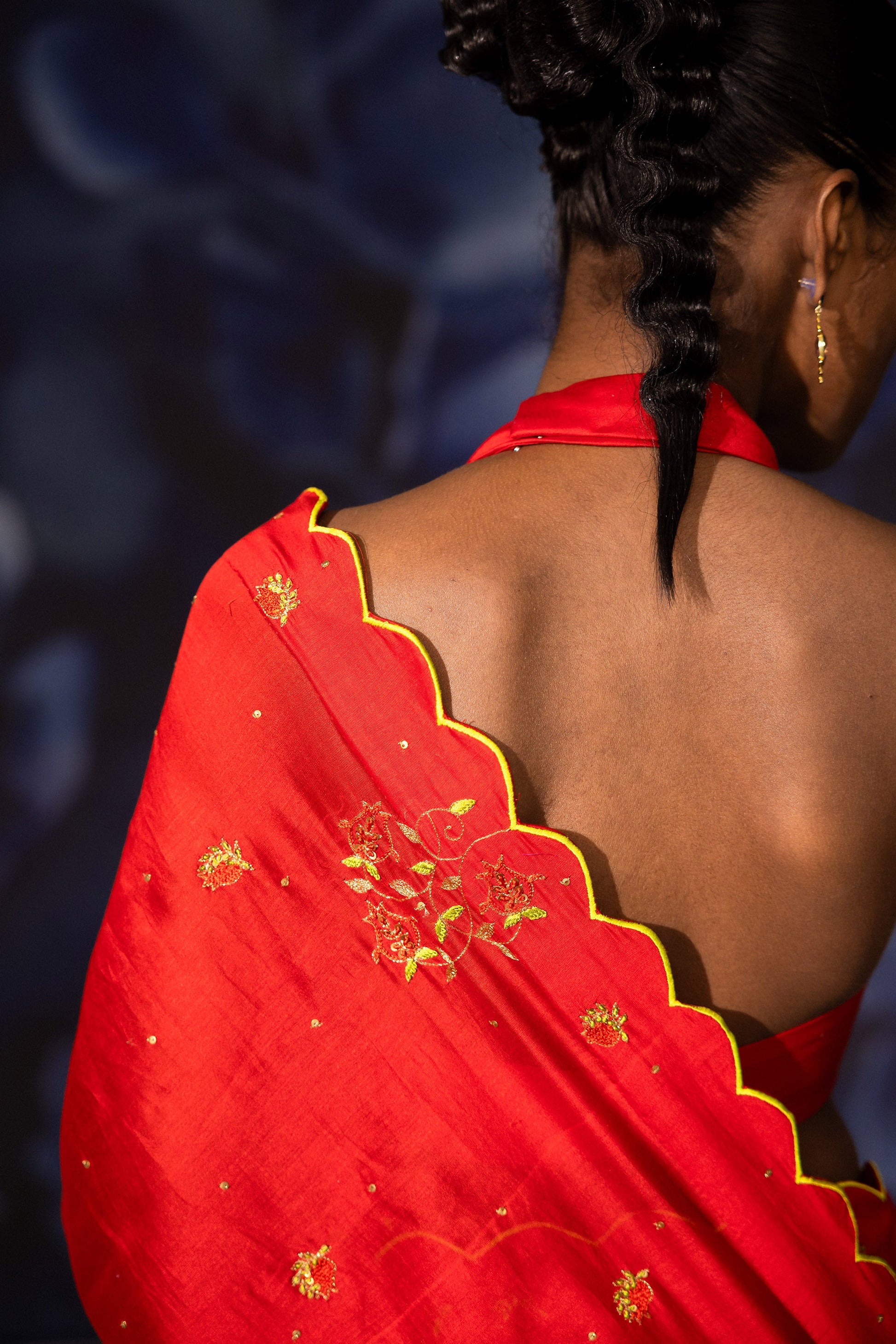 Red and Green Chanderi Hand Embroidered Vastralekha Saree