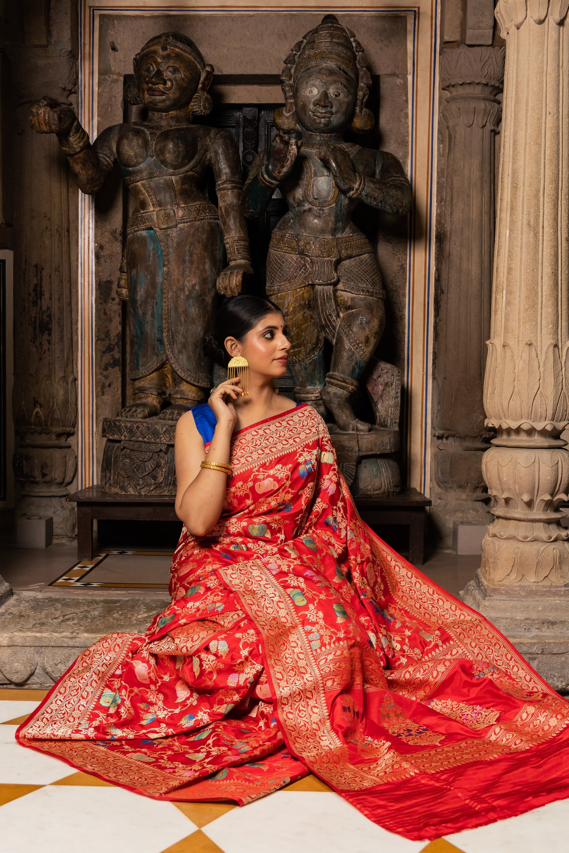 Product Description: Experience the exquisite allure of the Red Handwoven Kadwa Katan Silk Saree, a tribute to the enduring traditions of Banaras. This saree showcases a captivating Aangoori design with multi-color heavy meena work, highlighting the artistry of handloom Banarasi weaving. With a saree length of 5.50 meters for the body and an additional 0.90 meters for the blouse, it's a symbol of timeless elegance and sustainable fashion.