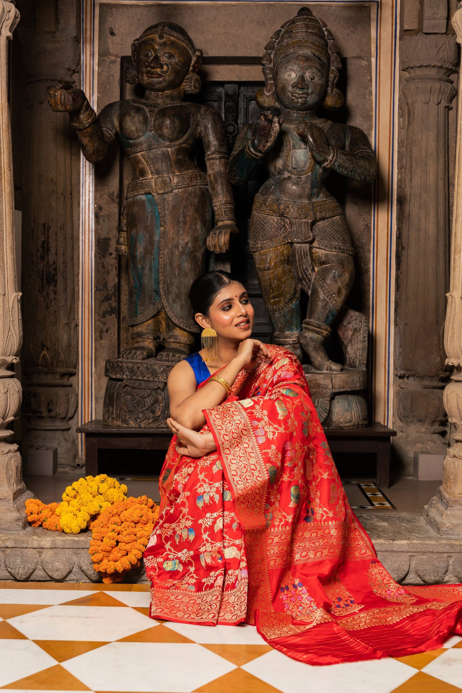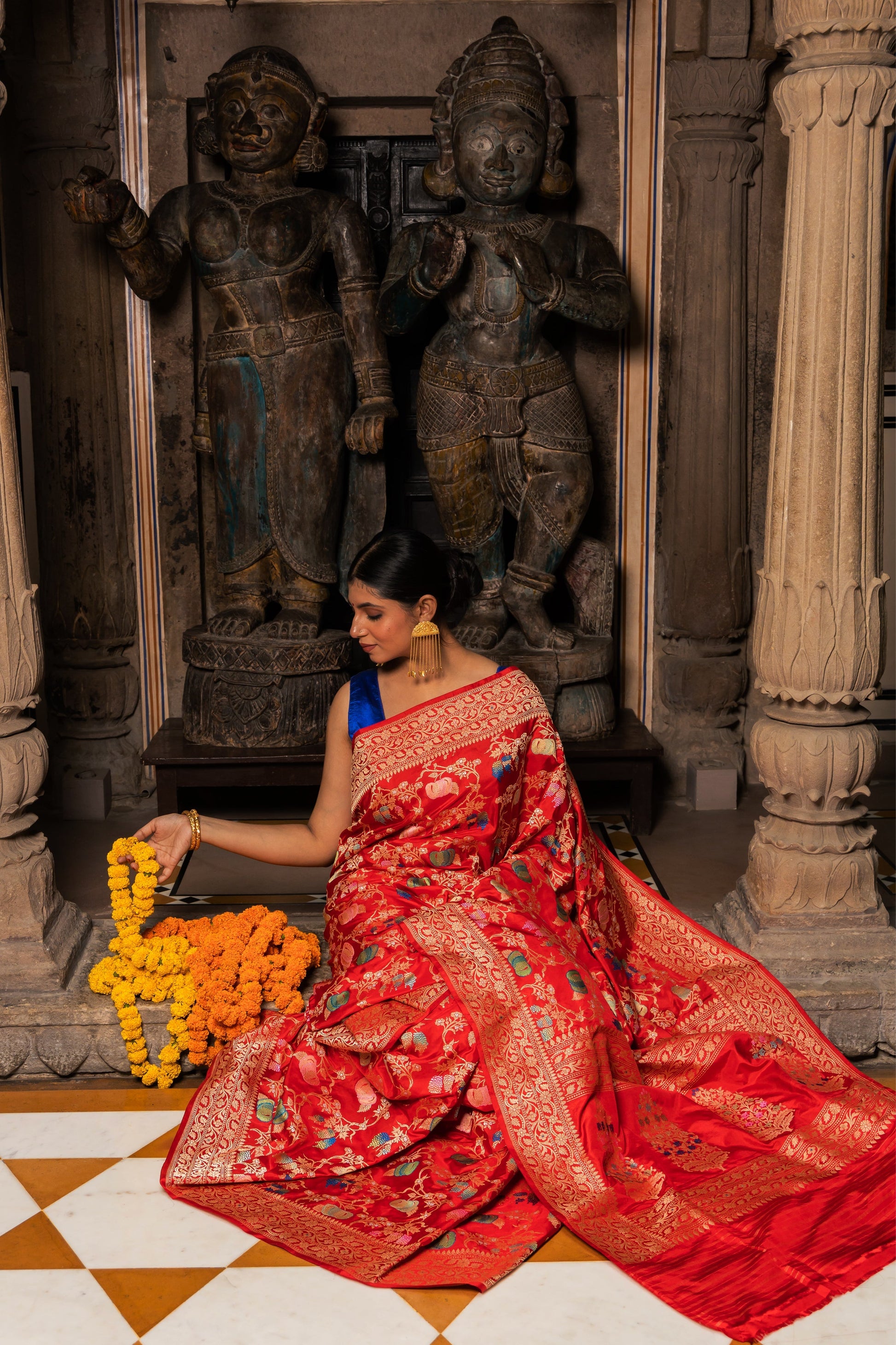 This Red Handwoven Kadwa Katan Silk Saree, with its captivating Aangoori design and multi-color heavy meena work, is a testament to the rich traditions of Banaras. It offers a perfect balance of opulence and comfort, making it an ideal choice for special occasions and a celebration of Indian textile heritage and sustainable fashion.