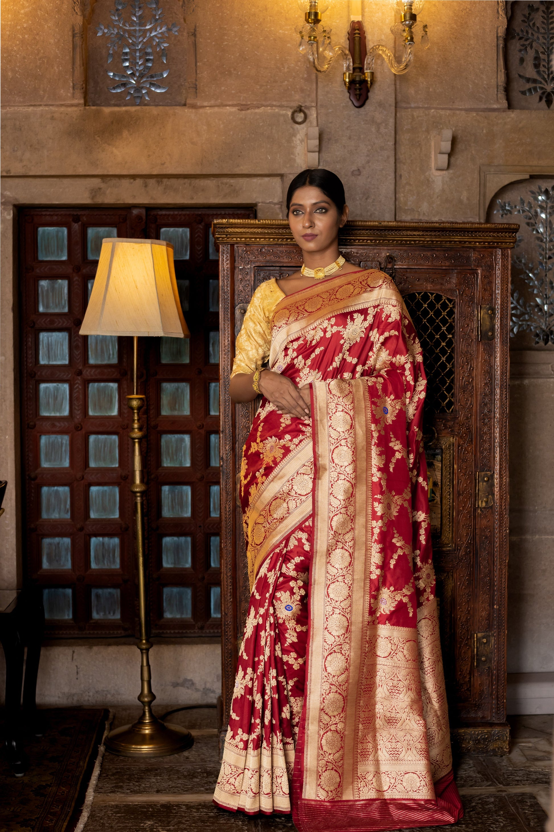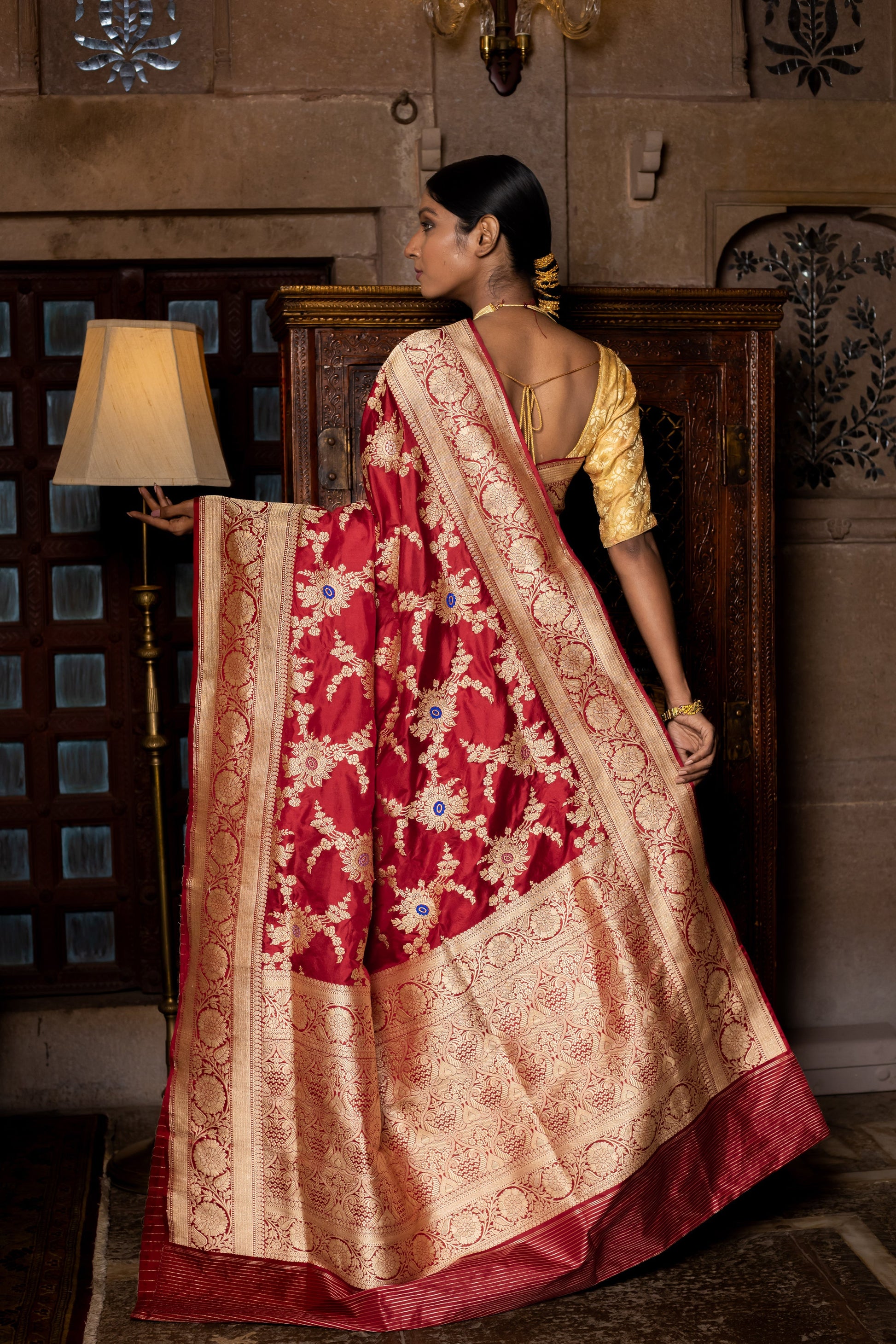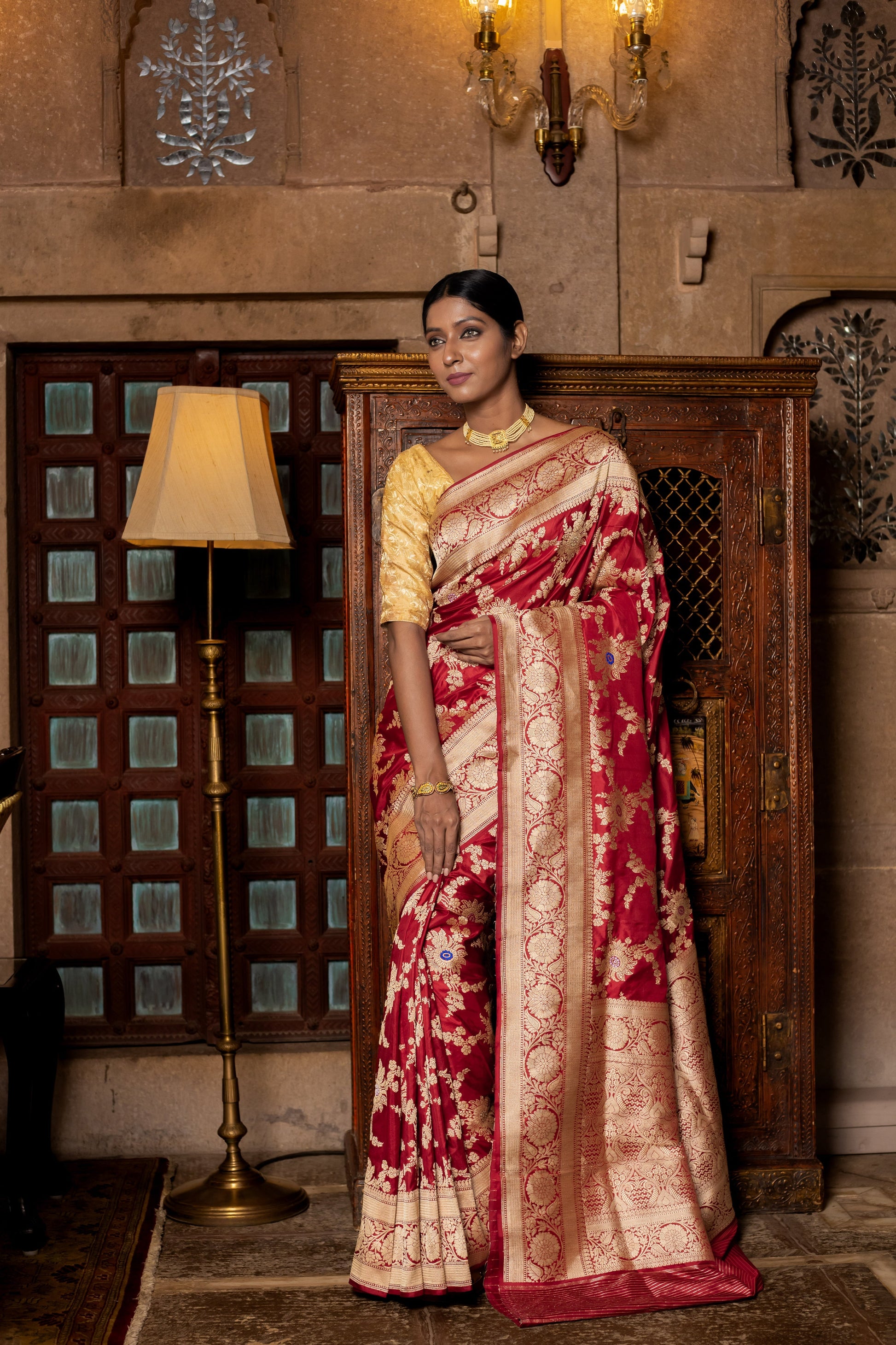 Product Description: The Red Handwoven Kadwa Katan Silk Saree features a modern Jaal design adorned with intricate gold zari and meena work. This elegant saree is a tribute to the age-old traditions of Banaras and showcases the artistry of handloom Banarasi weaving. It is a perfect blend of tradition and contemporary fashion, making it an ideal choice for those who appreciate the timeless beauty of Indian textiles.